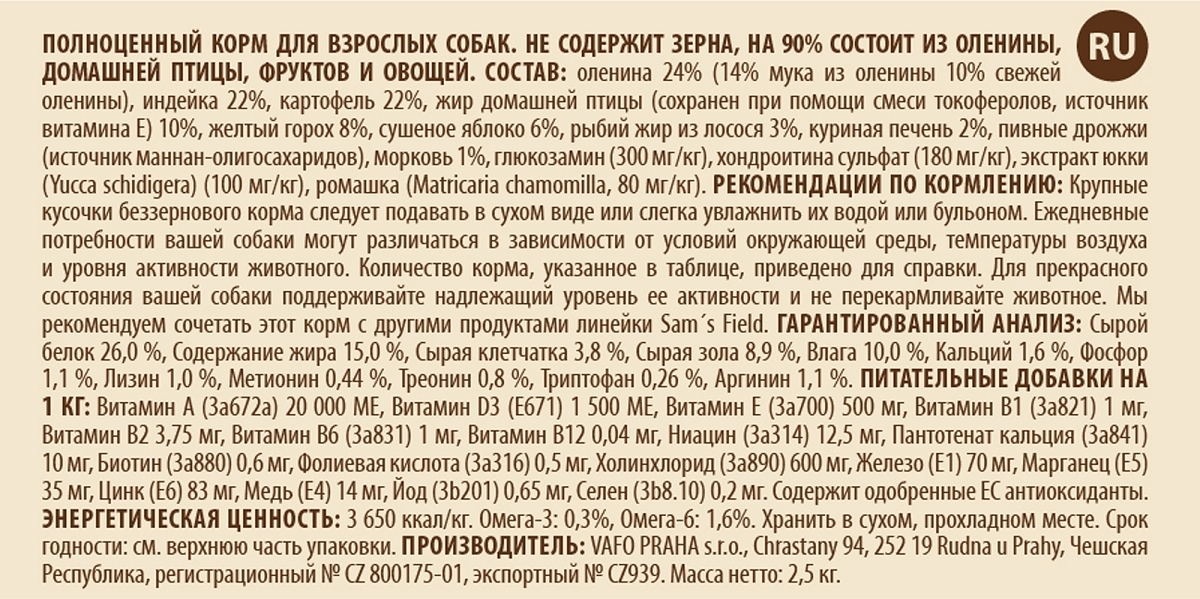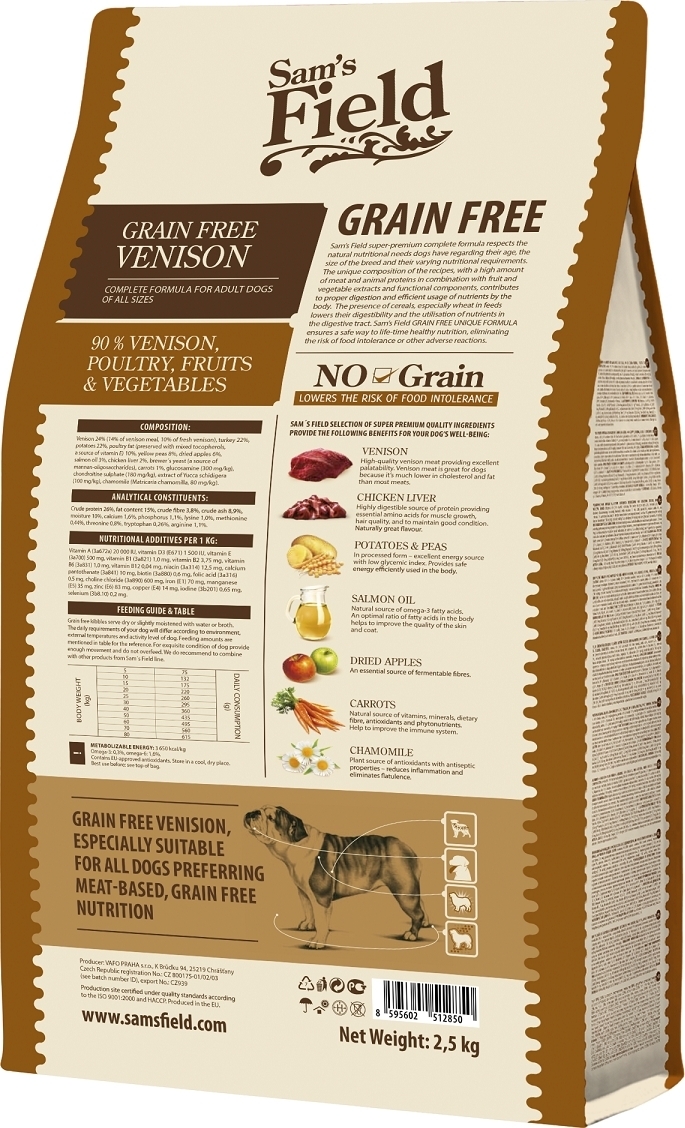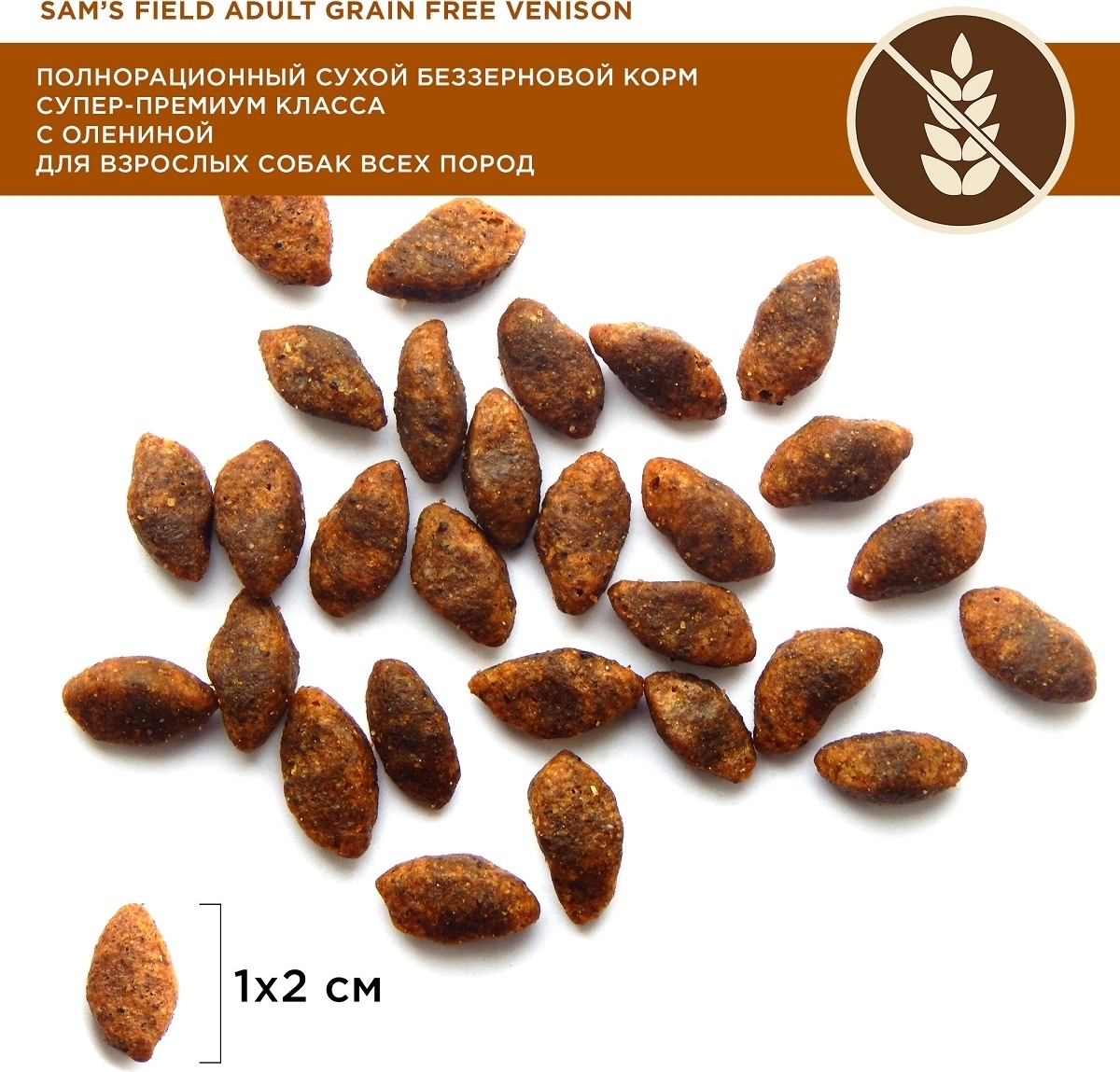 Корм сухой Sam´s Field беззерновой, для взрослых собак всех пород, с олениной, 2,5 кг