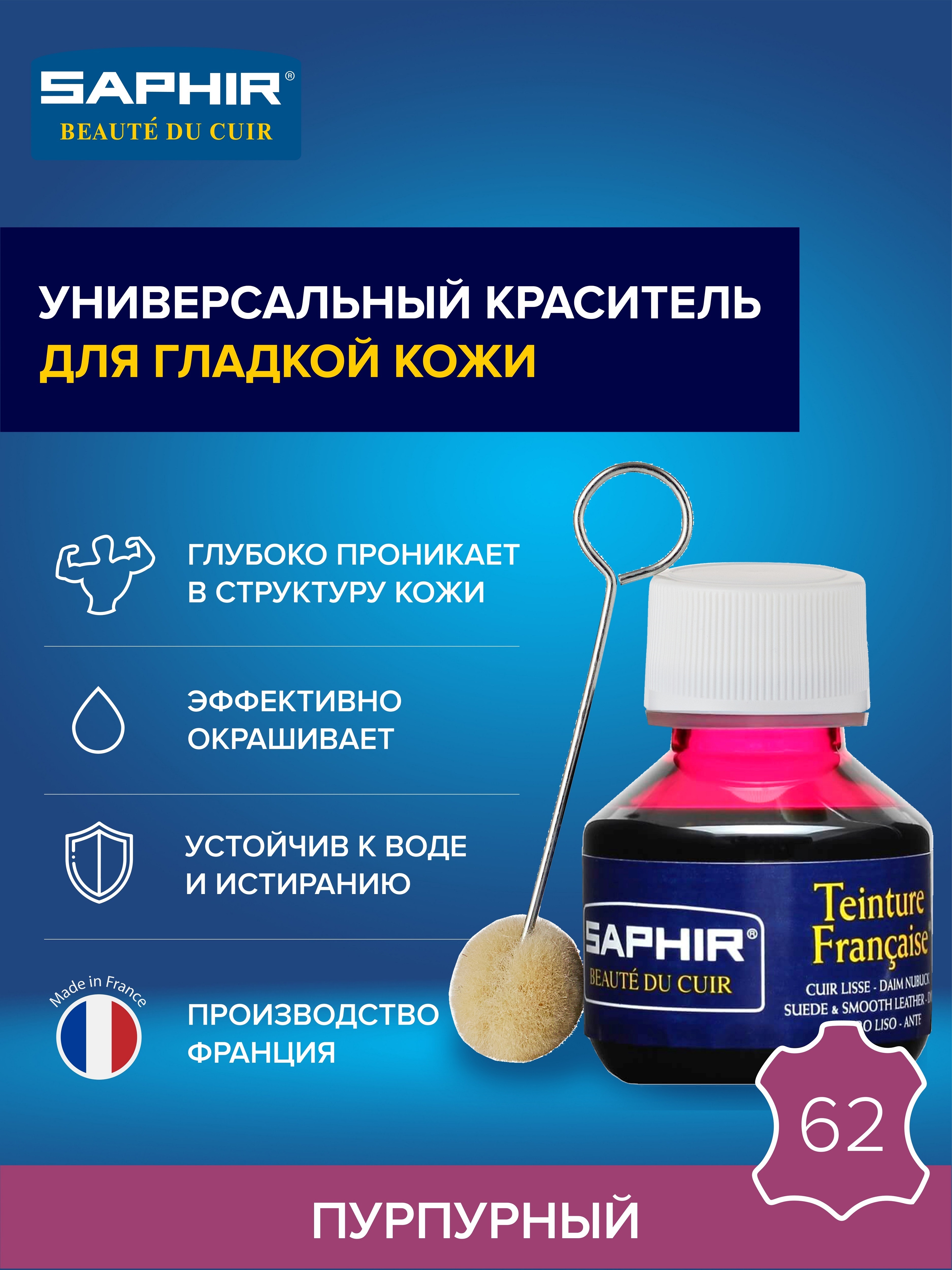 Краситель проникающий Teinture francaise, SAPHIR - 62, ПЛАСТИК, пурпурный 50мл. (pourpre)