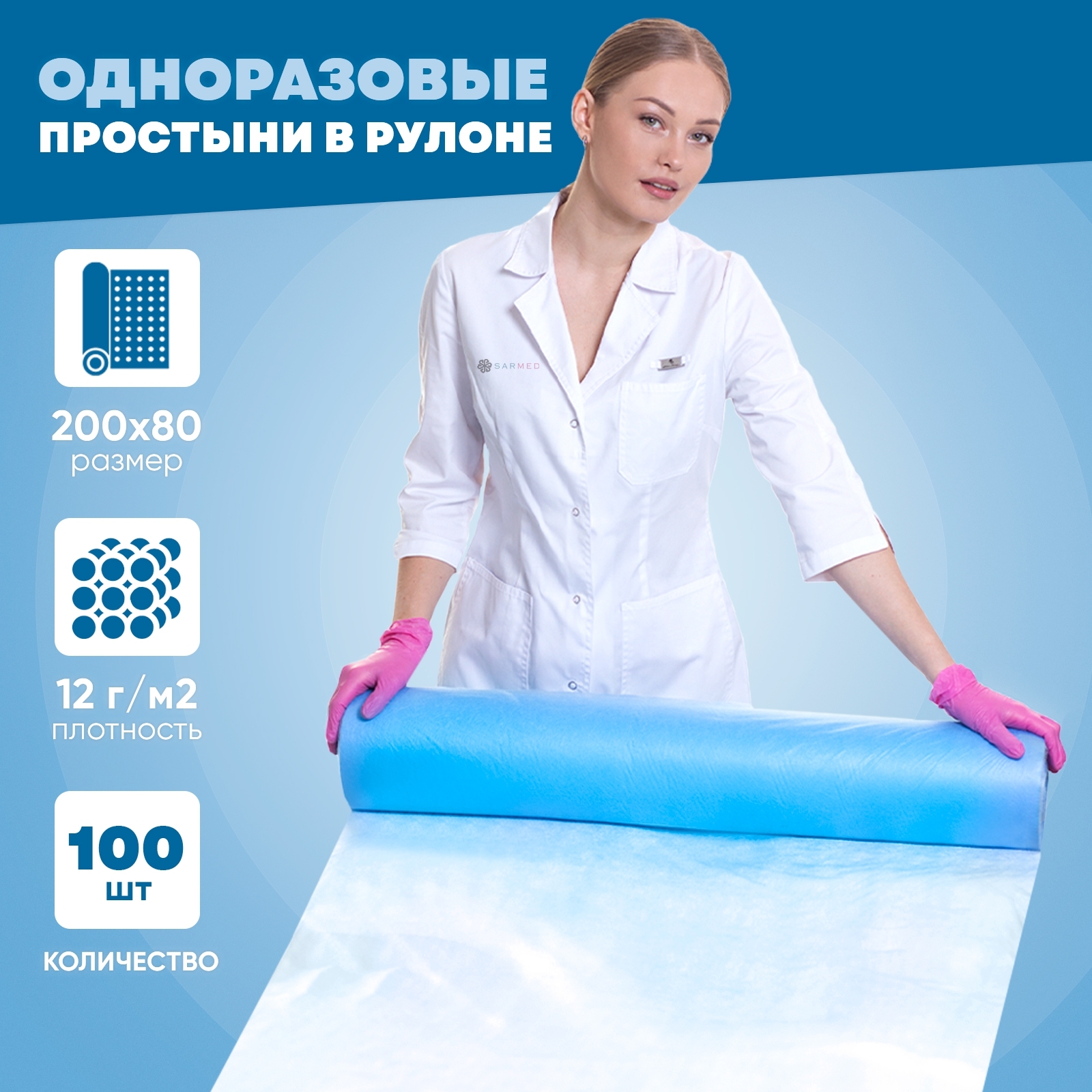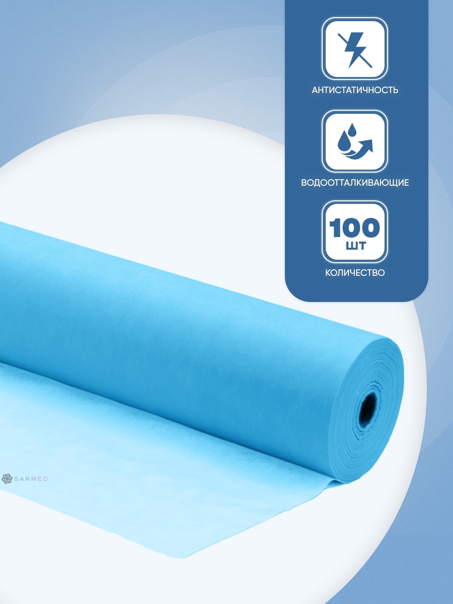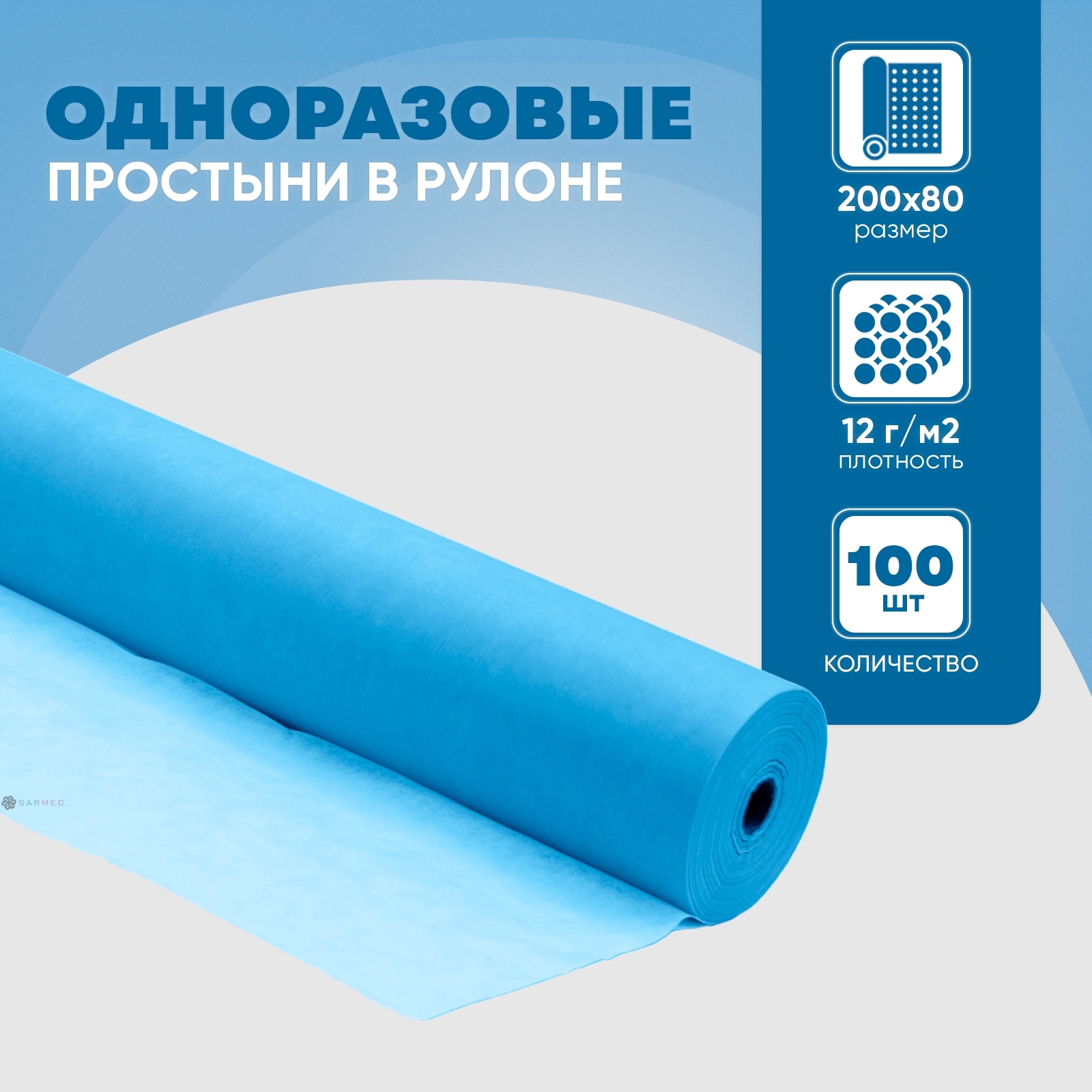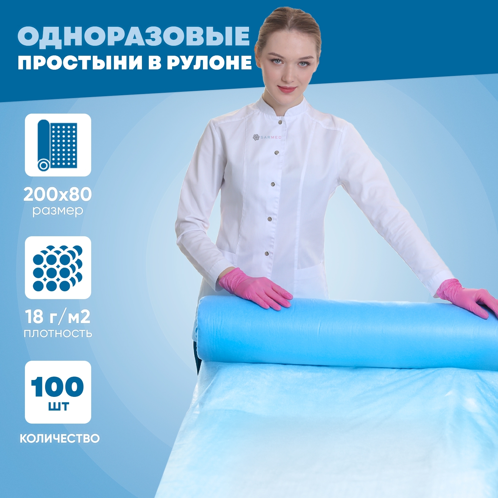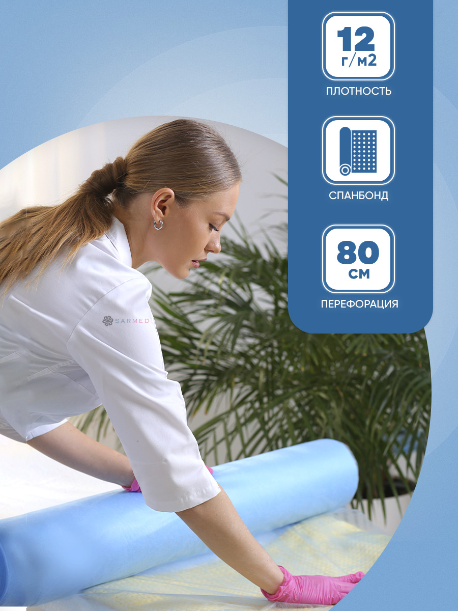 Простыня одноразовая SarMed Комфорт Рулон с перфорацией Спанбонд 18 г/м.кв Голубой 200х80 100 шт/, 80 x 200 см, 100 шт