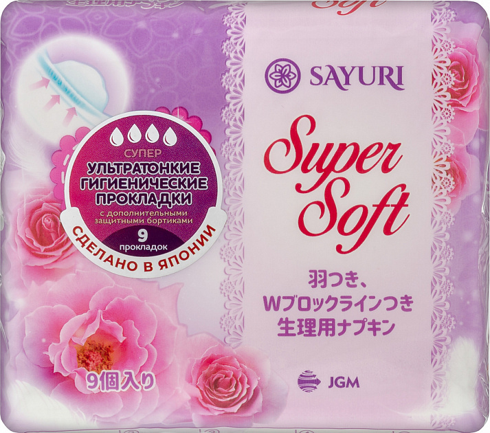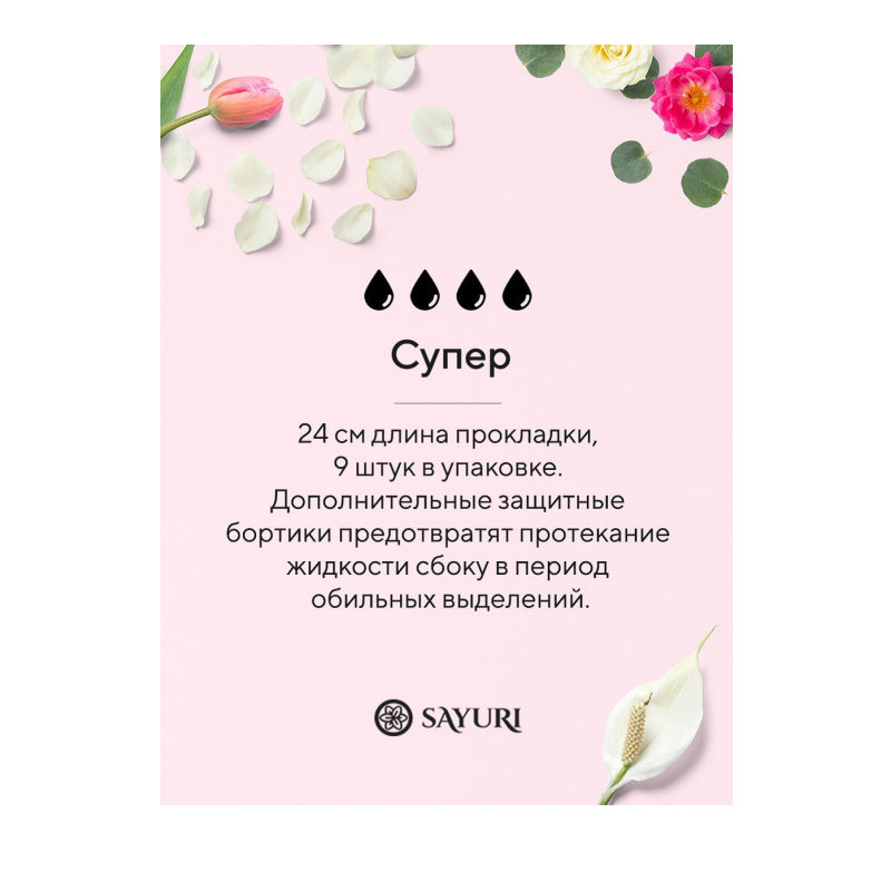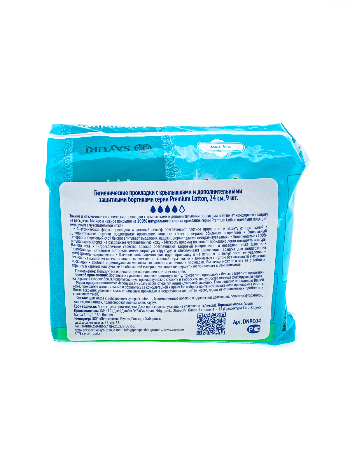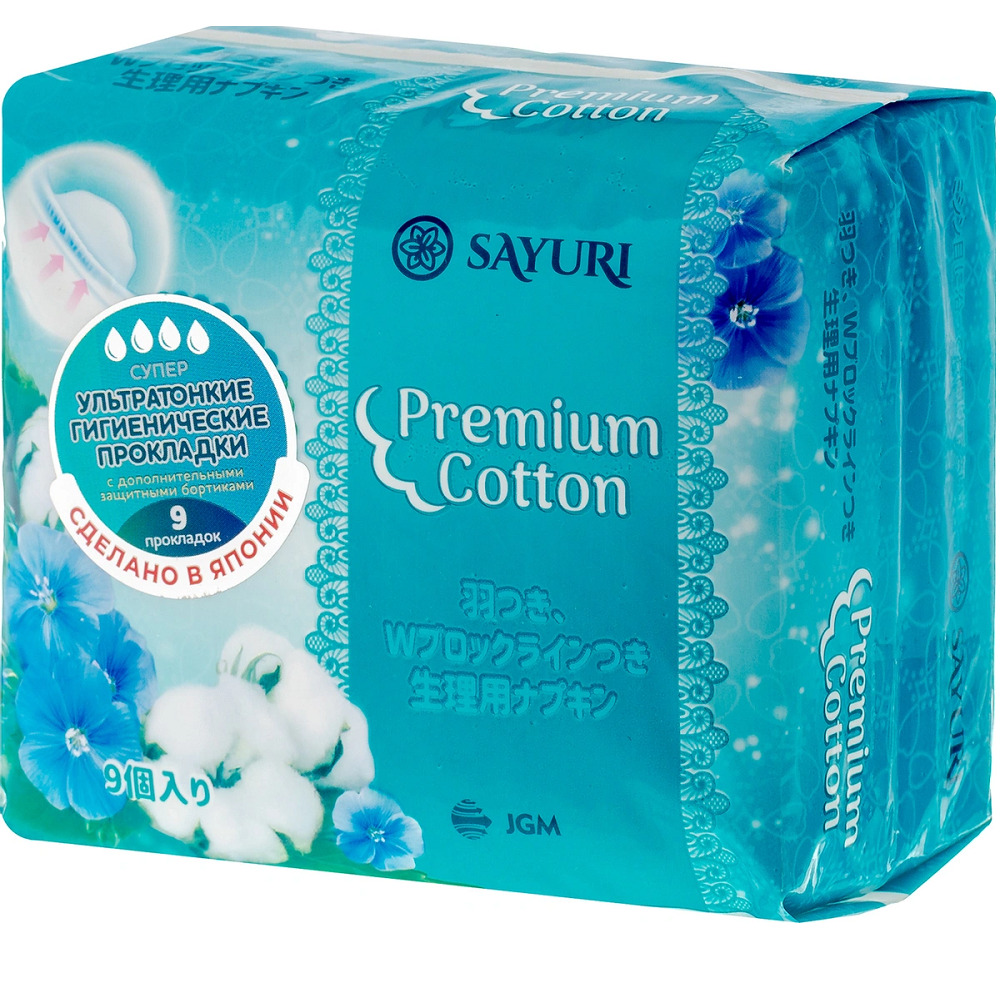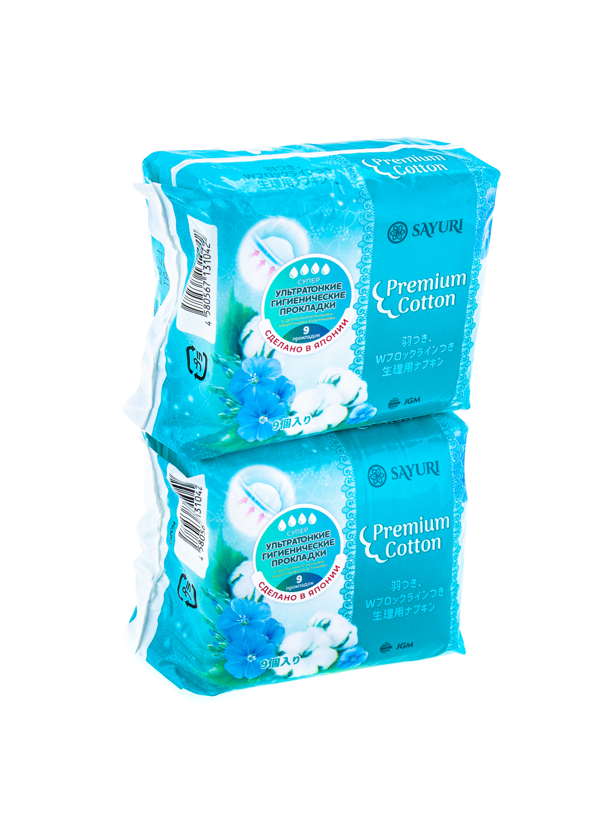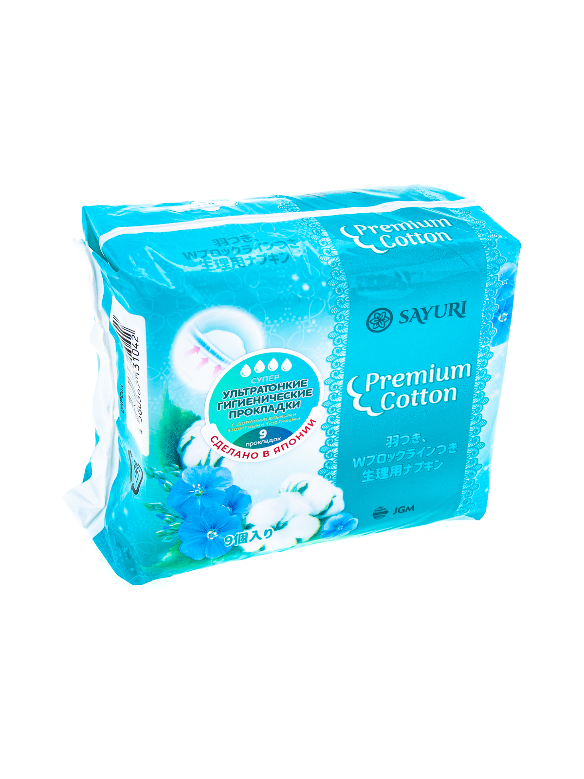 SAYURI Гигиенические прокладки Premium Cotton 100% хлопок, супер, 24 см, 9 шт/упак. (4 капли)