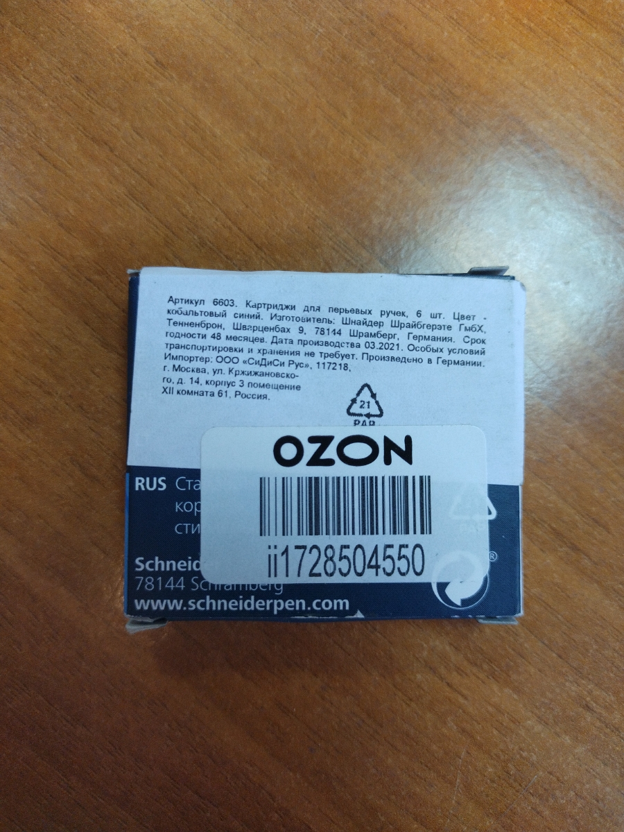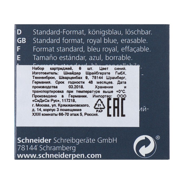 Картриджи чернильные Schneider кобальтовый синий, 6шт.