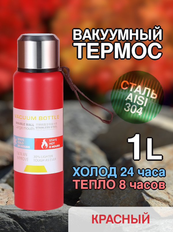 Термос 1 литр серебристый, вакуумный, стальной / Термос для чая и кофе с широким горлом