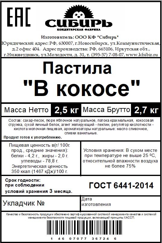 Пастила ванильная в кокосовой стружке, Кондитерская фабрика "Сибирь",