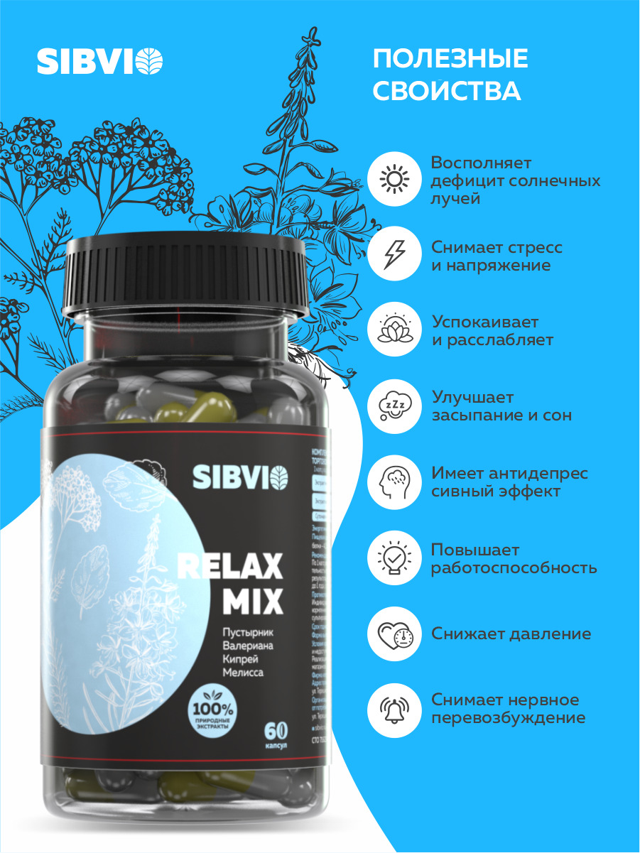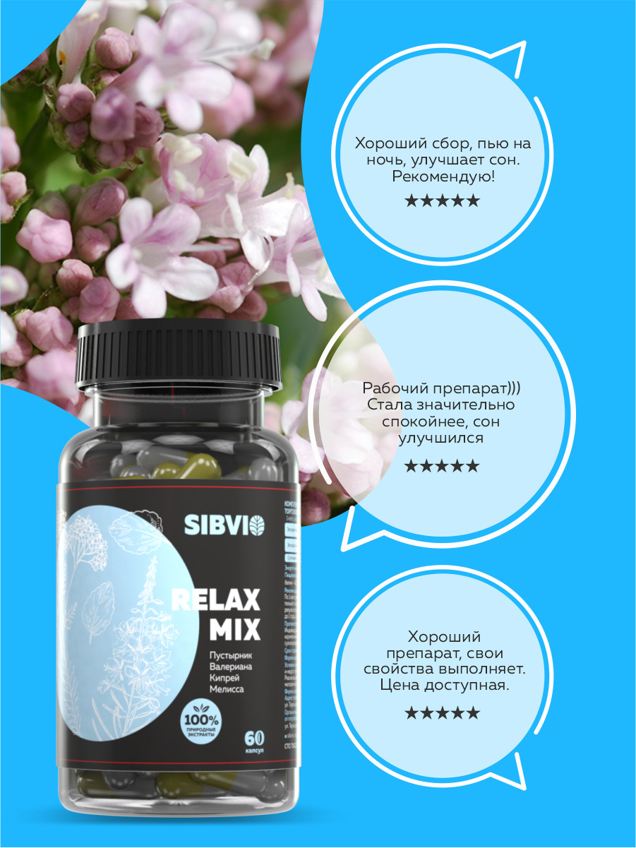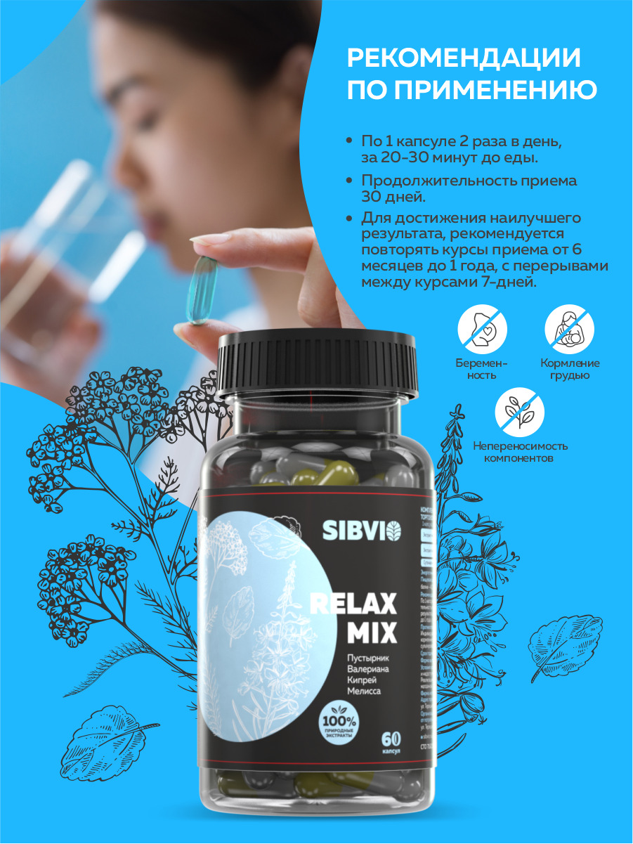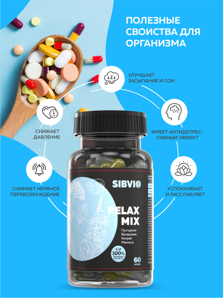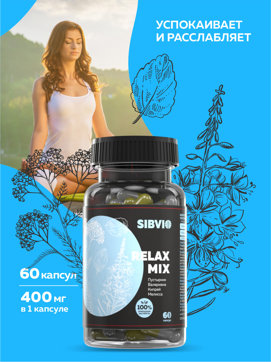 Relax Mix, комплекс растительных экстрактов для крепких нервов, антистресс, успокоительное, 60 капсул