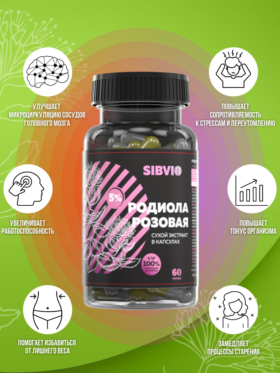 Родиола розовая (Золотой корень) 5 %. Экстракт корня, 60 капсул. Противовирусный препарат. Средство от стресса.