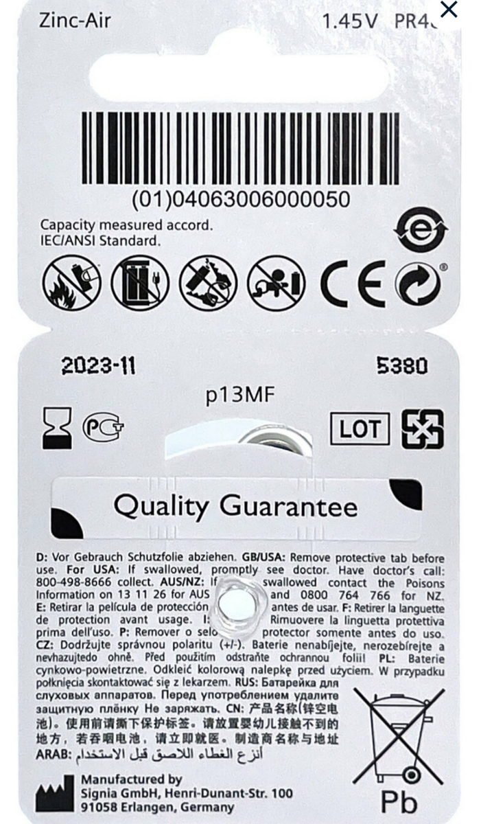 Батарейки для слуховых аппаратов Signia p13, 2 блистера (12 батареек)