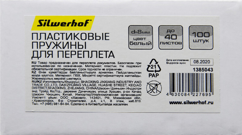 Пружины для переплета пластиковые Silwerhof 8мм 21-40лист A4 белый (100шт) (1373585)
