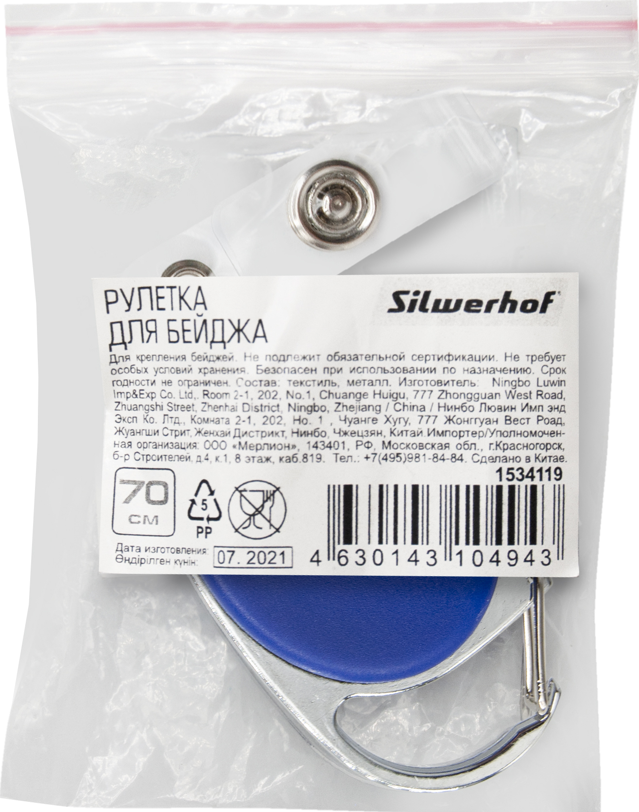 Рулетка для бейджа Silwerhof, защелкивающийся синий, 70 см