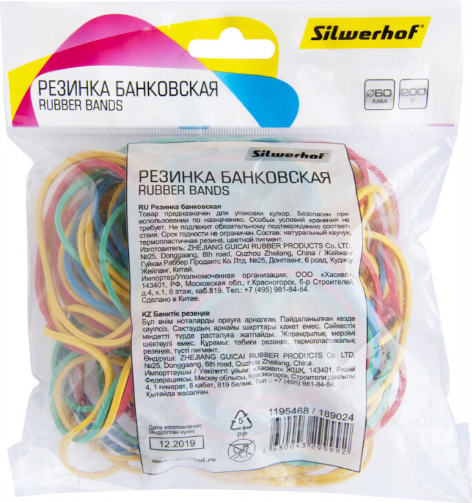 Резинки для купюр Silwerhof 189024 d 60мм 2мм 200гр ассорти пластиковый пакет - 10 уп
