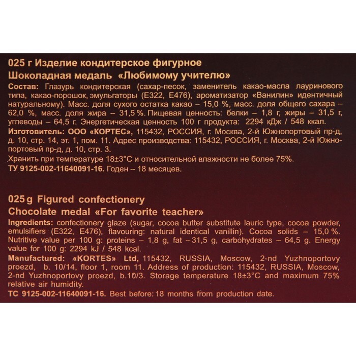 Шоколадная медаль Любимому учителю, 25 г