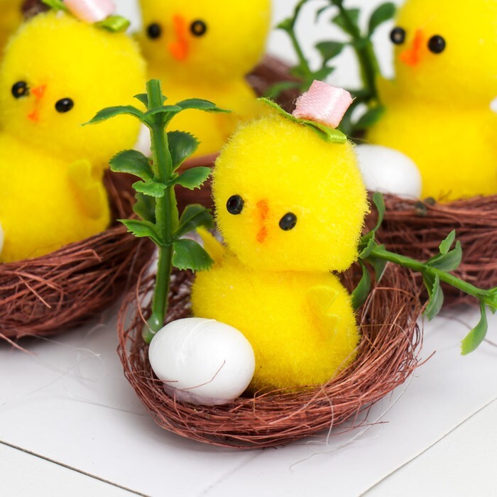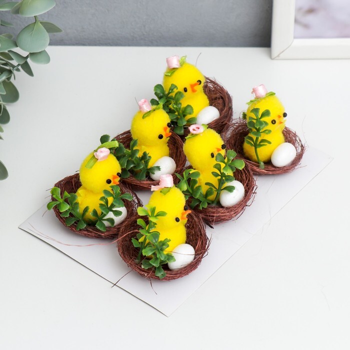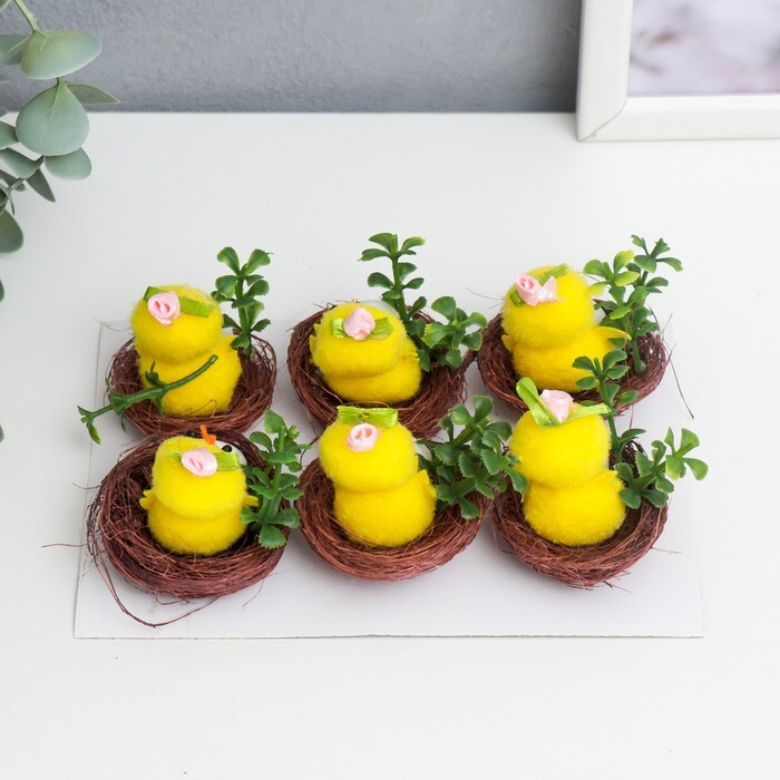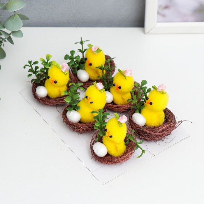 Сувенир пасхальный Цыплёнок с розой и яичком в гнезде с цветком набор 6 шт 3х4х4 см