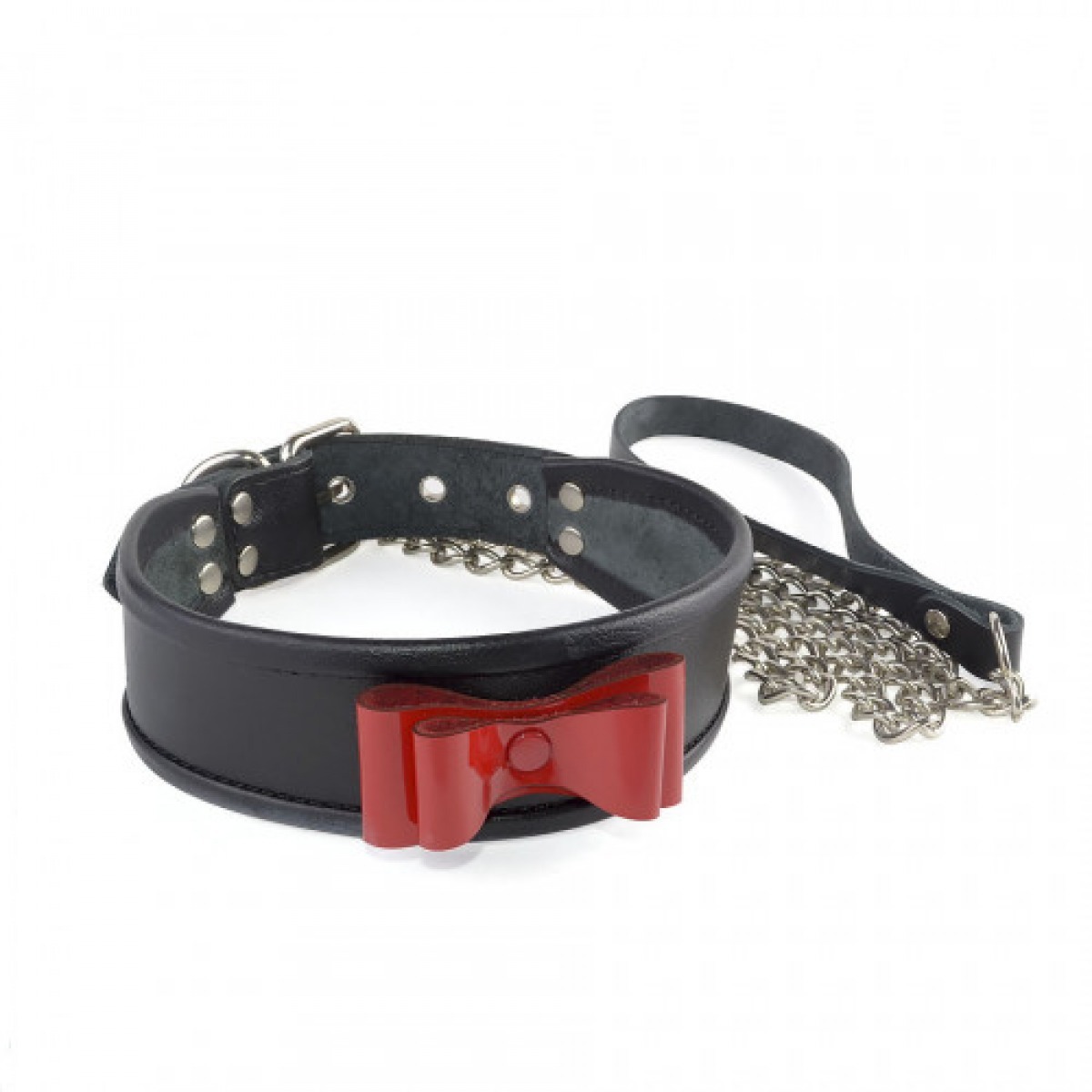 Черный ошейник с красным бантиком и поводком Fetish Factory