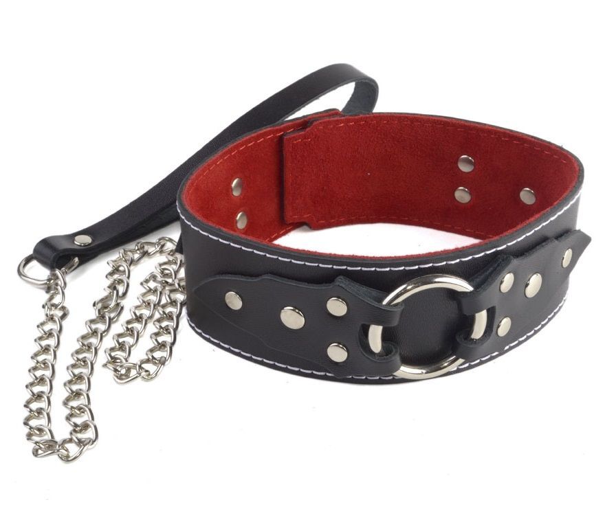 Чёрный кожаный ошейник с красной изнанкой и поводком