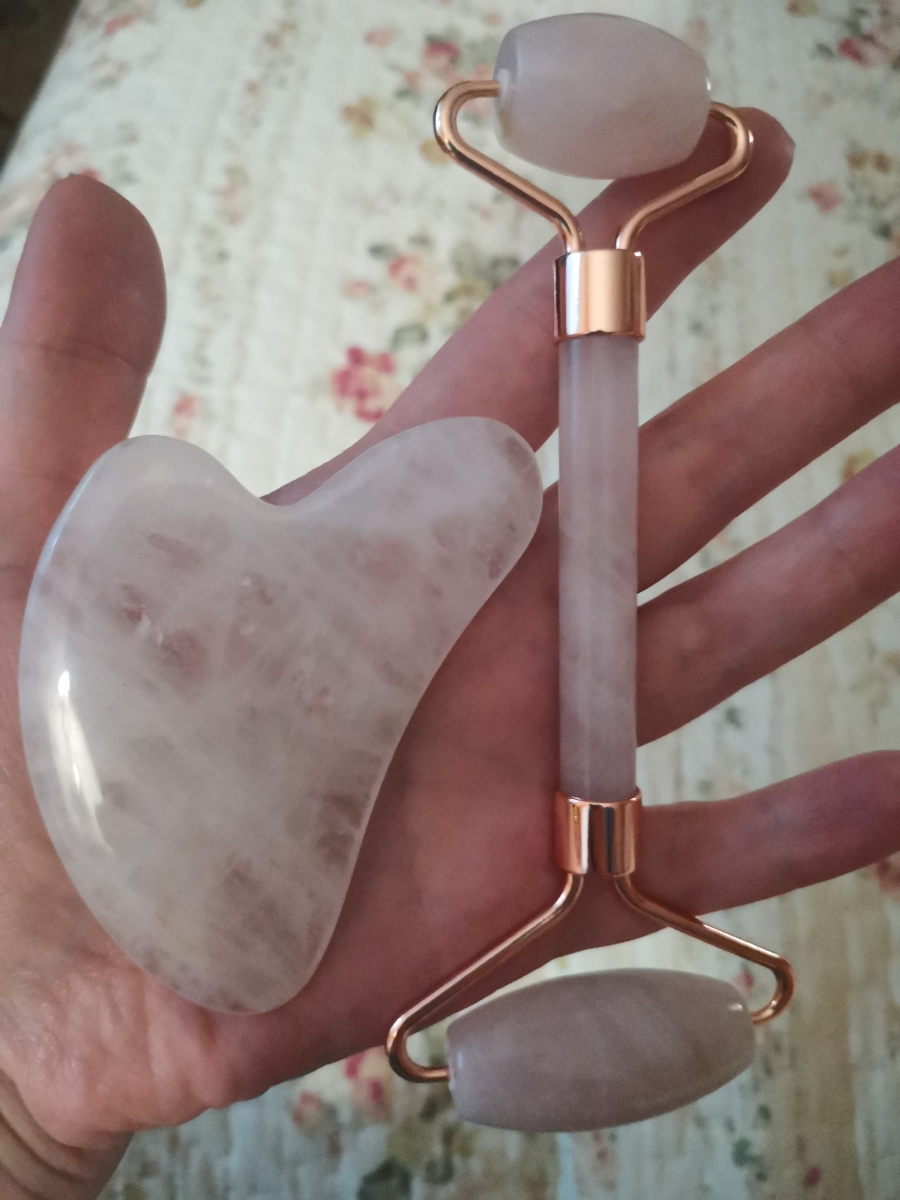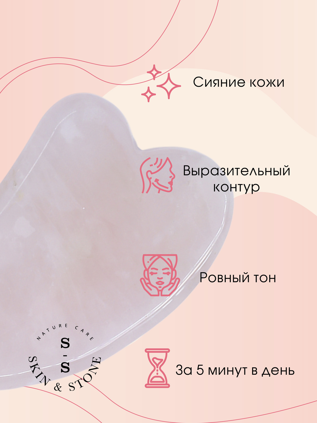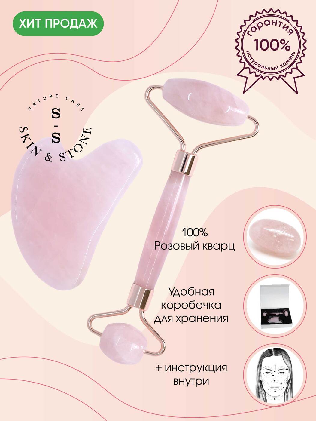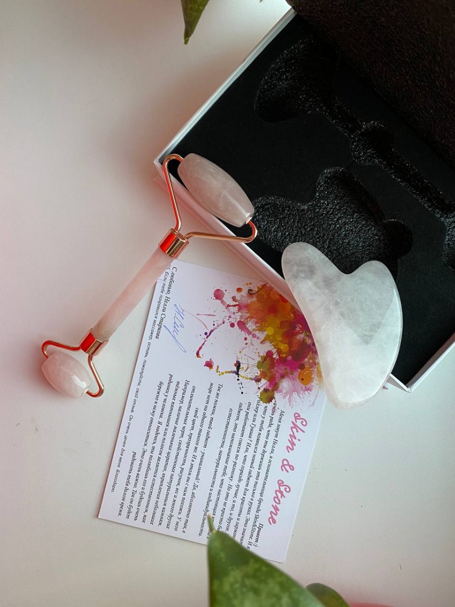 Набор Массажный роллер + Скребок гуаша из розового кварца/ Skin & Stone / Набор гуаша/ Скребки гуаша/