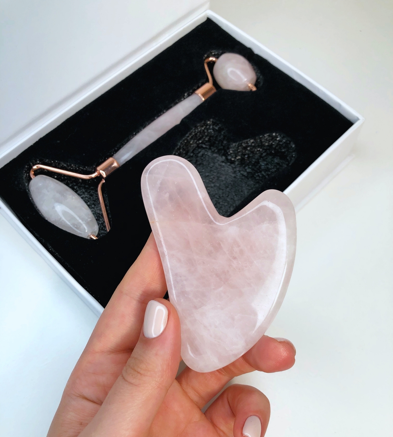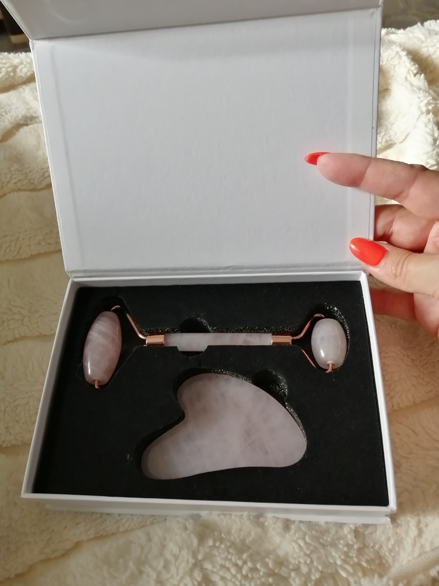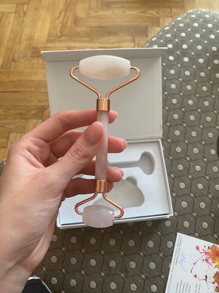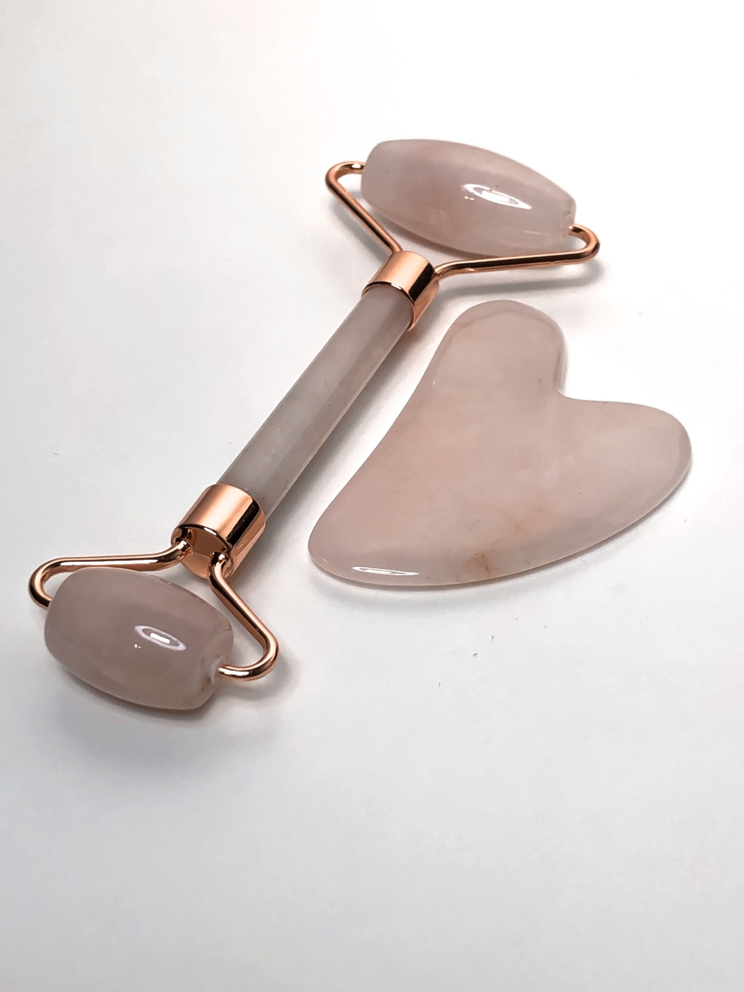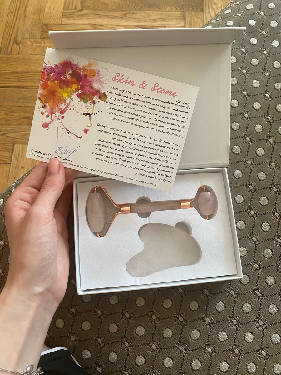 Набор Массажный роллер + Скребок гуаша из розового кварца/ Skin & Stone / Набор гуаша/ Скребки гуаша/