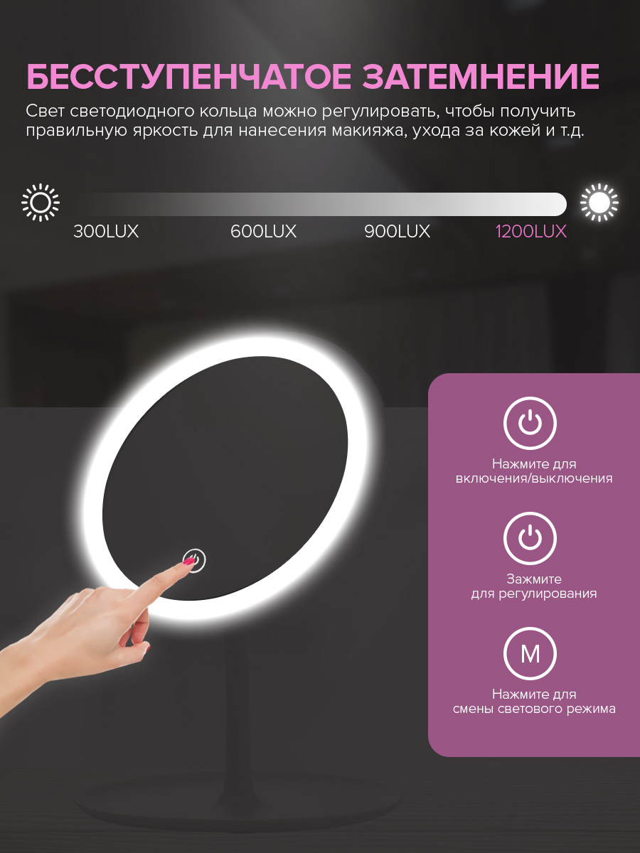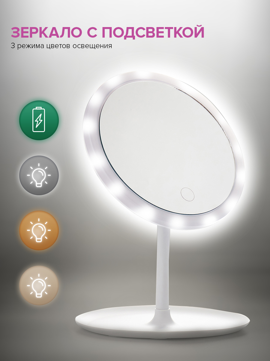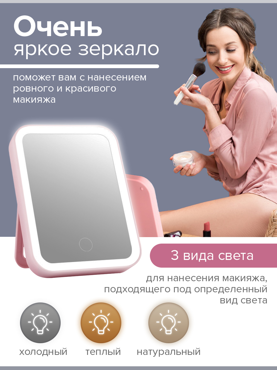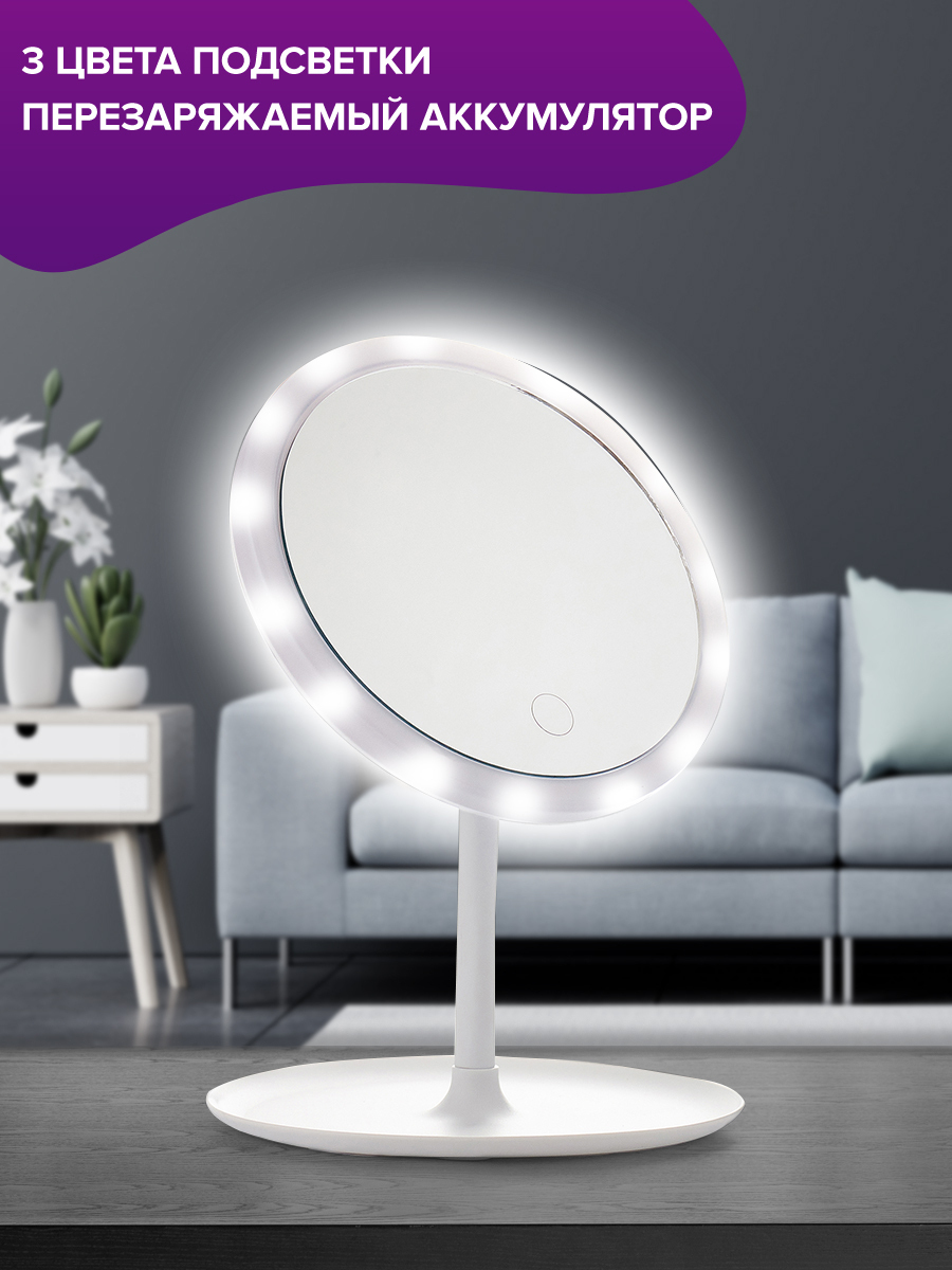 Настольное LED зеркало для макияжа / 3 вида подсветки / с лампами / для ванной / дома / спальни
