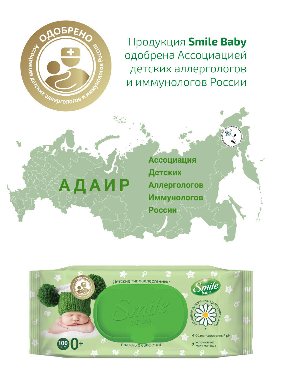 Smile Влажные салфетки детские 900 шт, (9Х100) с ромашкой и алоэ, с клапаном.