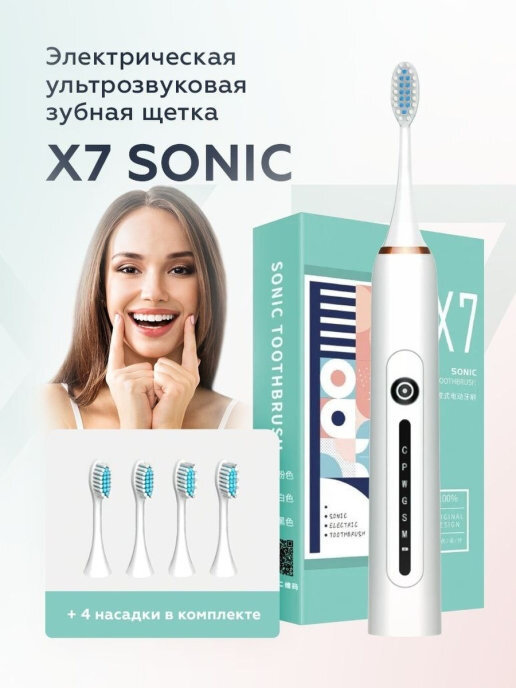 Электрическая зубная щетка, Sonic Toothbrush X-7, взрослая, детская. Зубная щетка электрическая, 4 насадки, белый