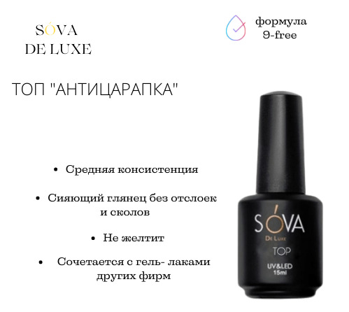 Sova De Luxe Top Верхнее финишное покрытие, топ для гель-лака без липкого слоя, 15 мл