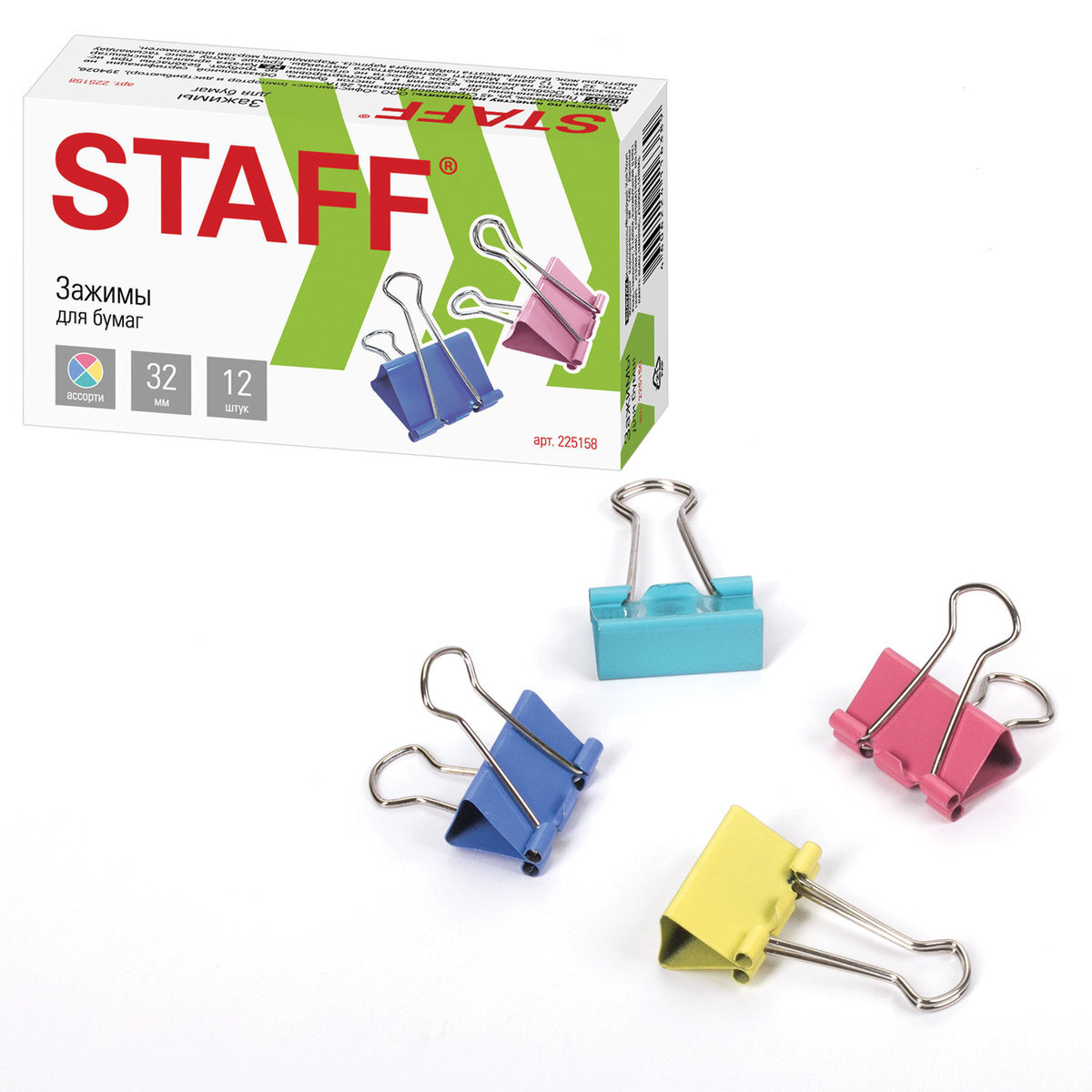 Зажимы для бумаг Staff, комплект 12 штук, 32 мм, на 140 листов, цветные, картонная коробка, 225158