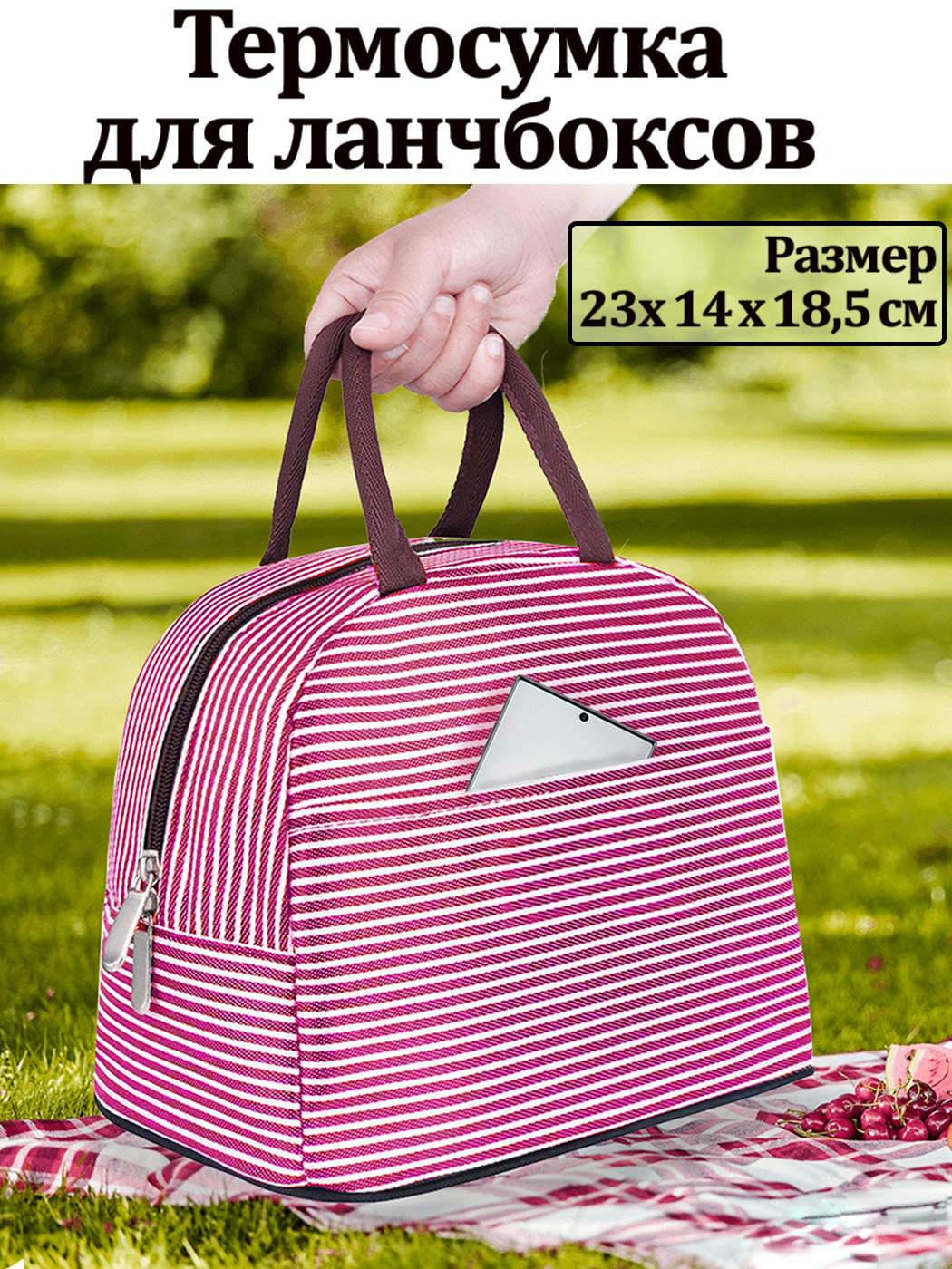 Термосумка для ланчбоксов с карманом (розовая полоска)/ Сумка-холодильник/ Сумка для путешествий