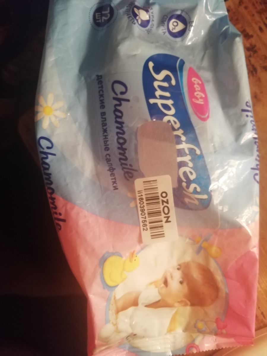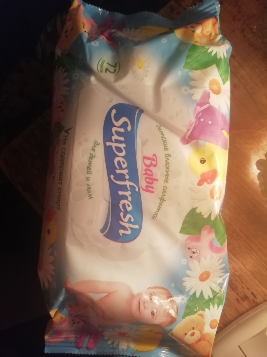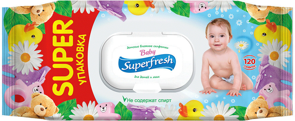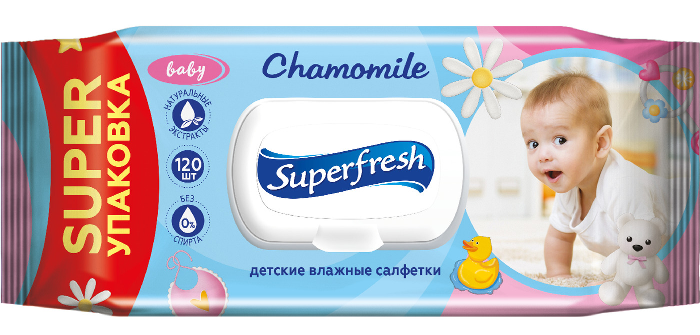 SuperFresh Детские влажные салфетки с ромашкой и витамином E, 120 шт., с клапаном.