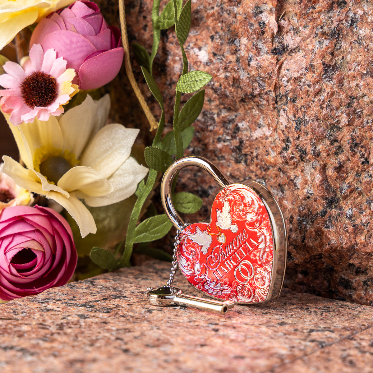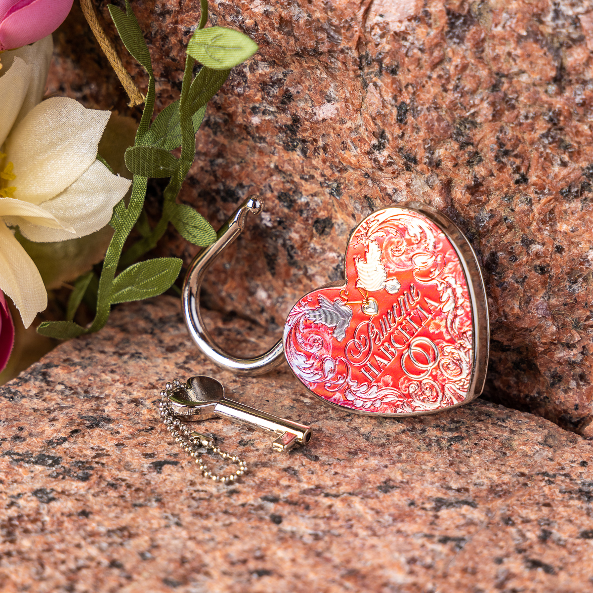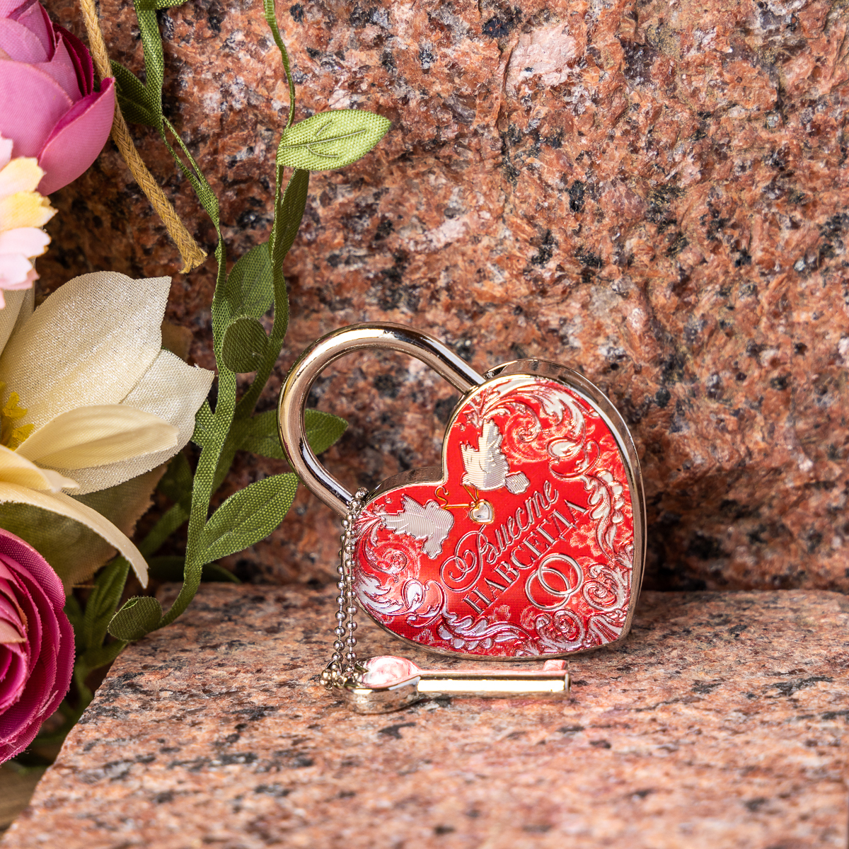 Замок любви красный "Вместе навсегда" в форме сердца с голубями, кольцами и узорами