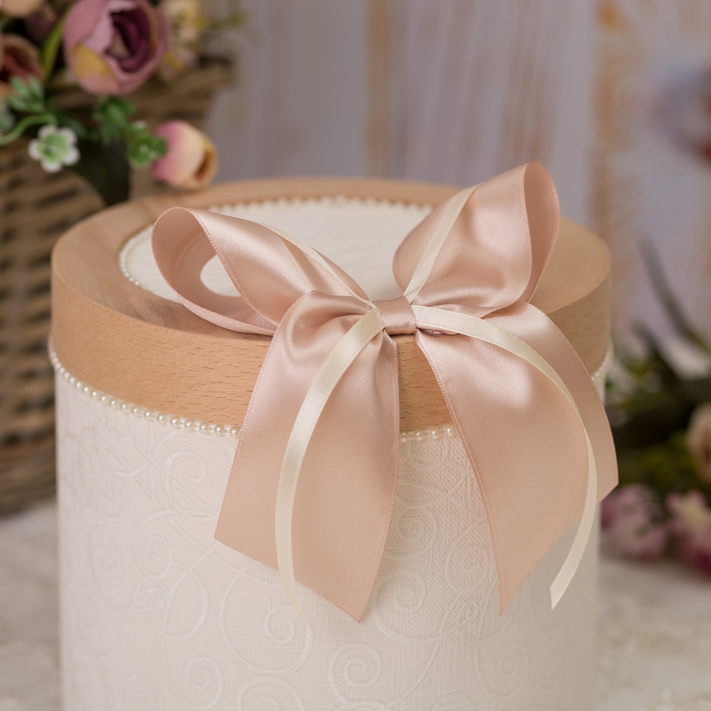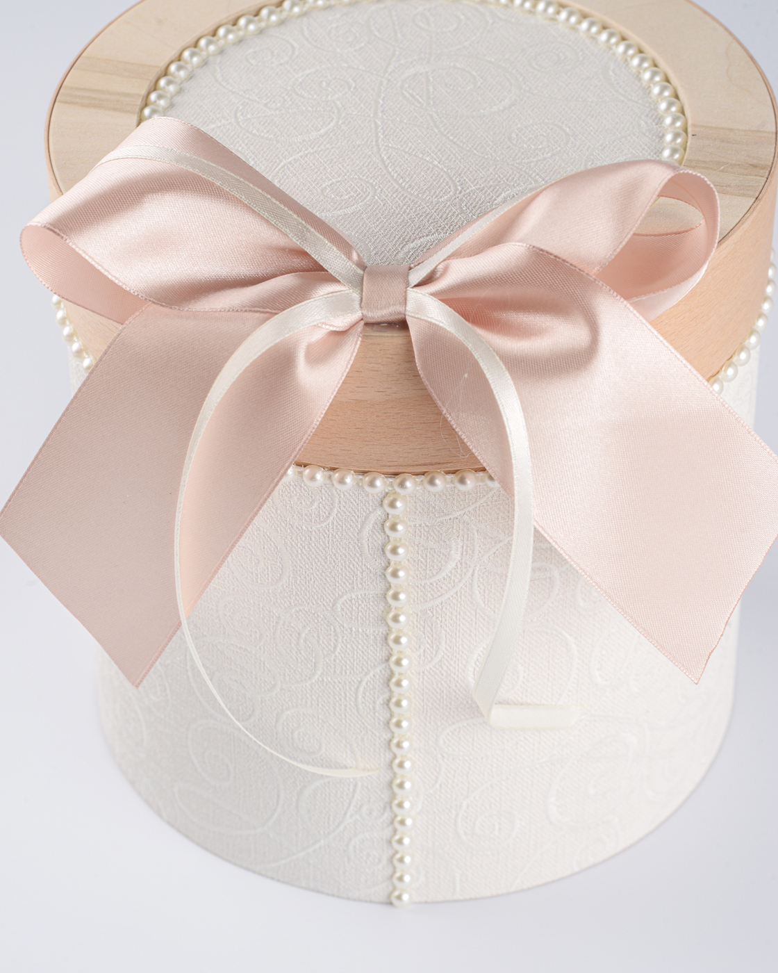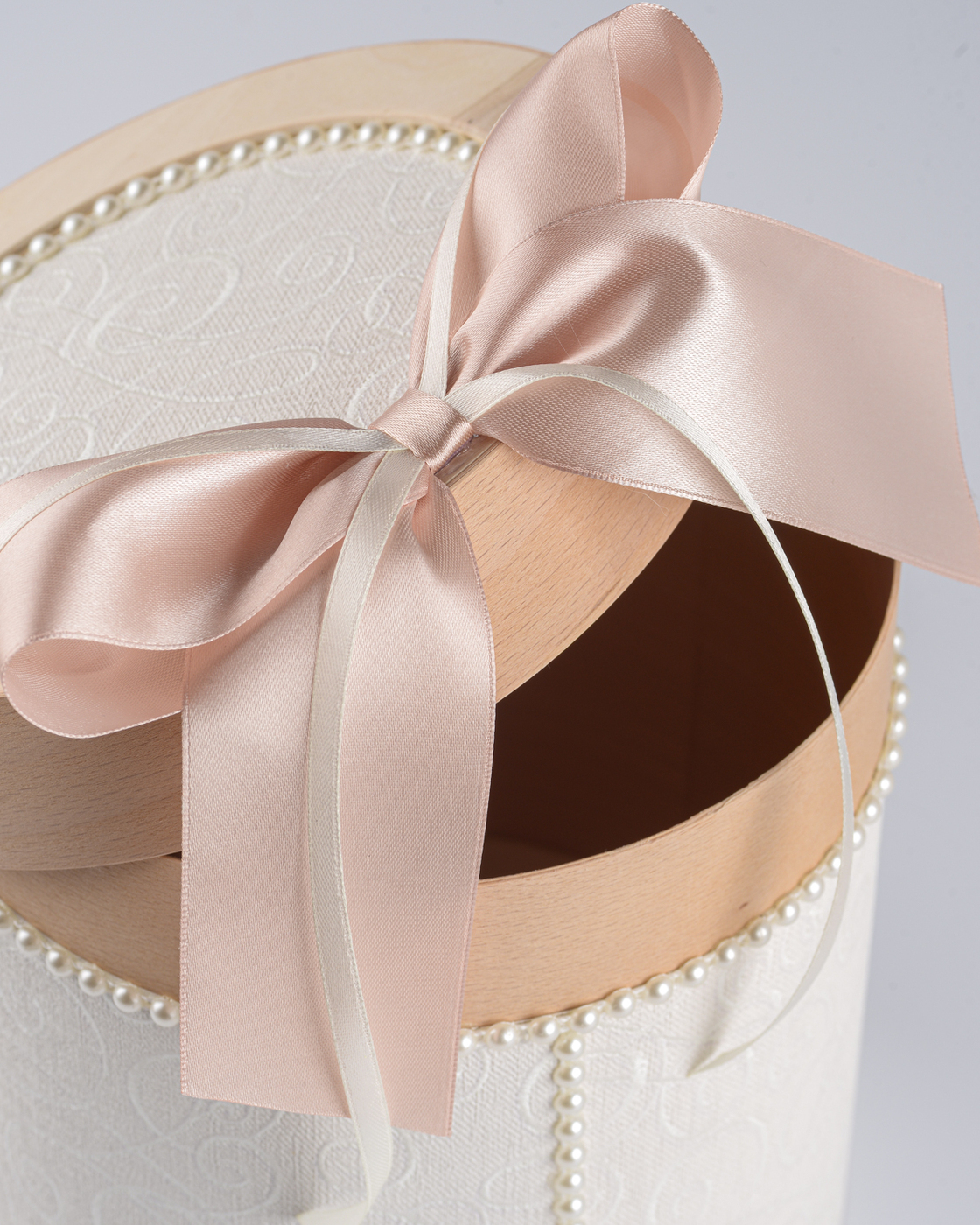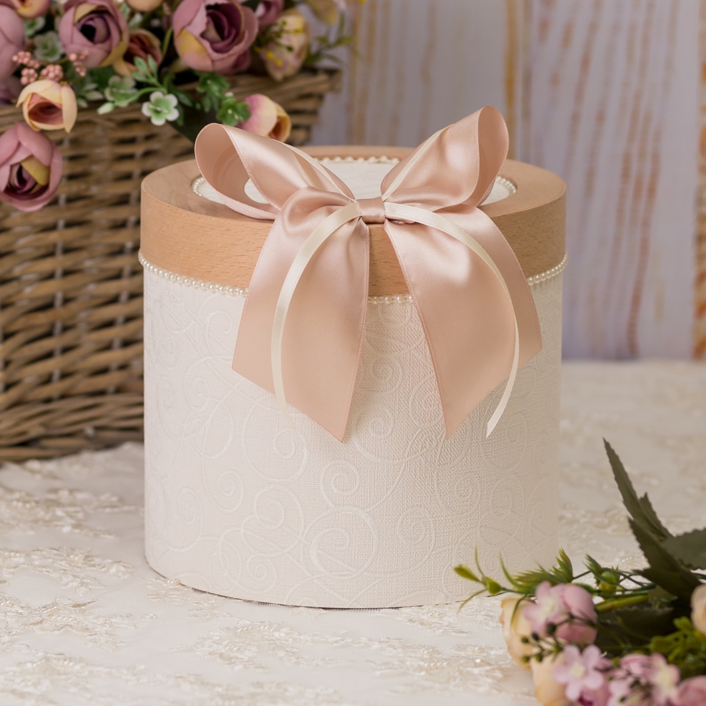 Коробка для подарков на свадьбу в виде тубуса с прорезью и фактурным декором айвори, атласным бантом кремового цвета, жемчужными бусинами