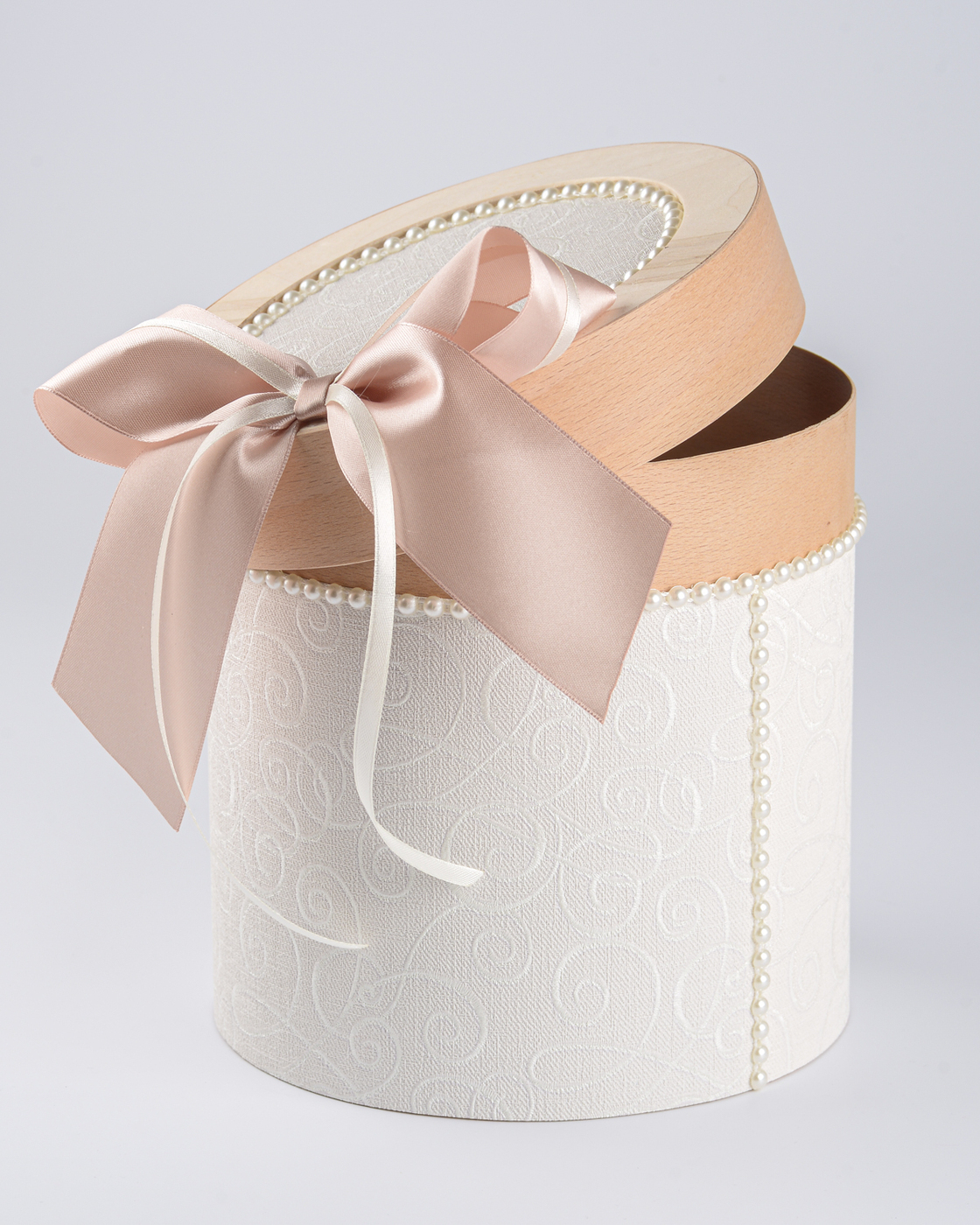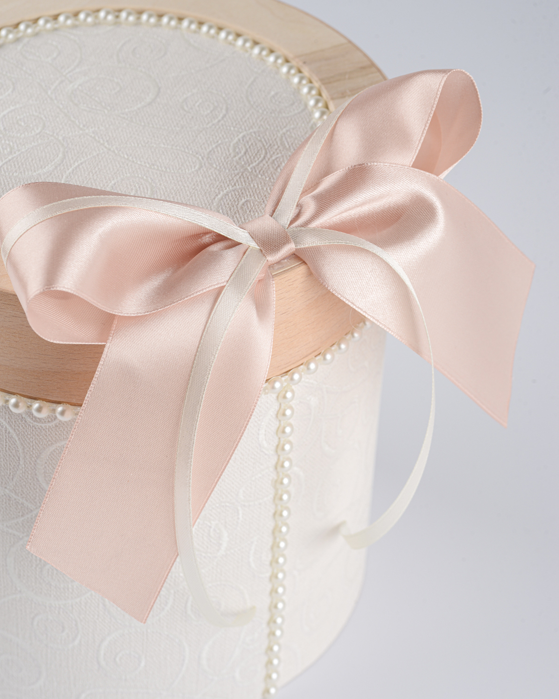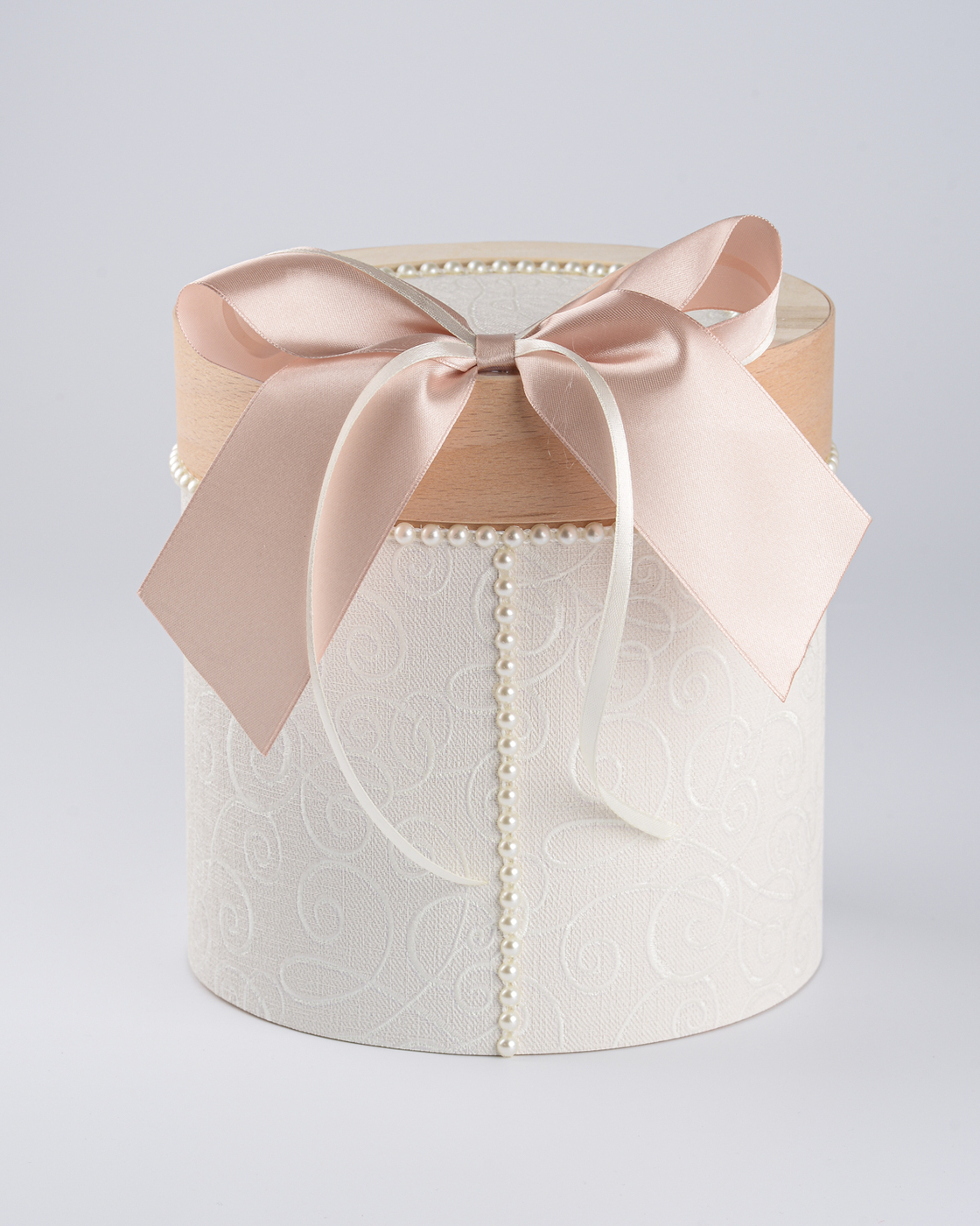 Коробка для подарков на свадьбу в виде тубуса с прорезью и фактурным декором айвори, атласным бантом кремового цвета, жемчужными бусинами