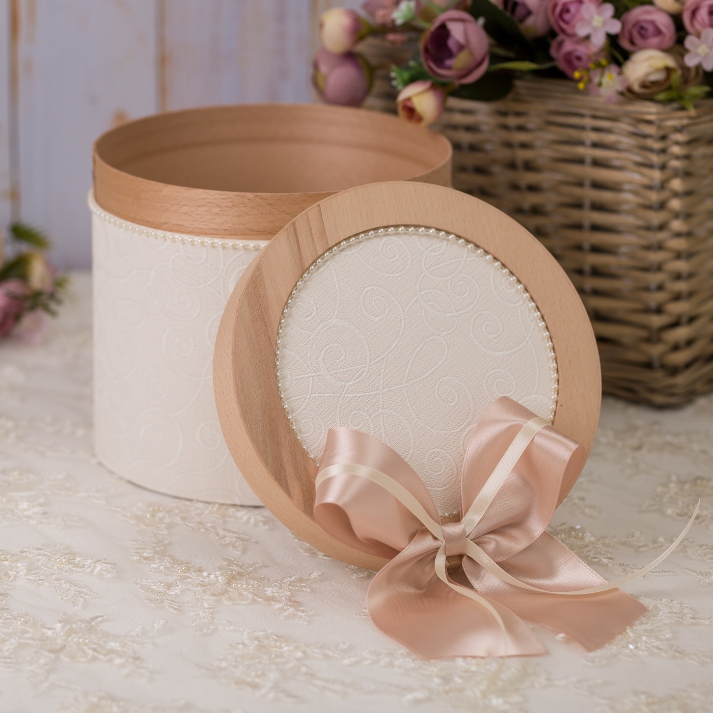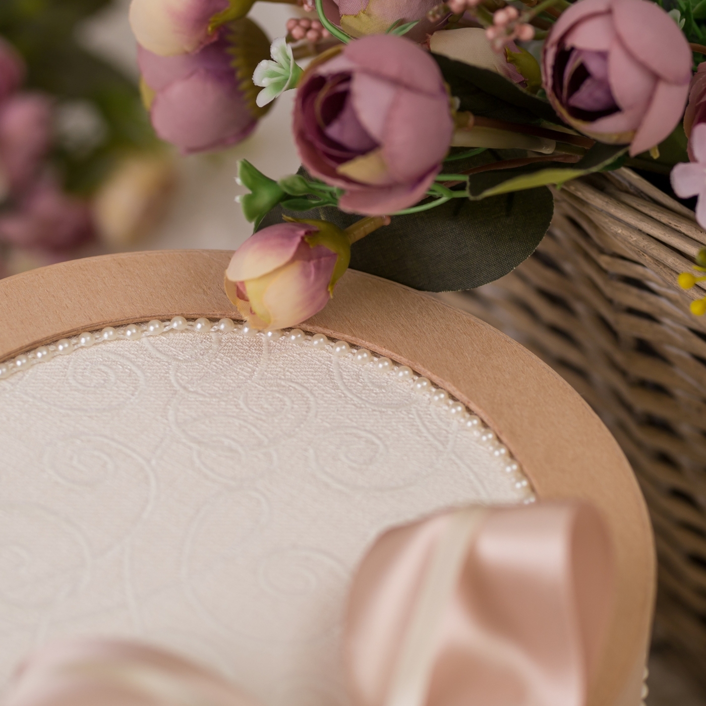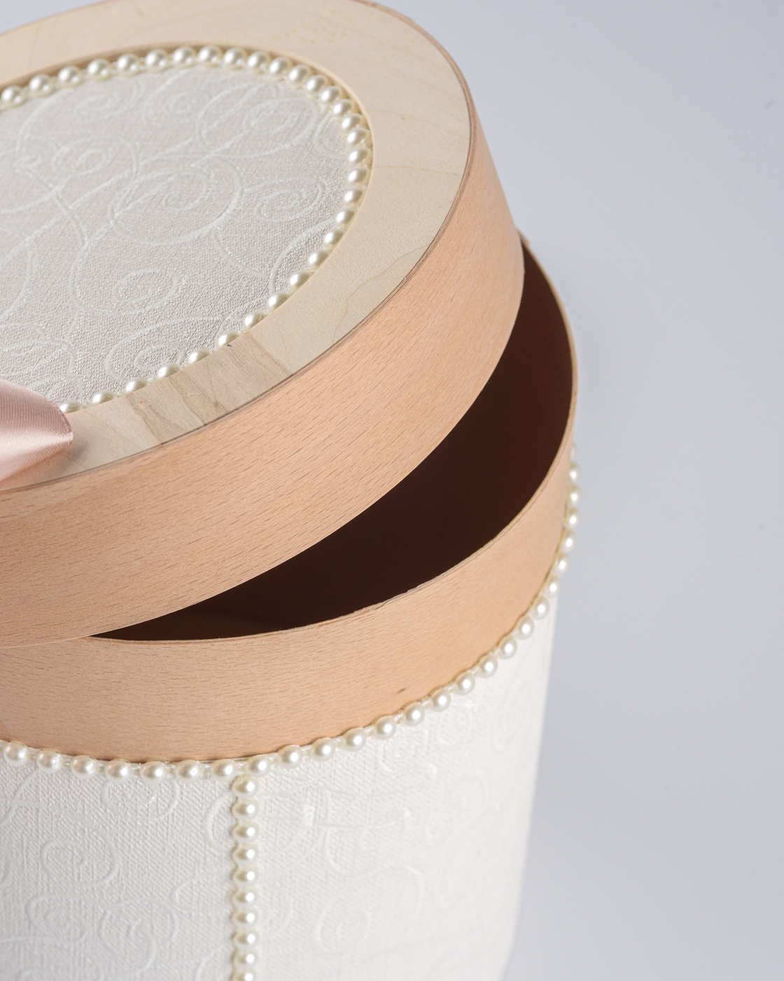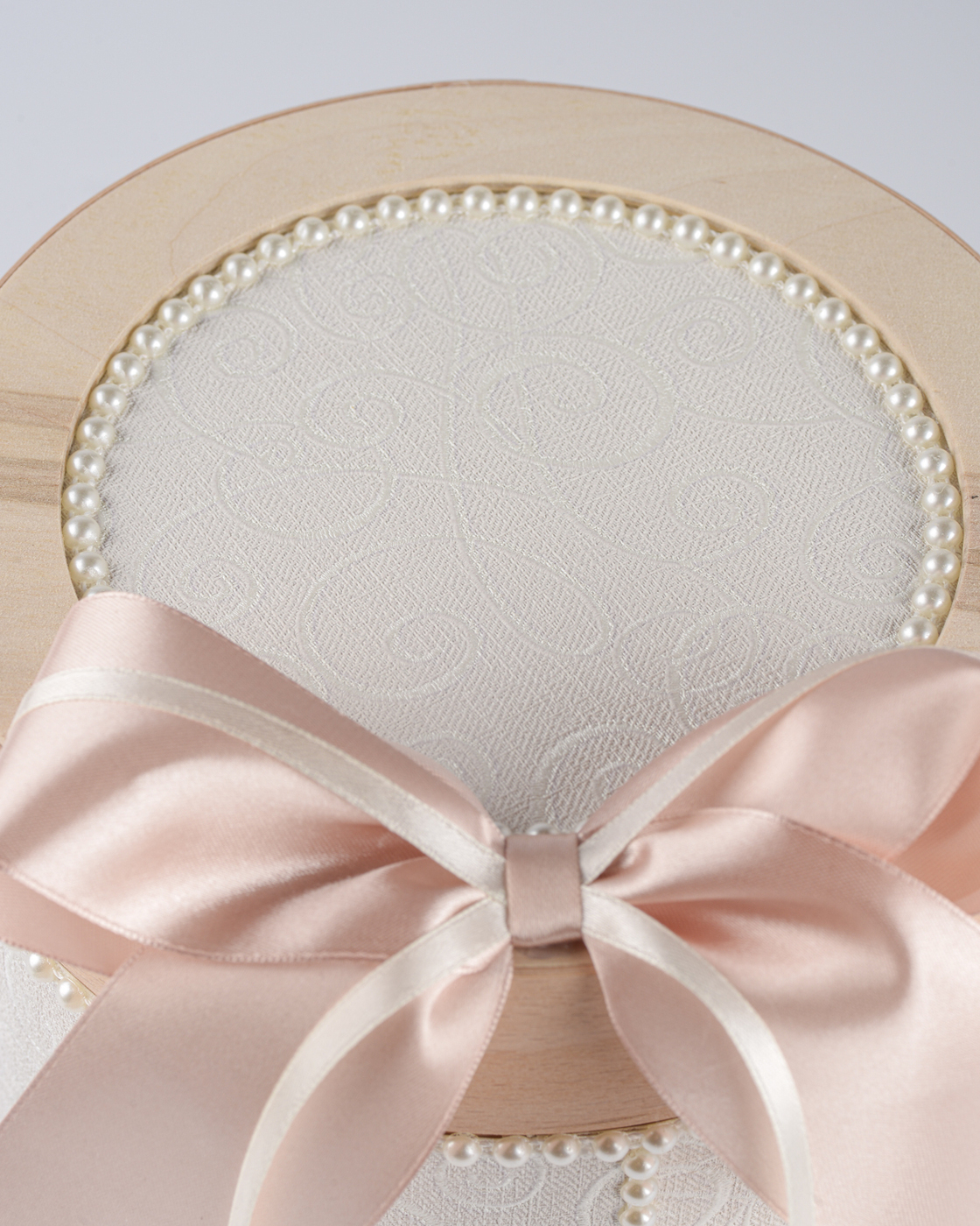 Коробка для подарков на свадьбу в виде тубуса с прорезью и фактурным декором айвори, атласным бантом кремового цвета, жемчужными бусинами