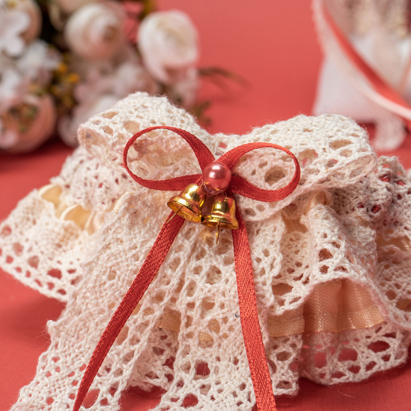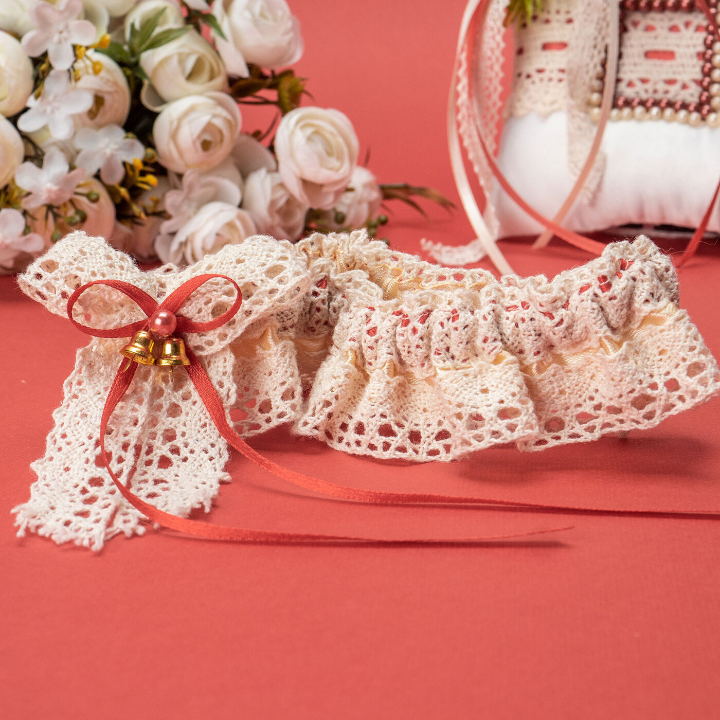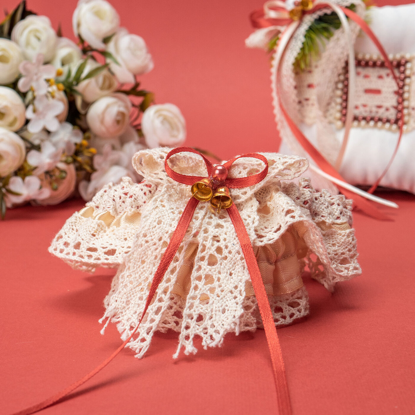 Узкая свадебная подвязка на ножку невесты из атласа белого и малинового оттенков, с крупной жемчужной бусиной в форме сердца
