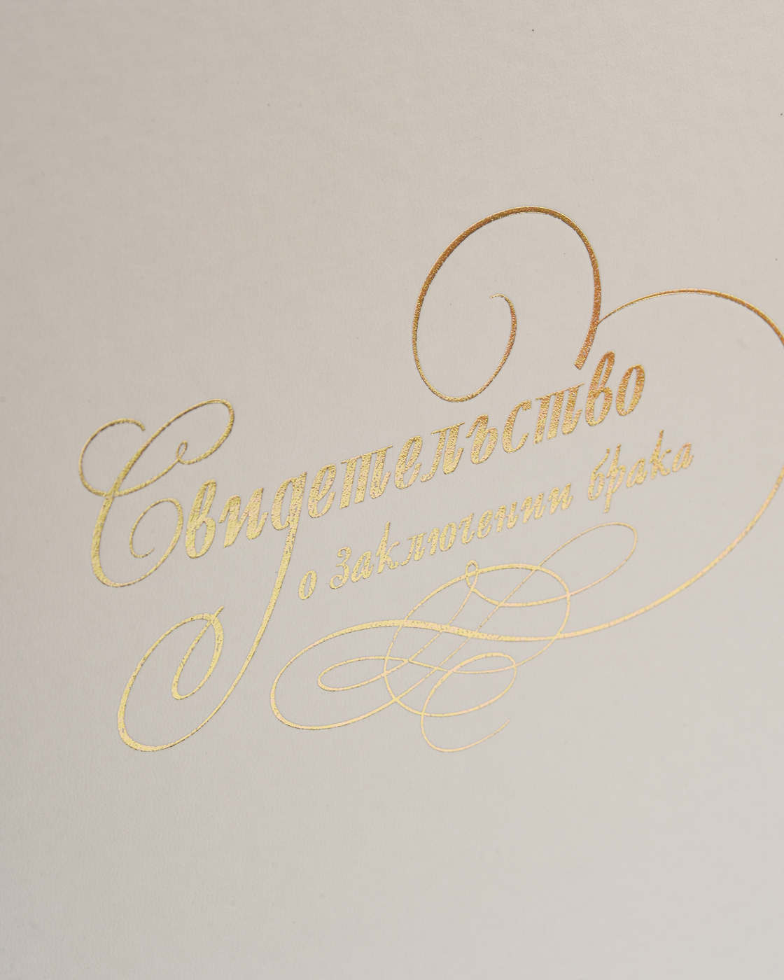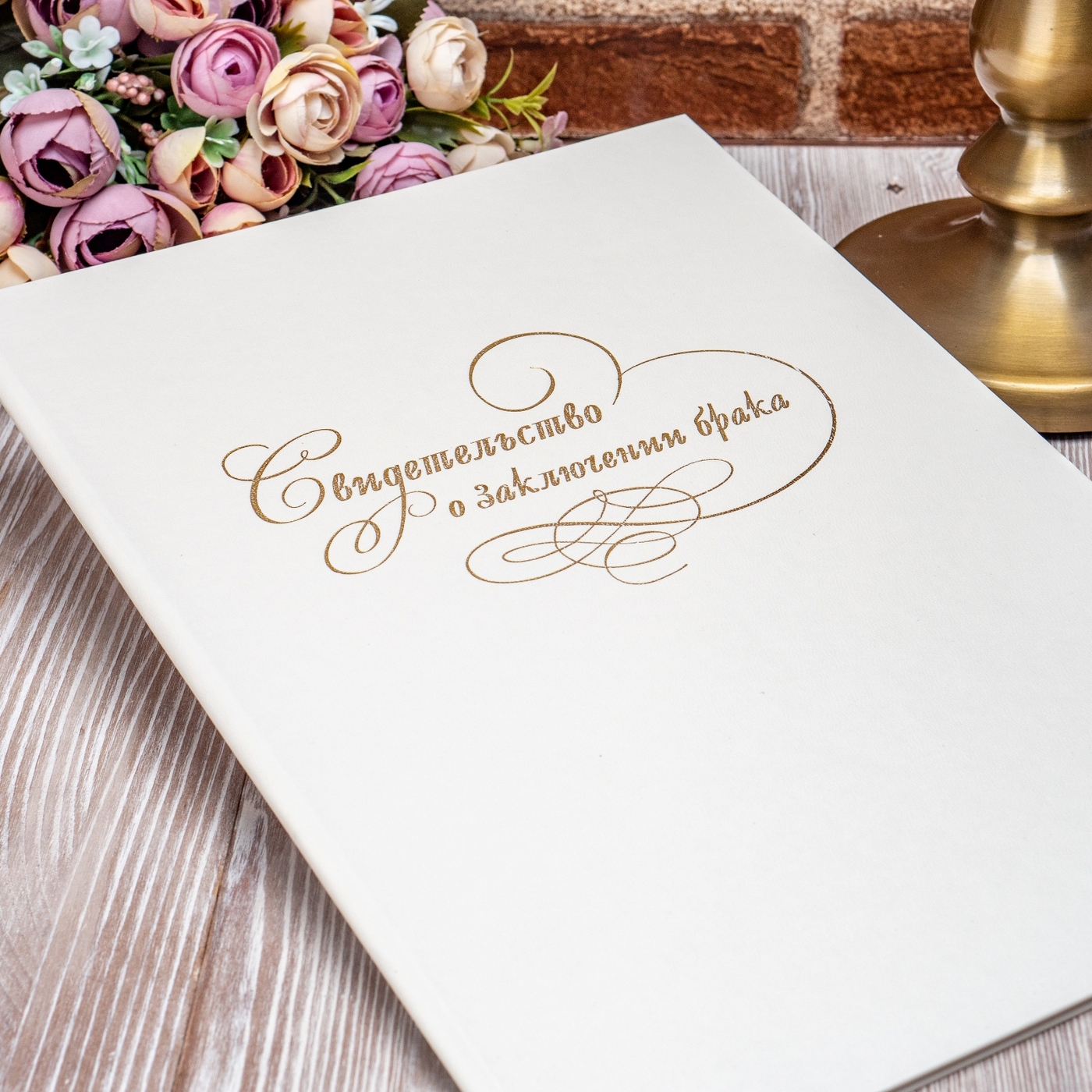Простая папка для брачного свидетельства молочного цвета с золотой надписью на обложке и ажурными вензелями, формат А4