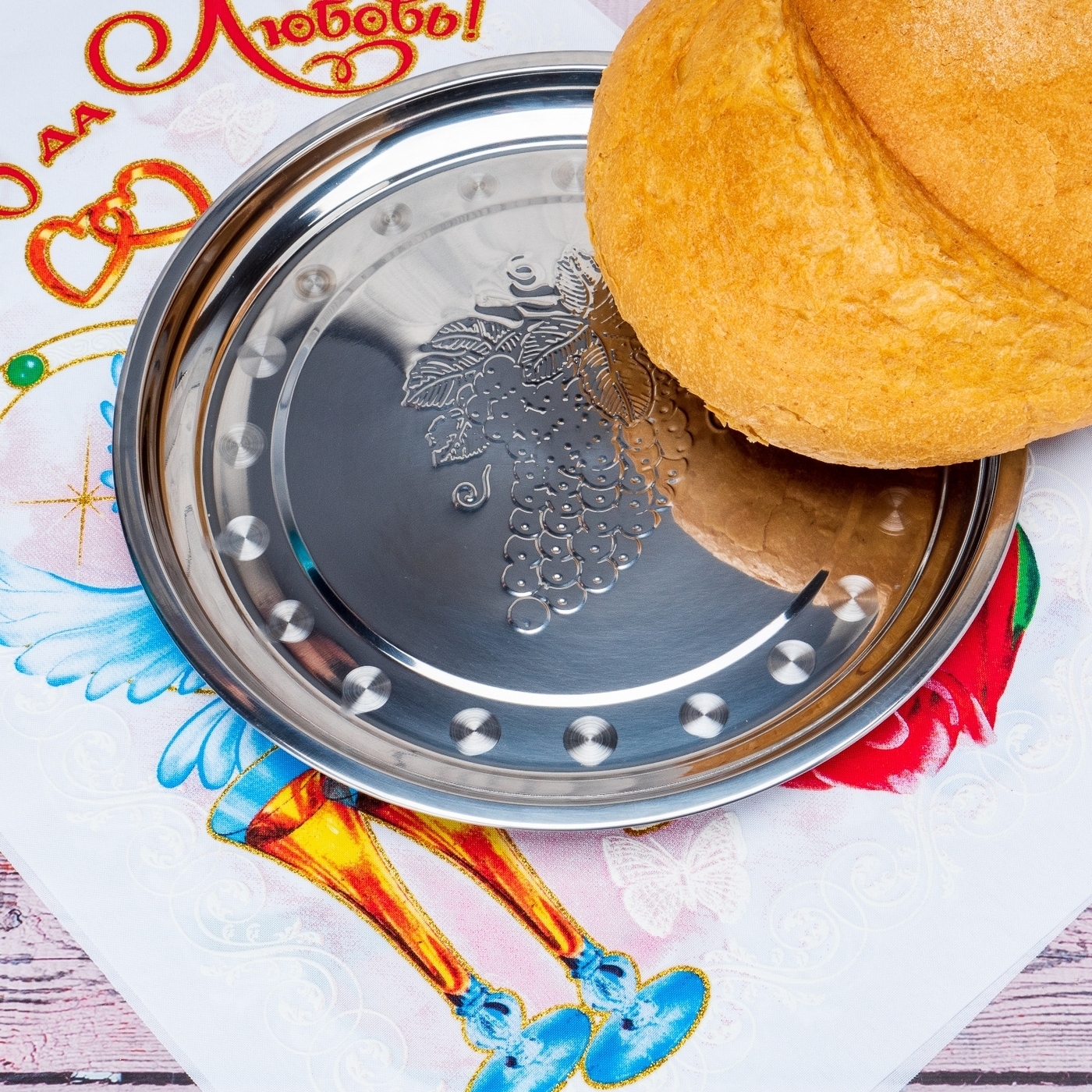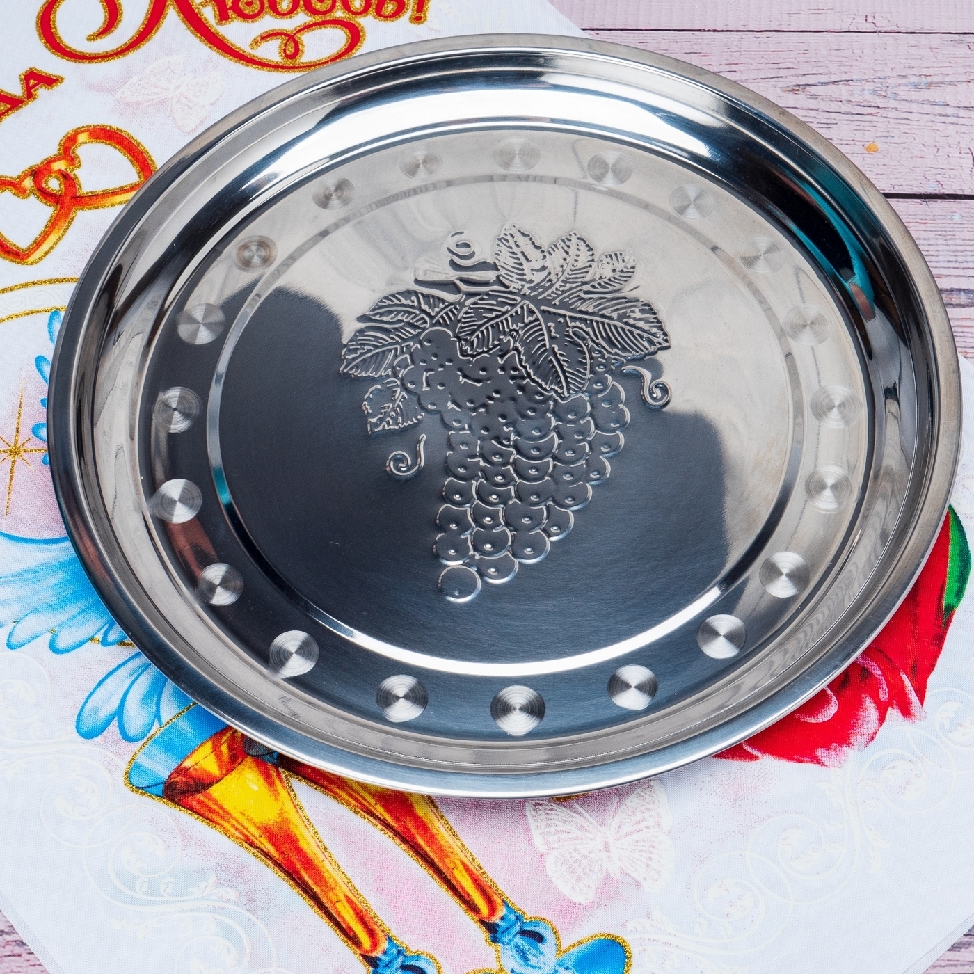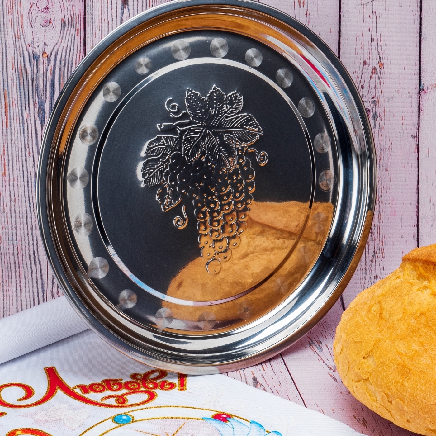 Металлический поднос для каравая на свадьбу и встречу молодоженов из ЗАГСа с рельефной виноградной лозой и узором, серебряного цвета