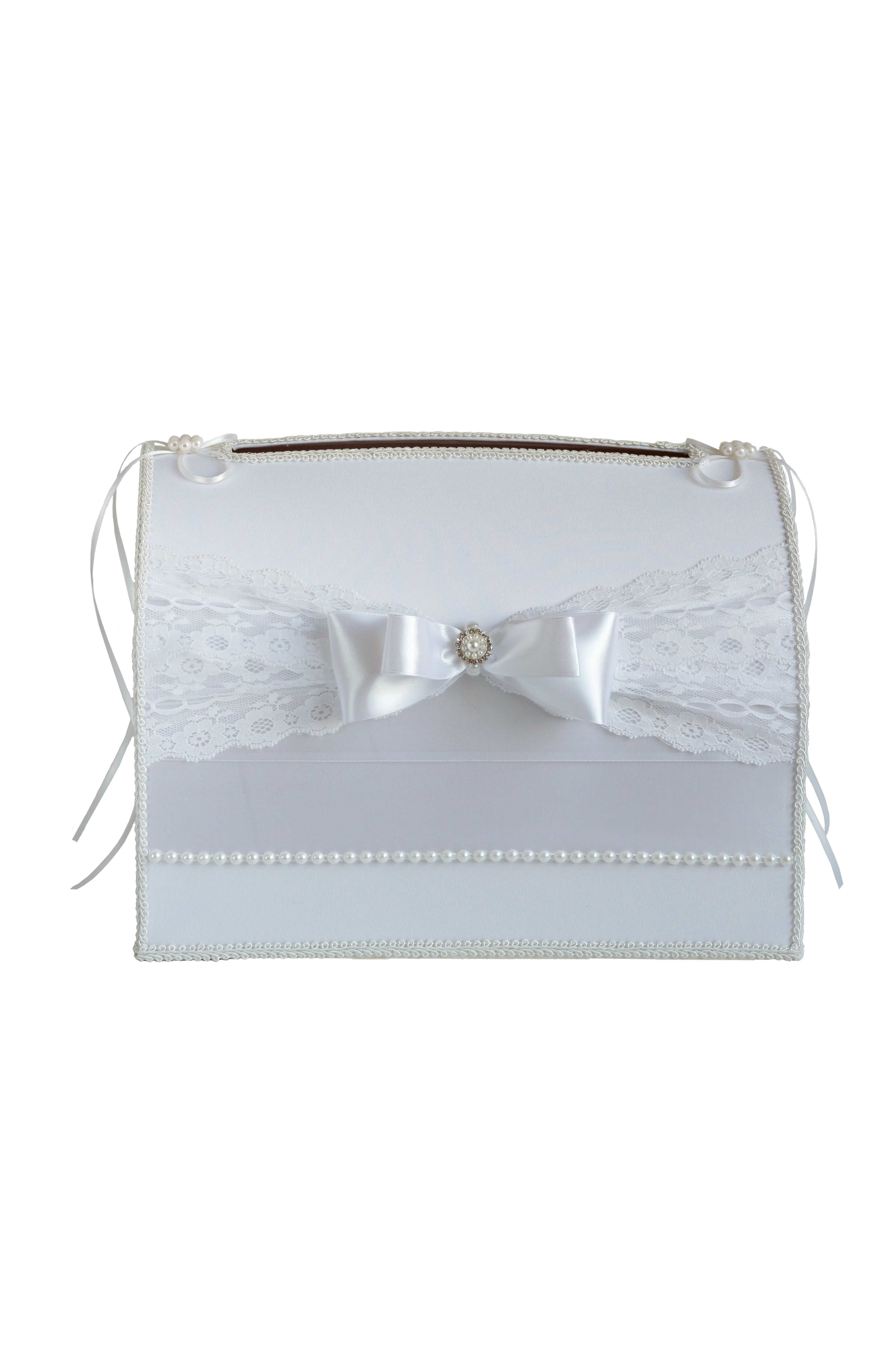 Атласный сундучок белого цвета для денежных подарков молодоженам "Жемчуг" с декором из кружева, жемчужных бусин и страз