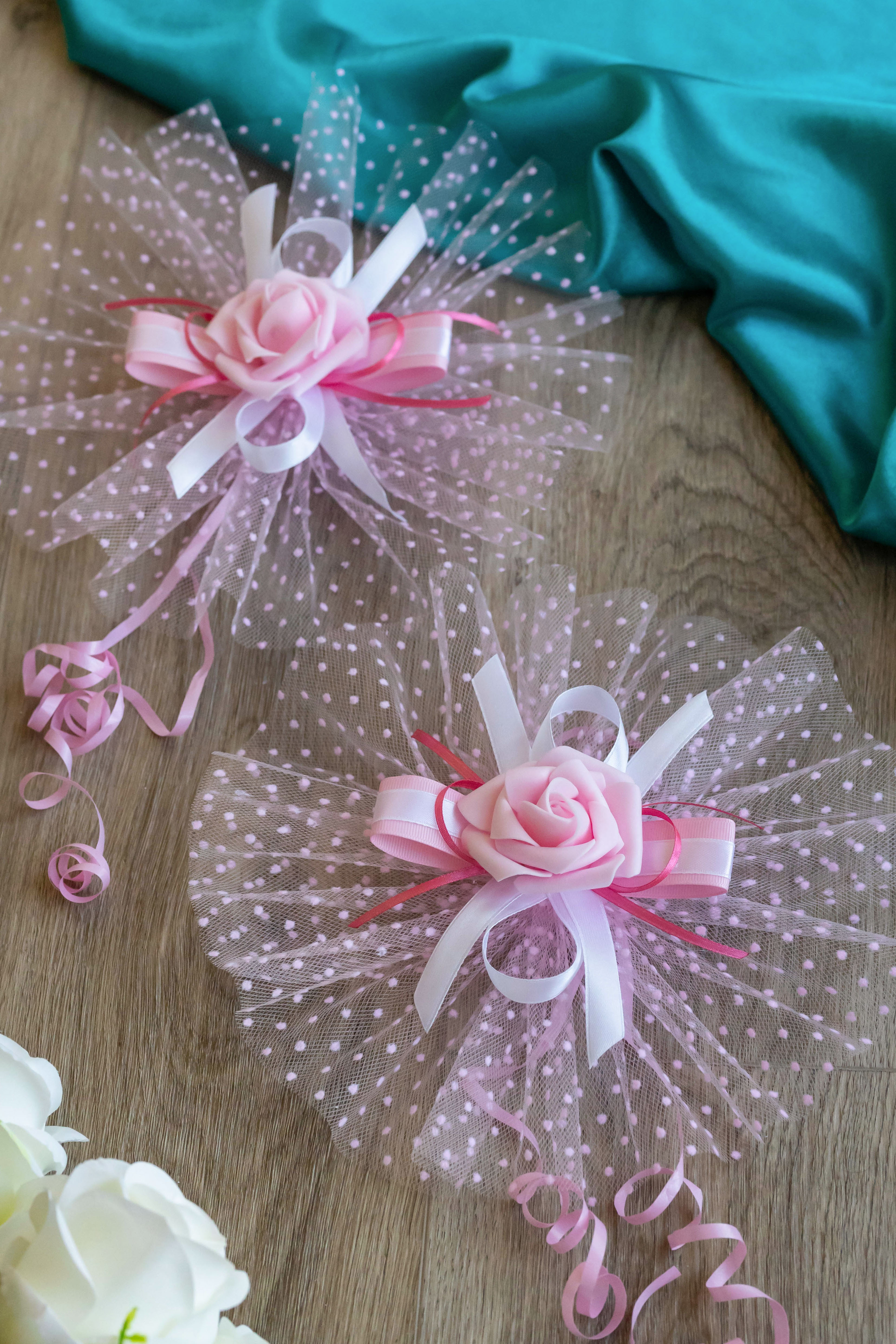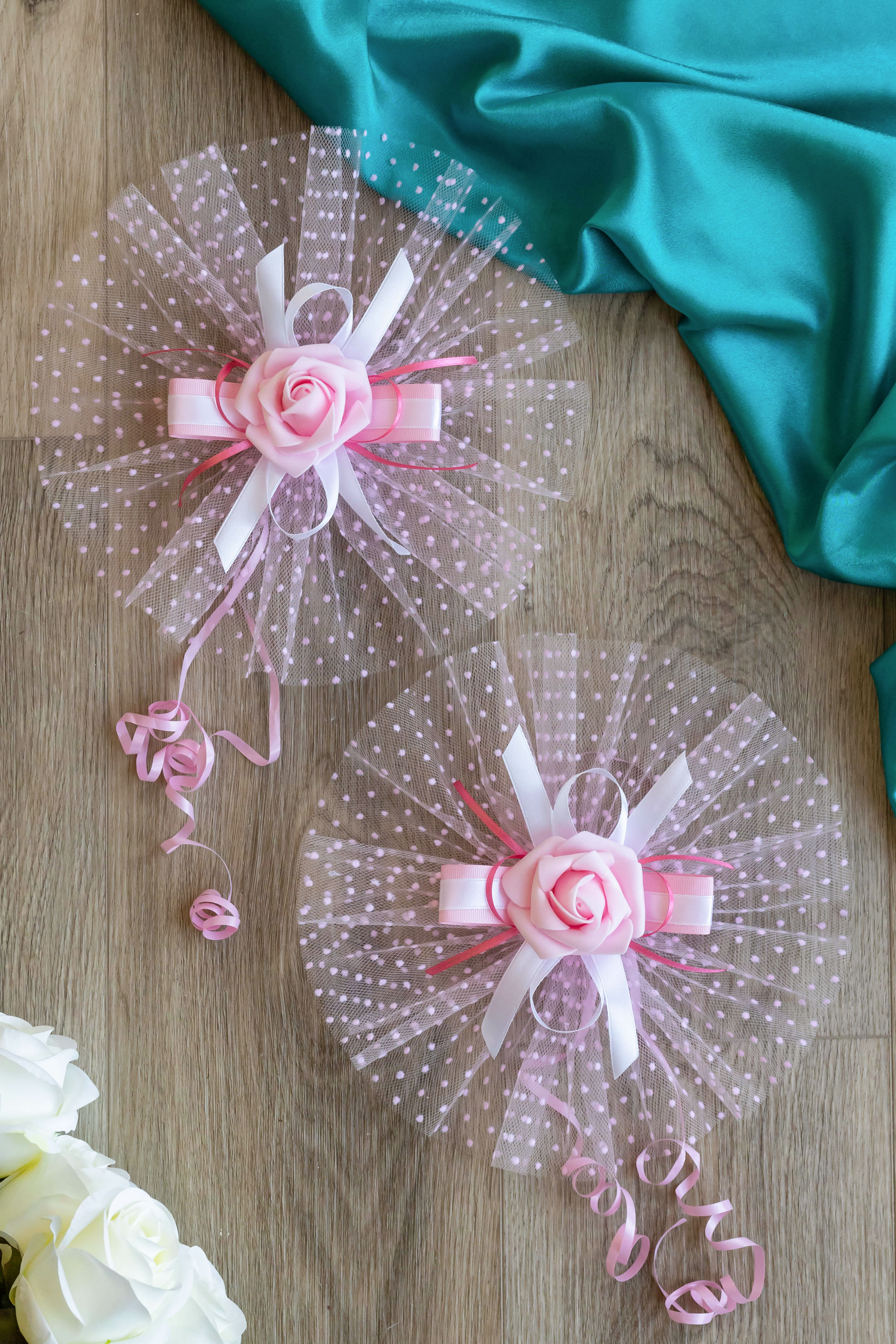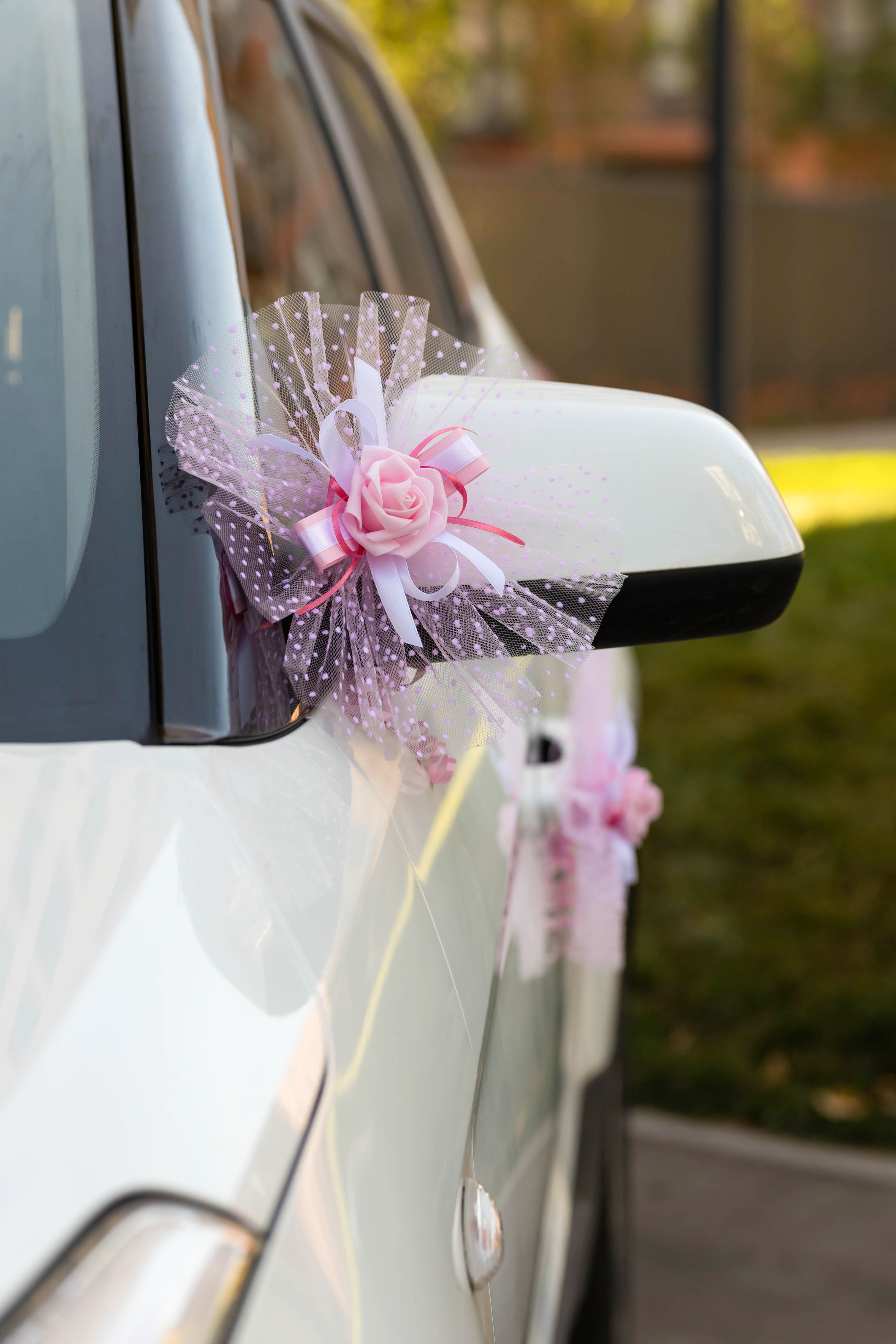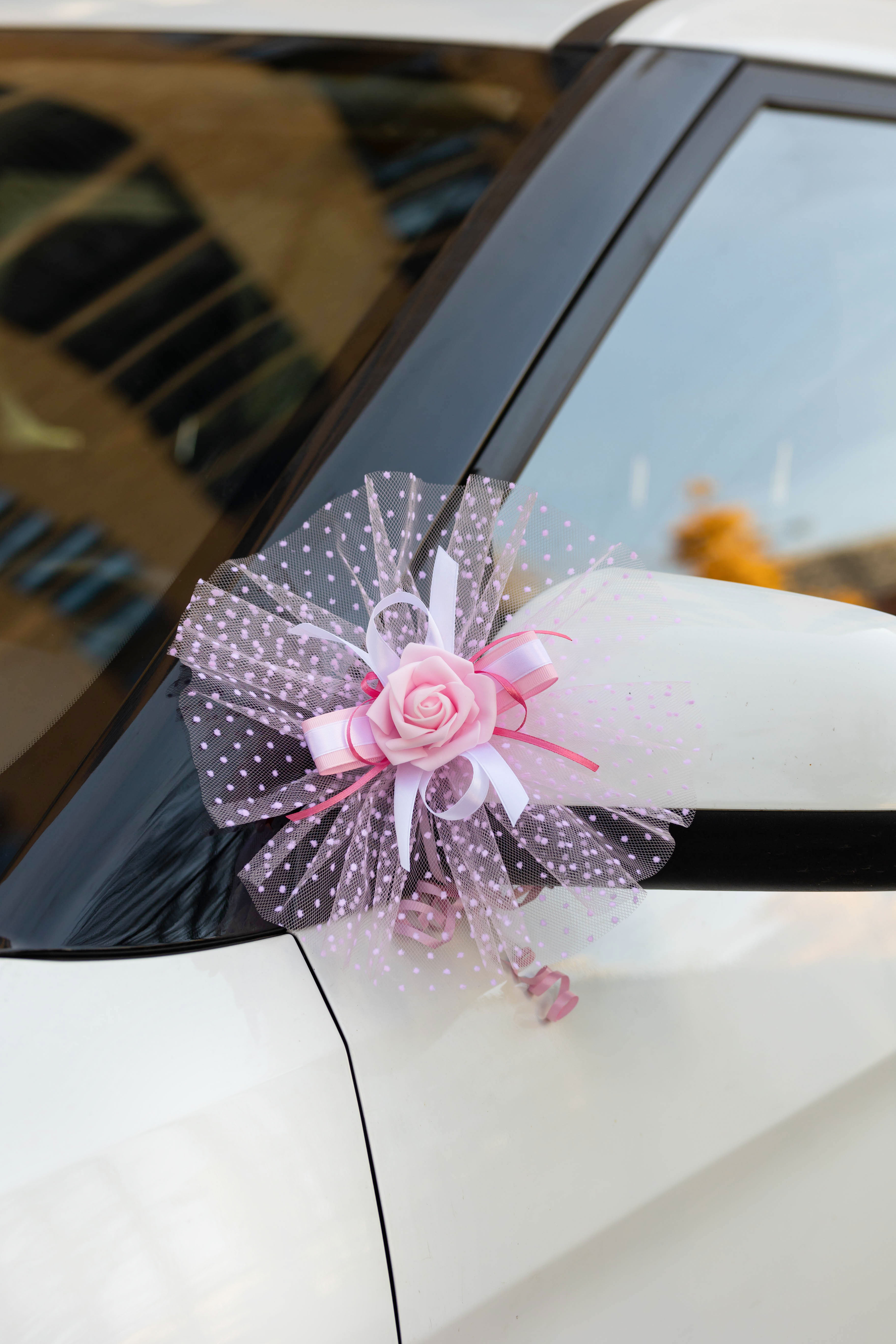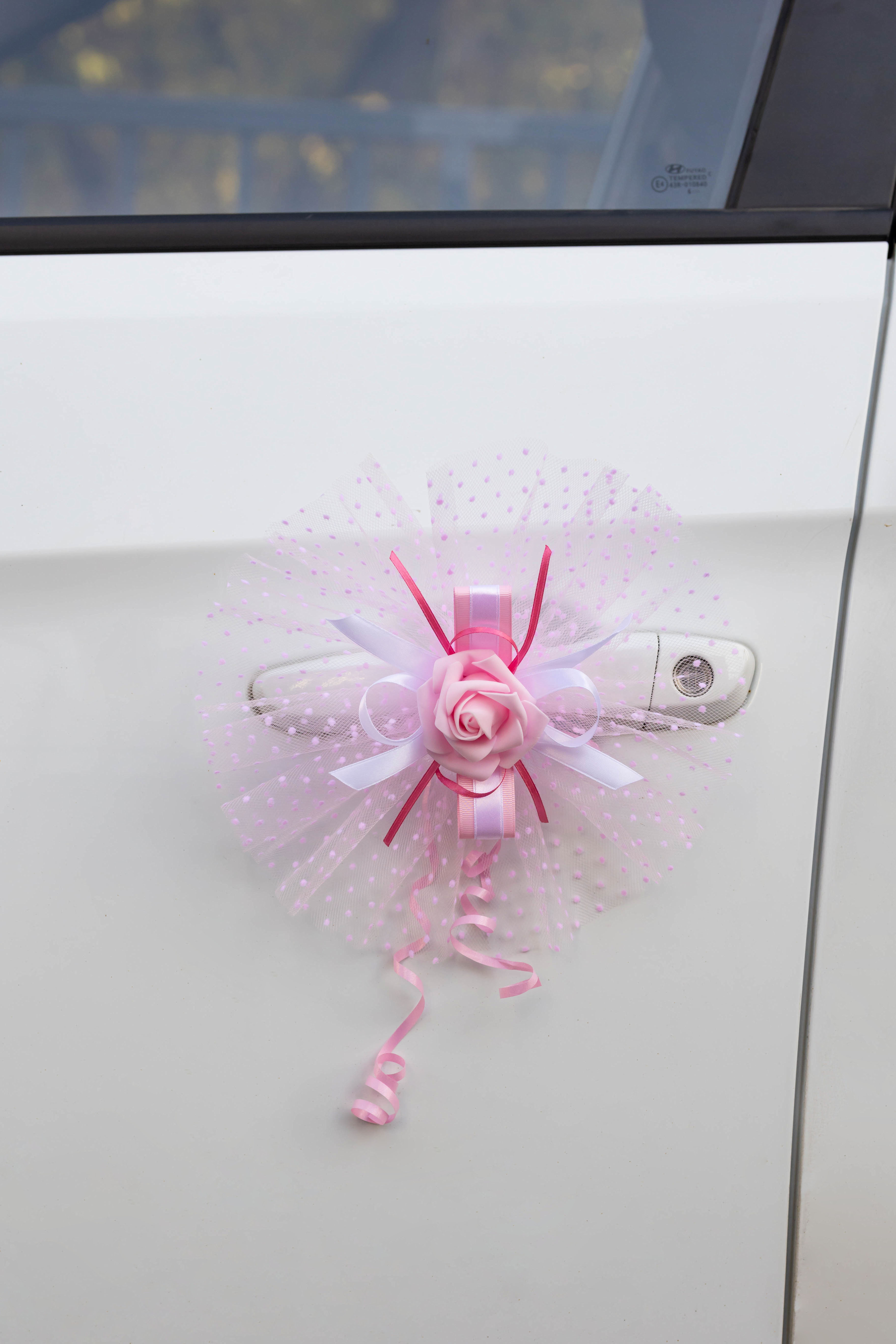 Украшение на машину на выписку из роддома и свадьбу - банты с розами на ручки и зеркала авто, розового цвета, 25 см, 2 штуки
