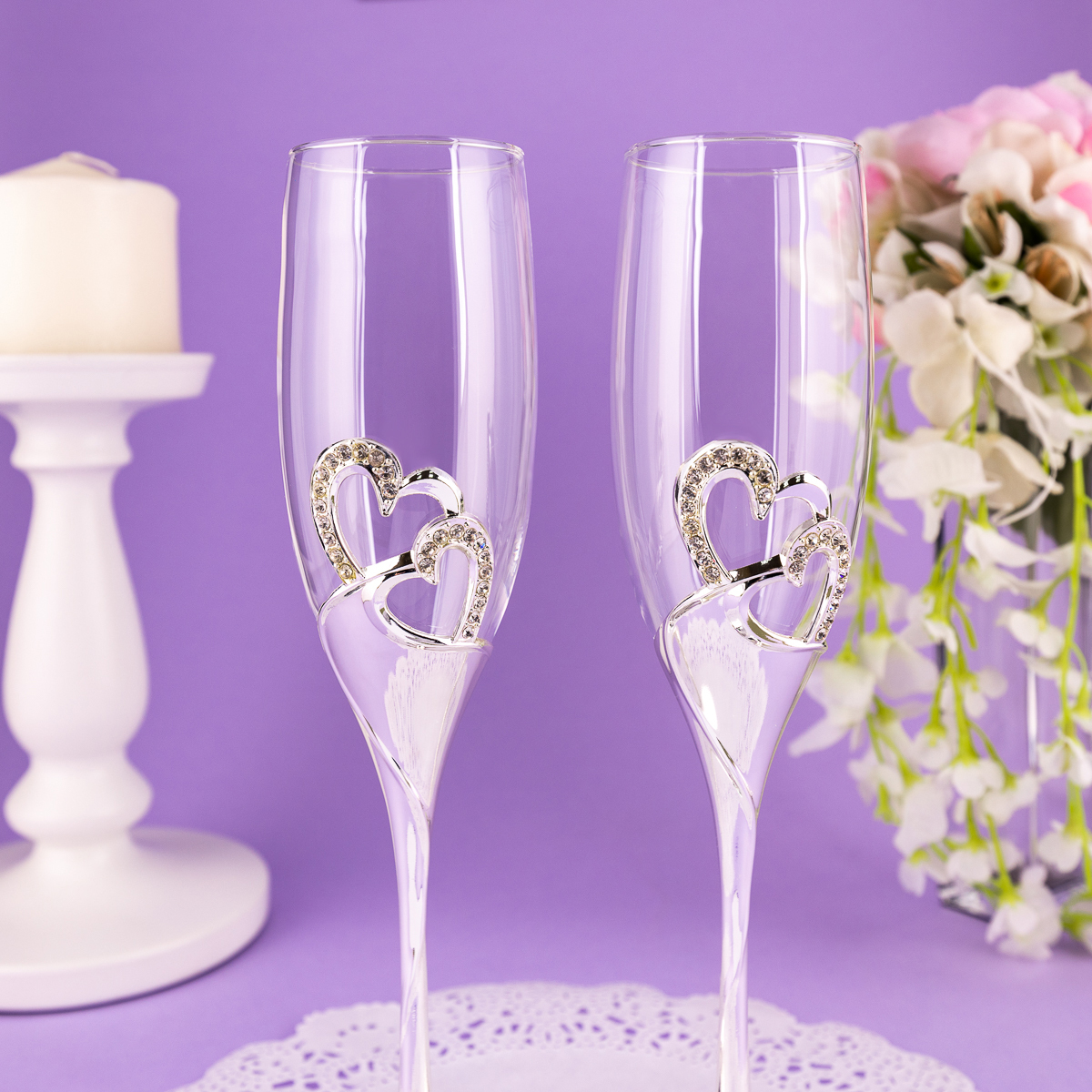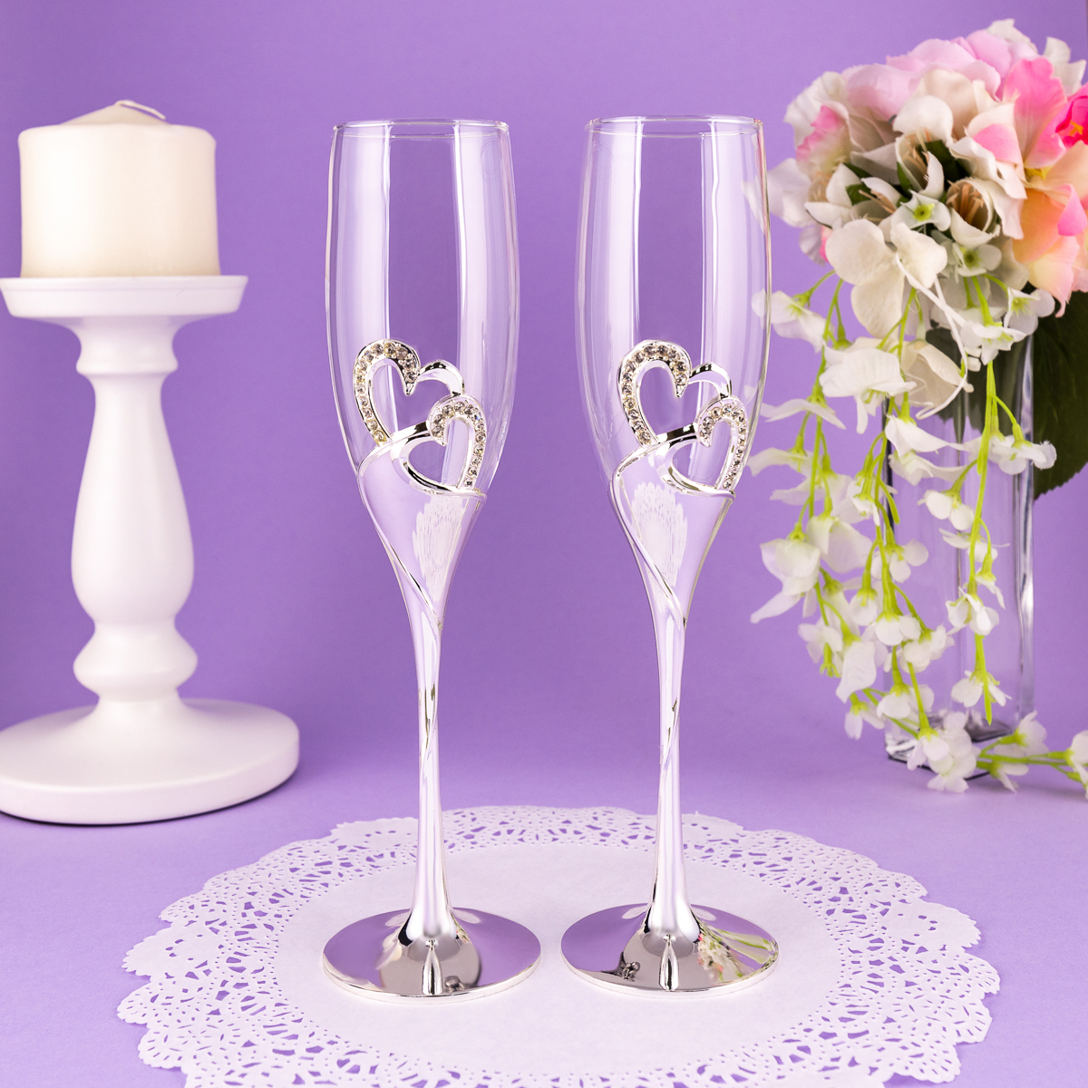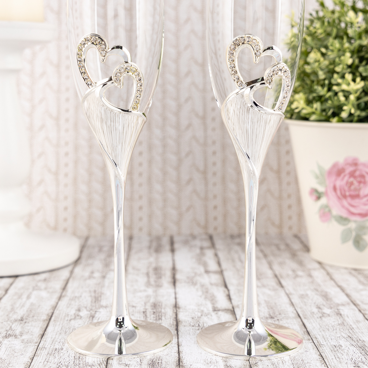 Бокалы для молодоженов на металлических ножках серебряного цвета, с сердцами из страз, 2 штуки