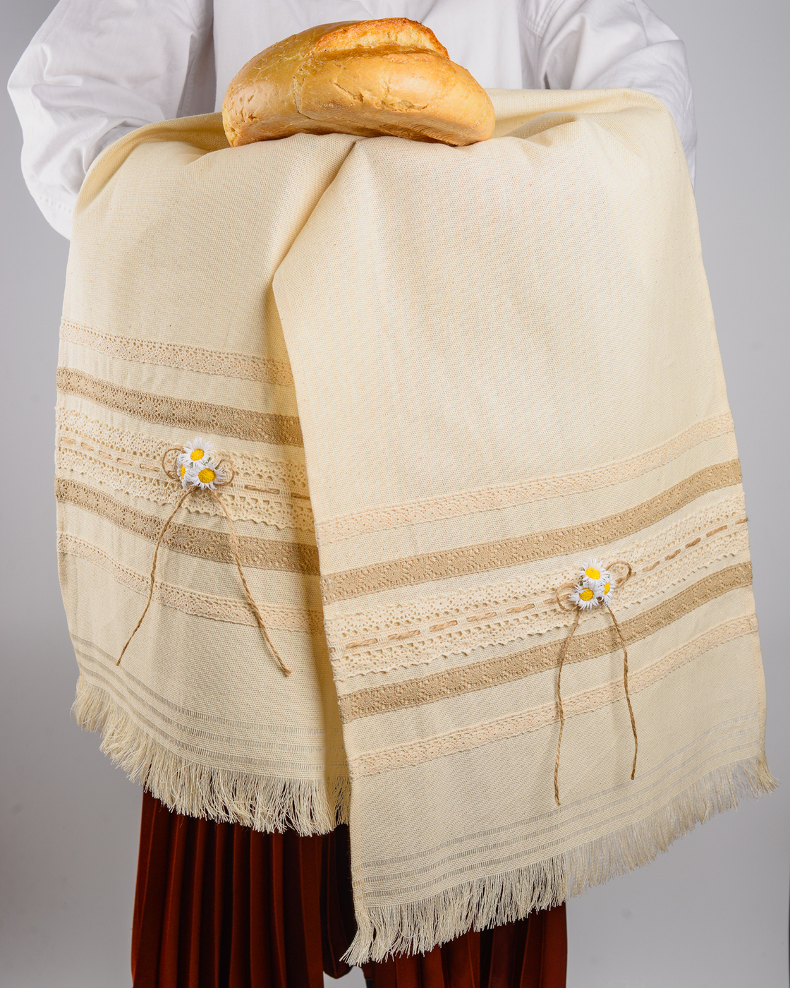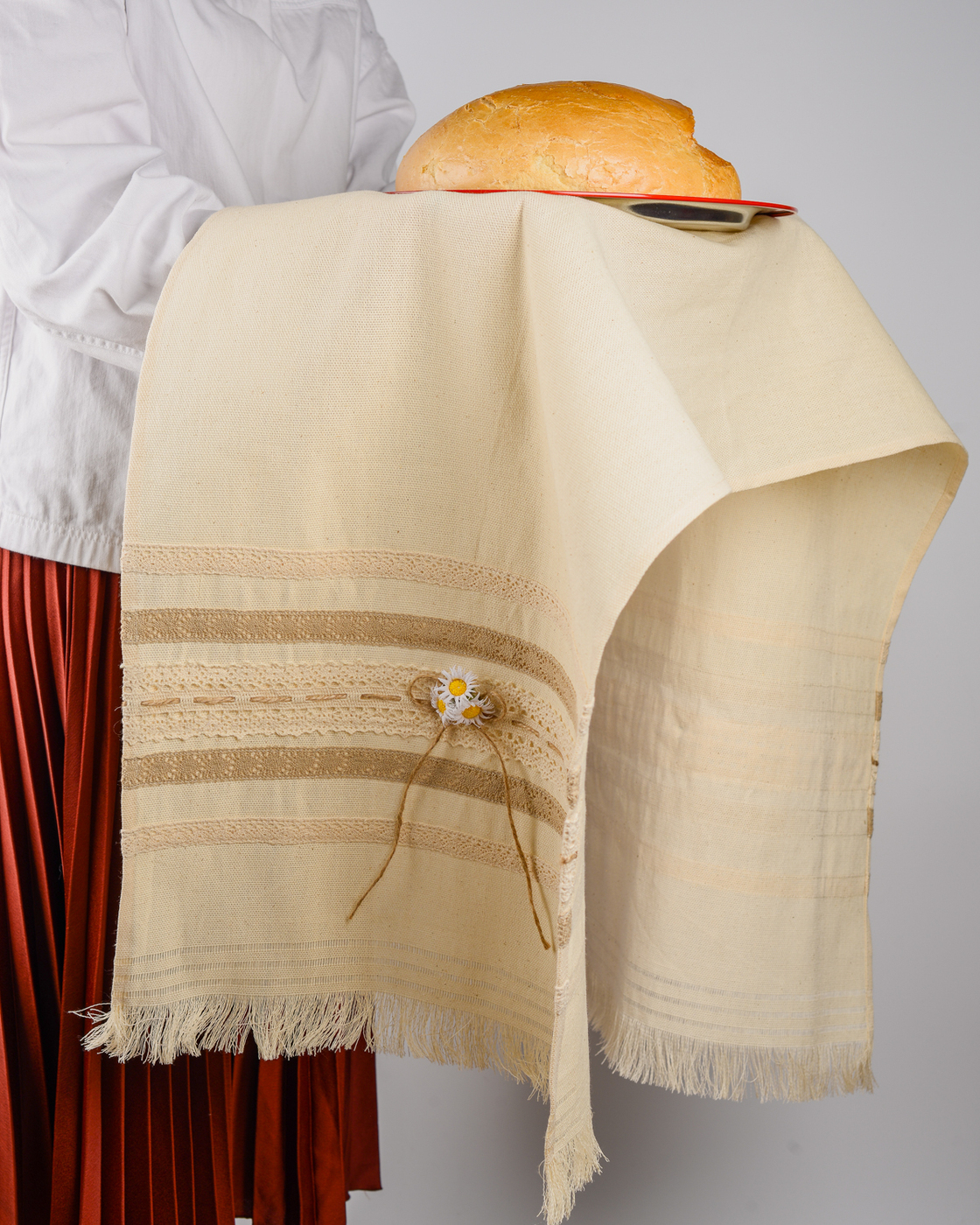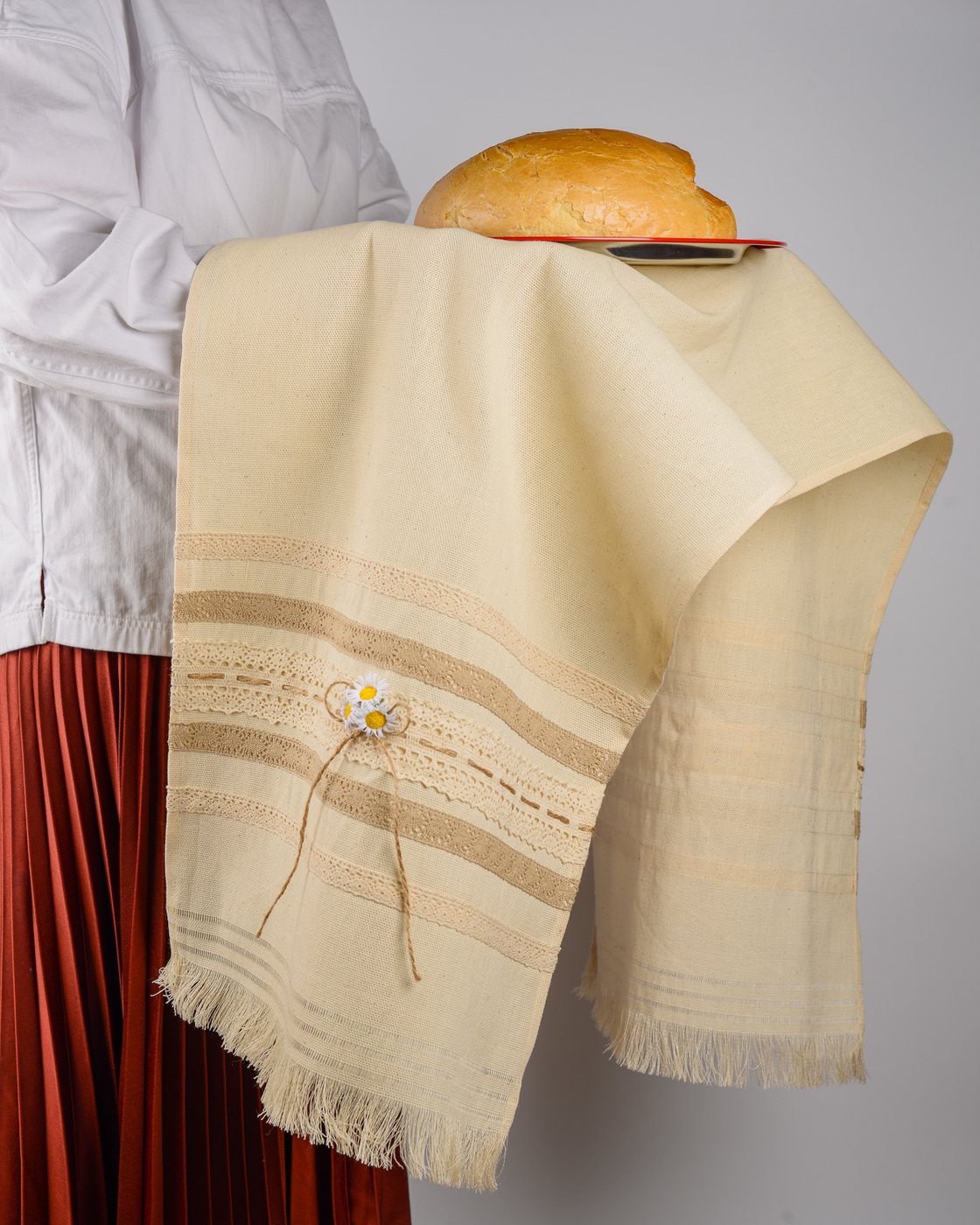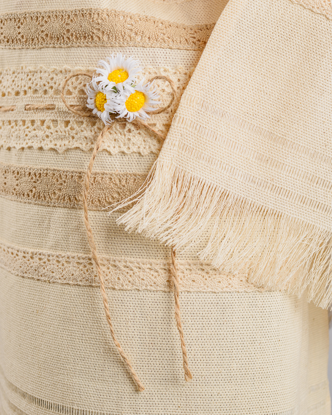 Свадебный рушник для молодоженов в эко-стиле "Рустикальная свадьба" из бежевого льна с вязаным кружевом, ромашками и тесьмой из бечевки