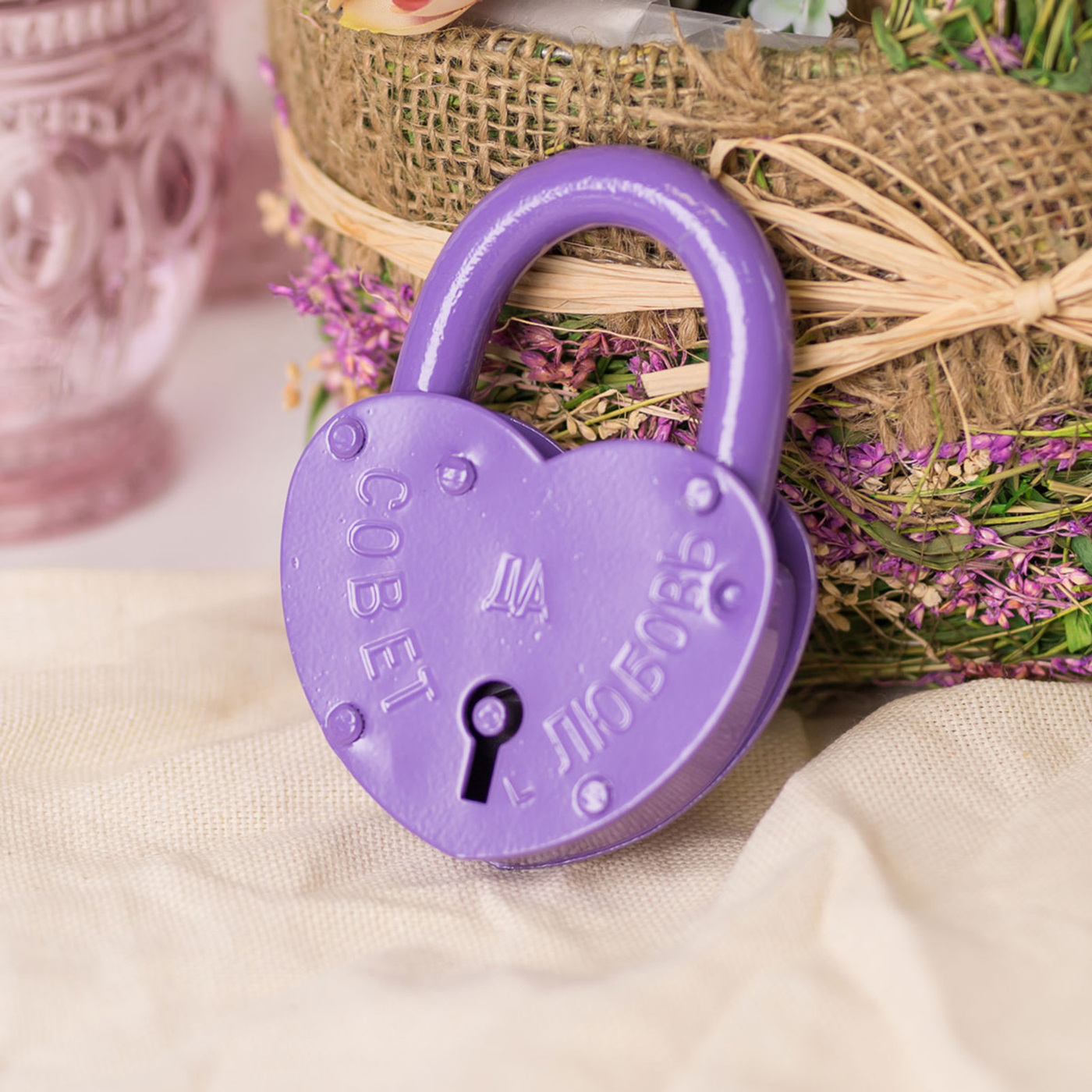 Навесной декоративный замочек на свадьбу, 14 февраля и обряд верности молодоженов "Фиолетовый" из металла с гравировкой и запасными ключами