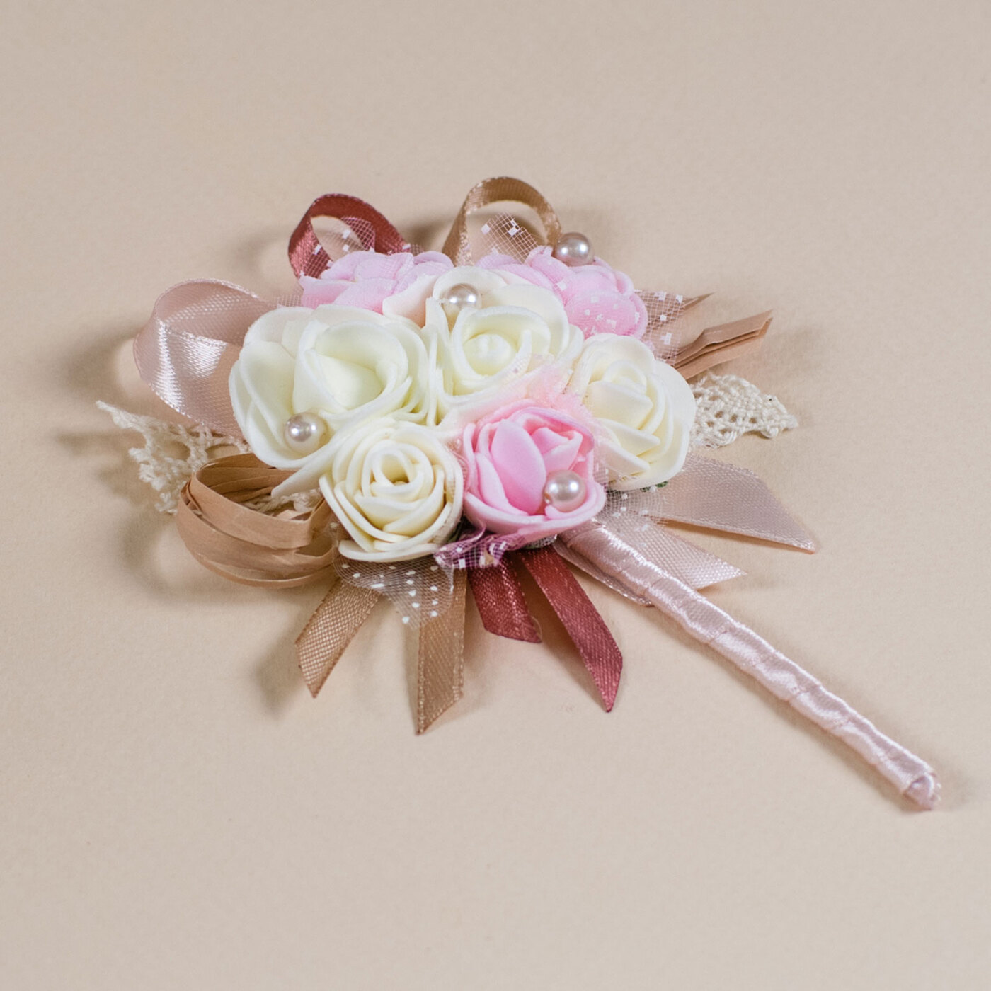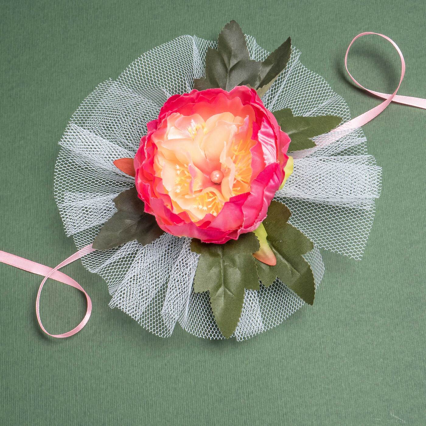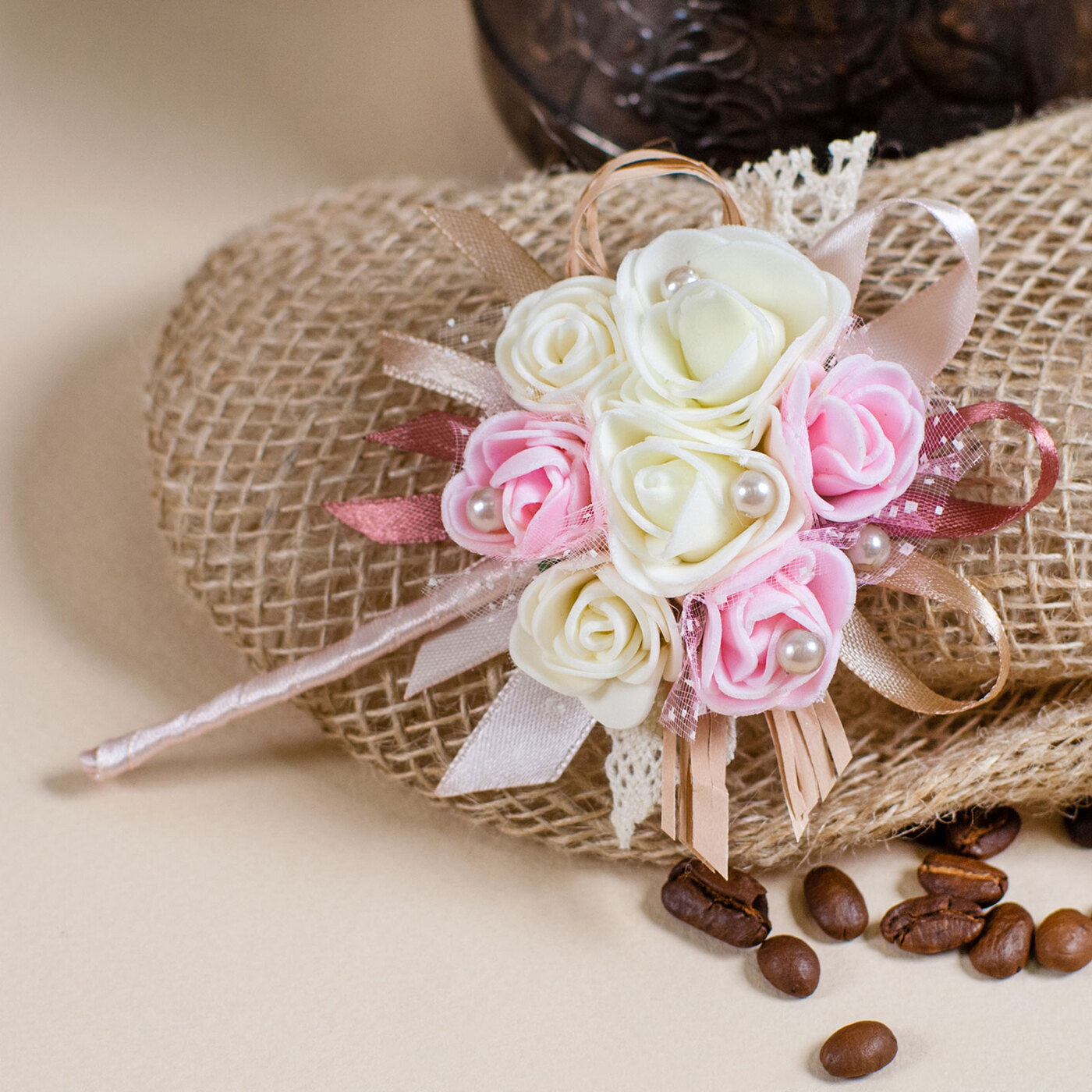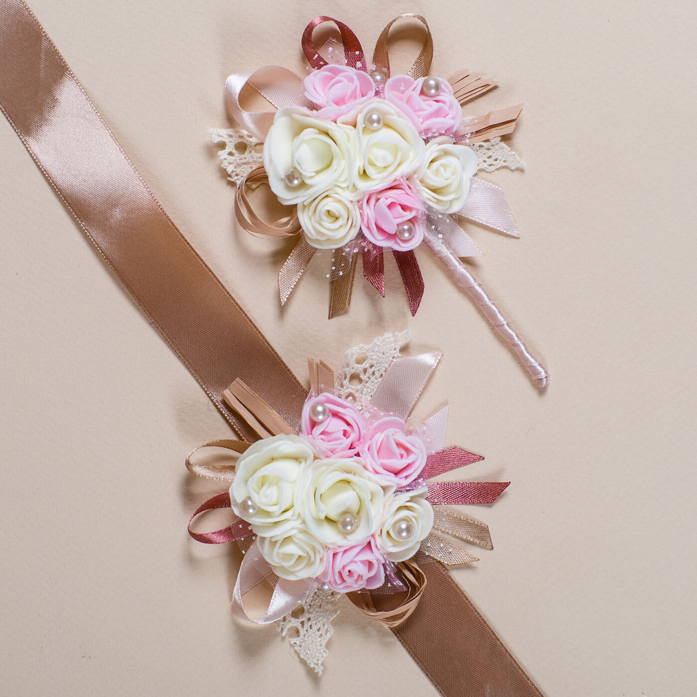 Свадебные значки - розетки для свидетелей жениха и невесты персикового цвета из атласных лент, в комплекте 2 штуки