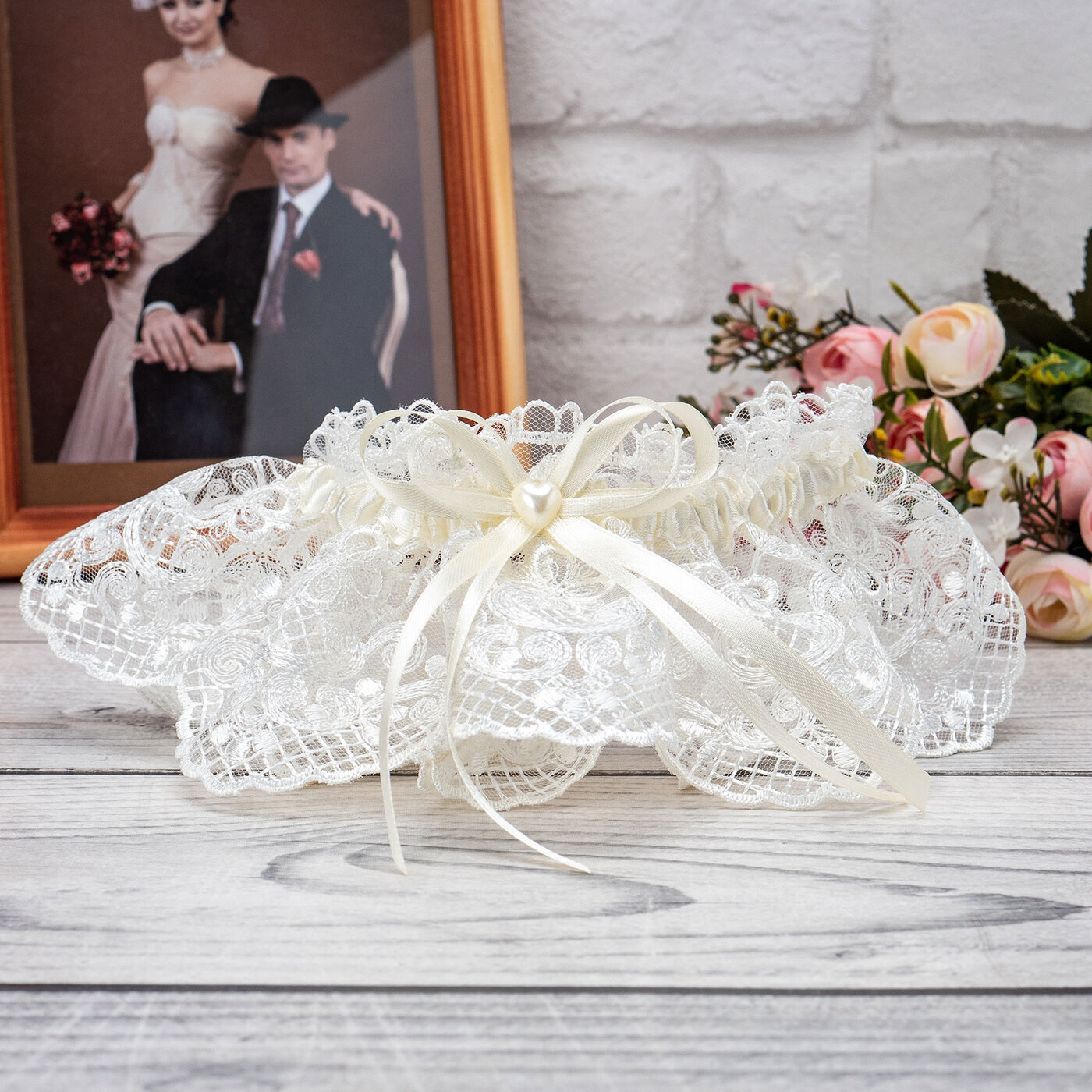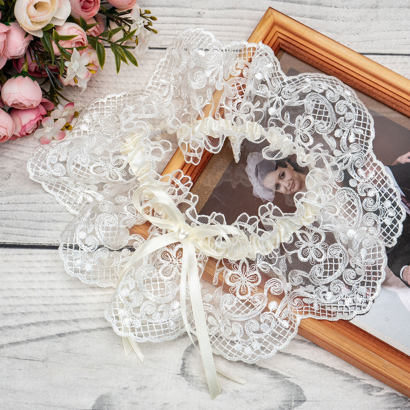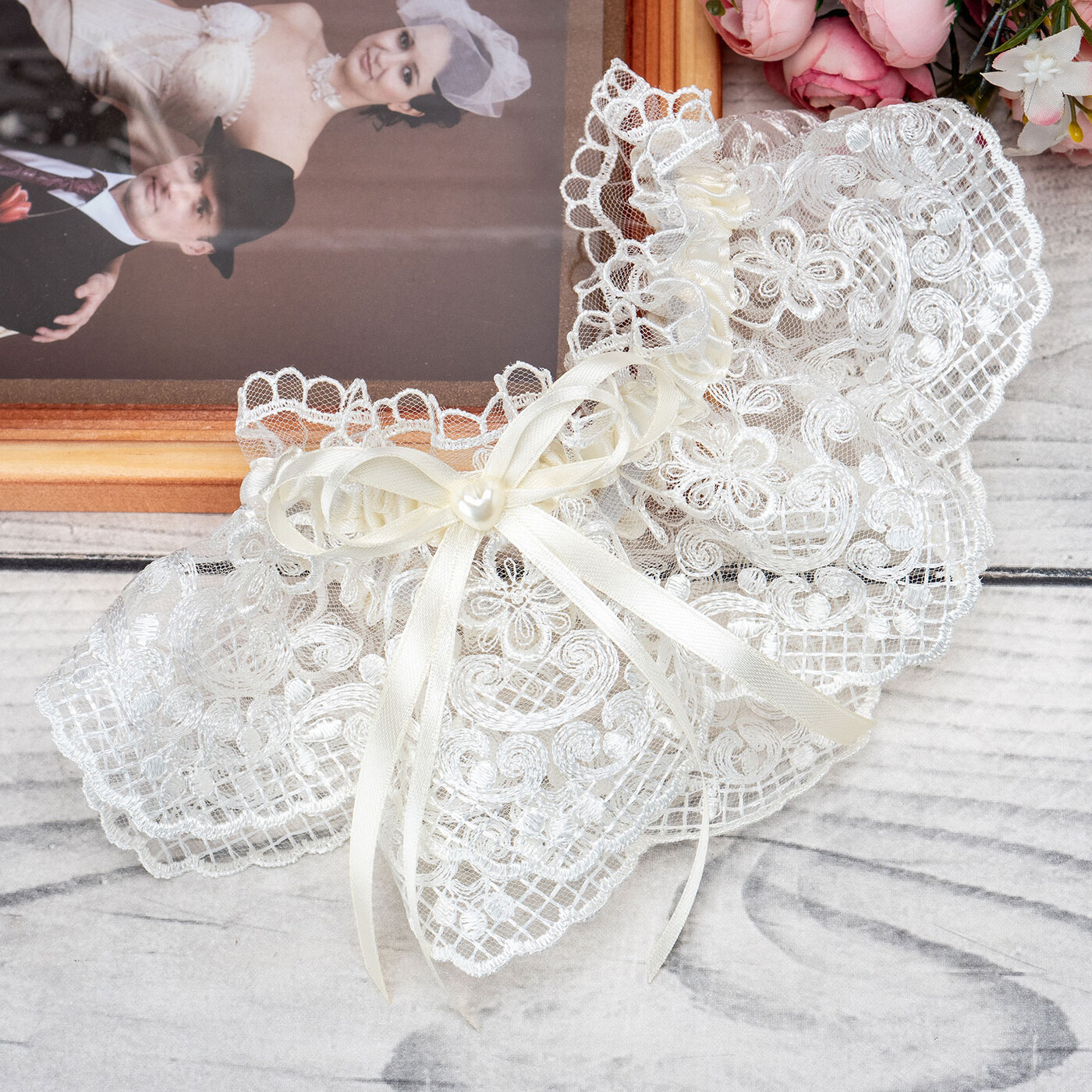Нежная кружевная подвязка невесты из широкого кружева айвори с вышитыми узорами и атласным бантом белого цвета с перламутровой бусиной