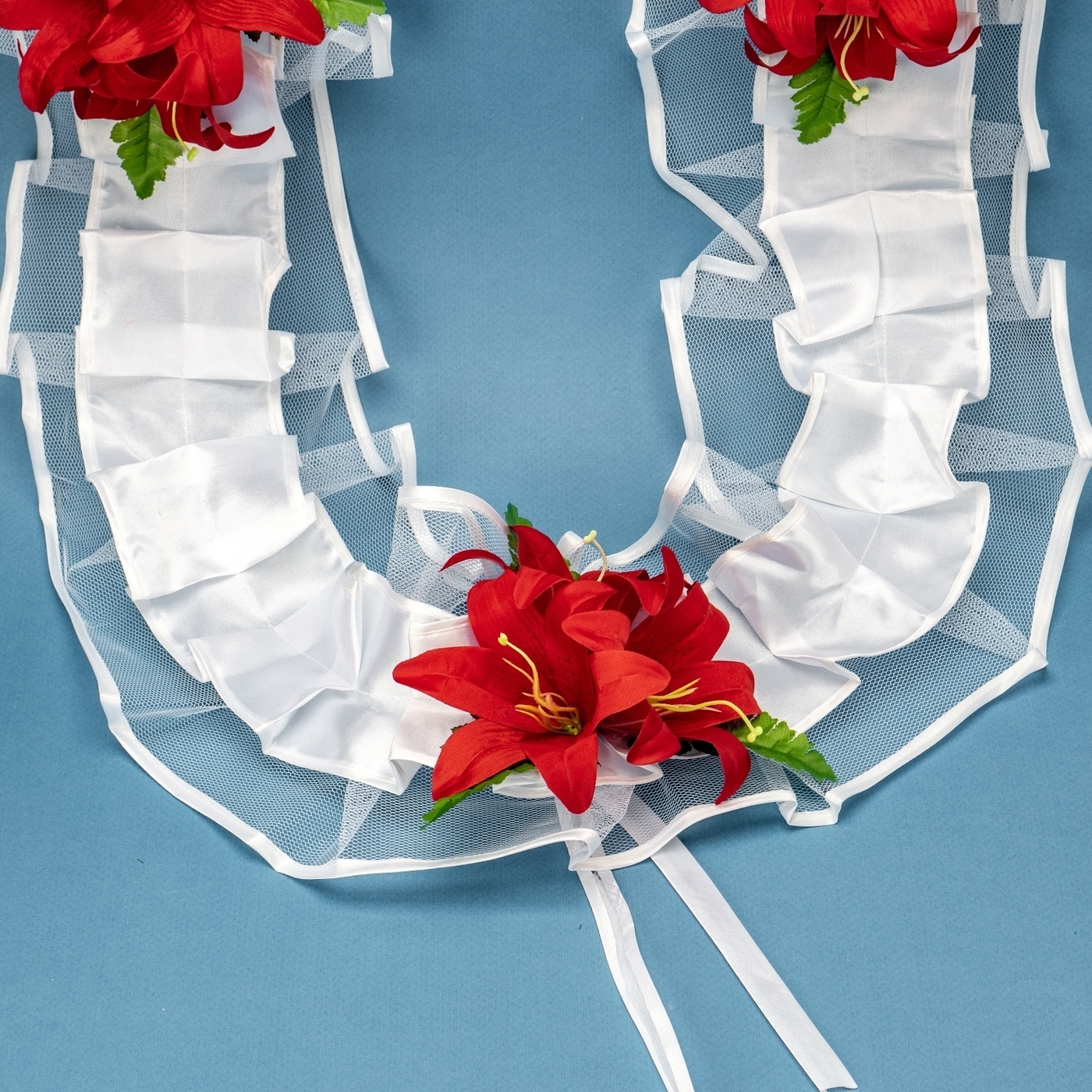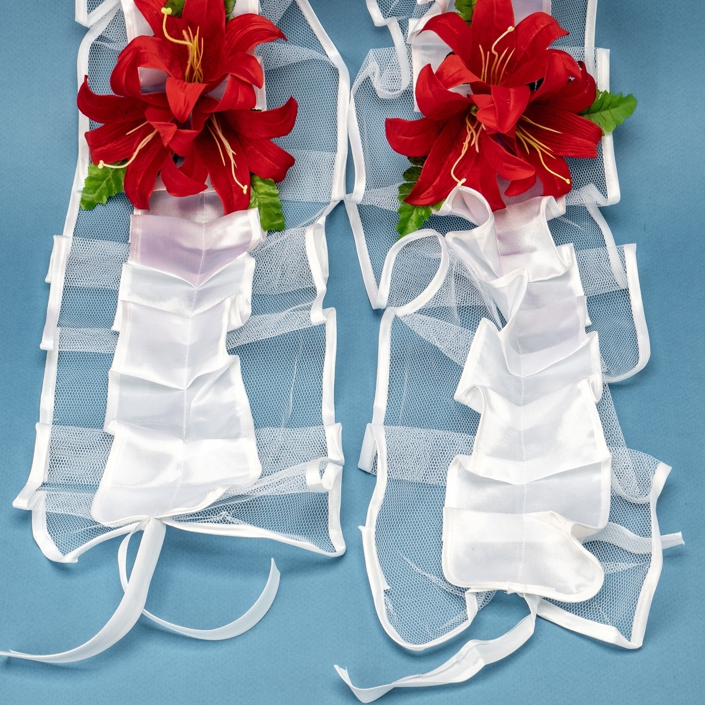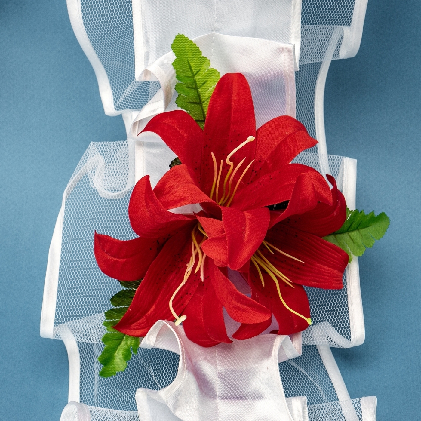 Свадебная белая лента на капот авто молодоженов, из атласа и фатина с красными лилиями и зелеными листочками