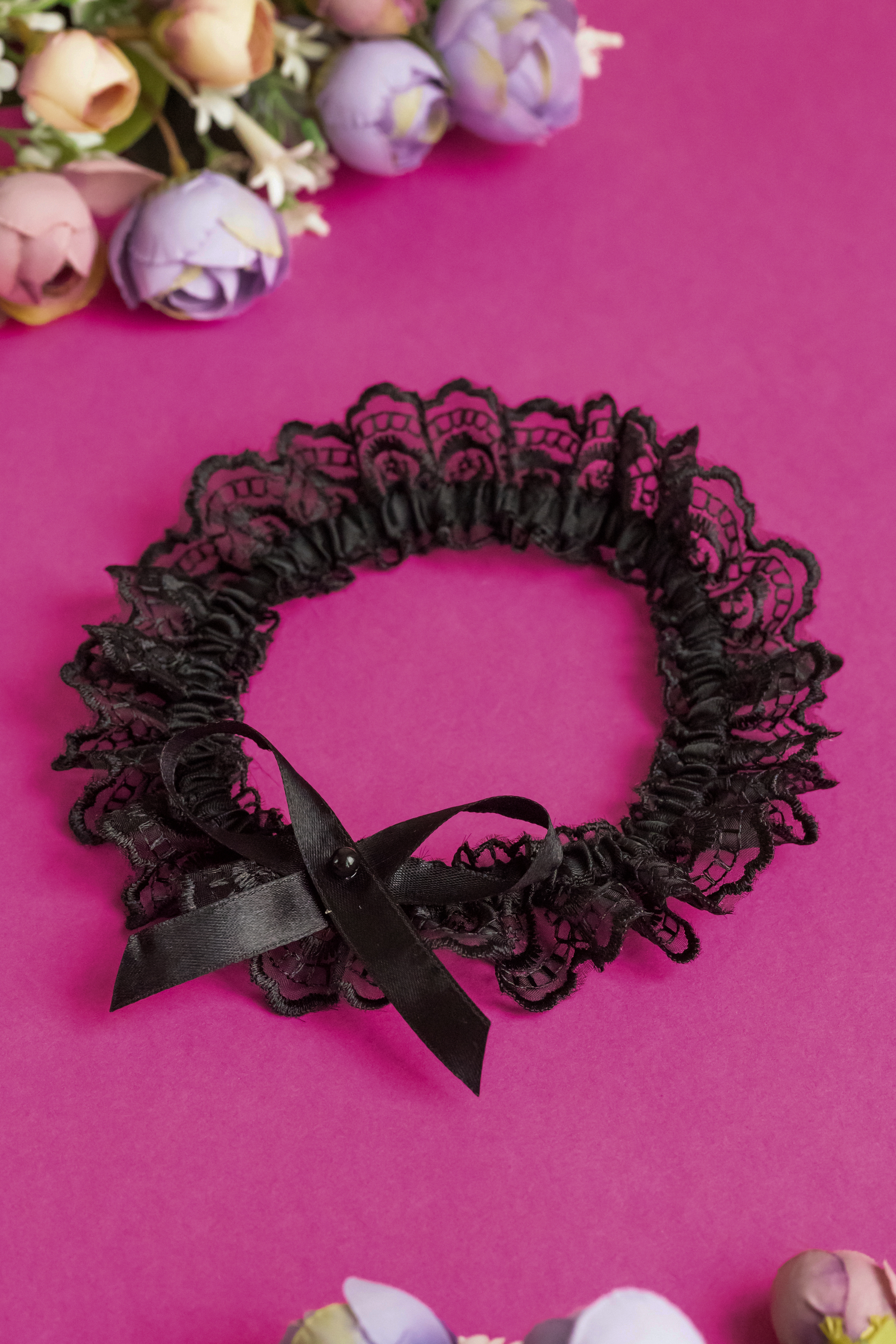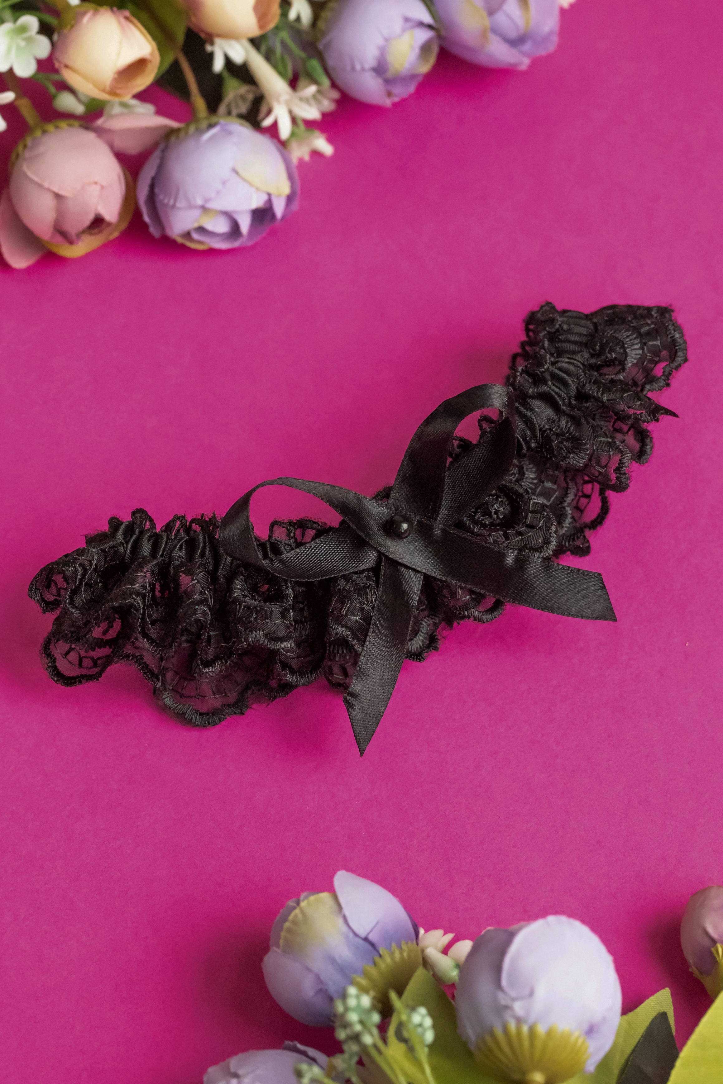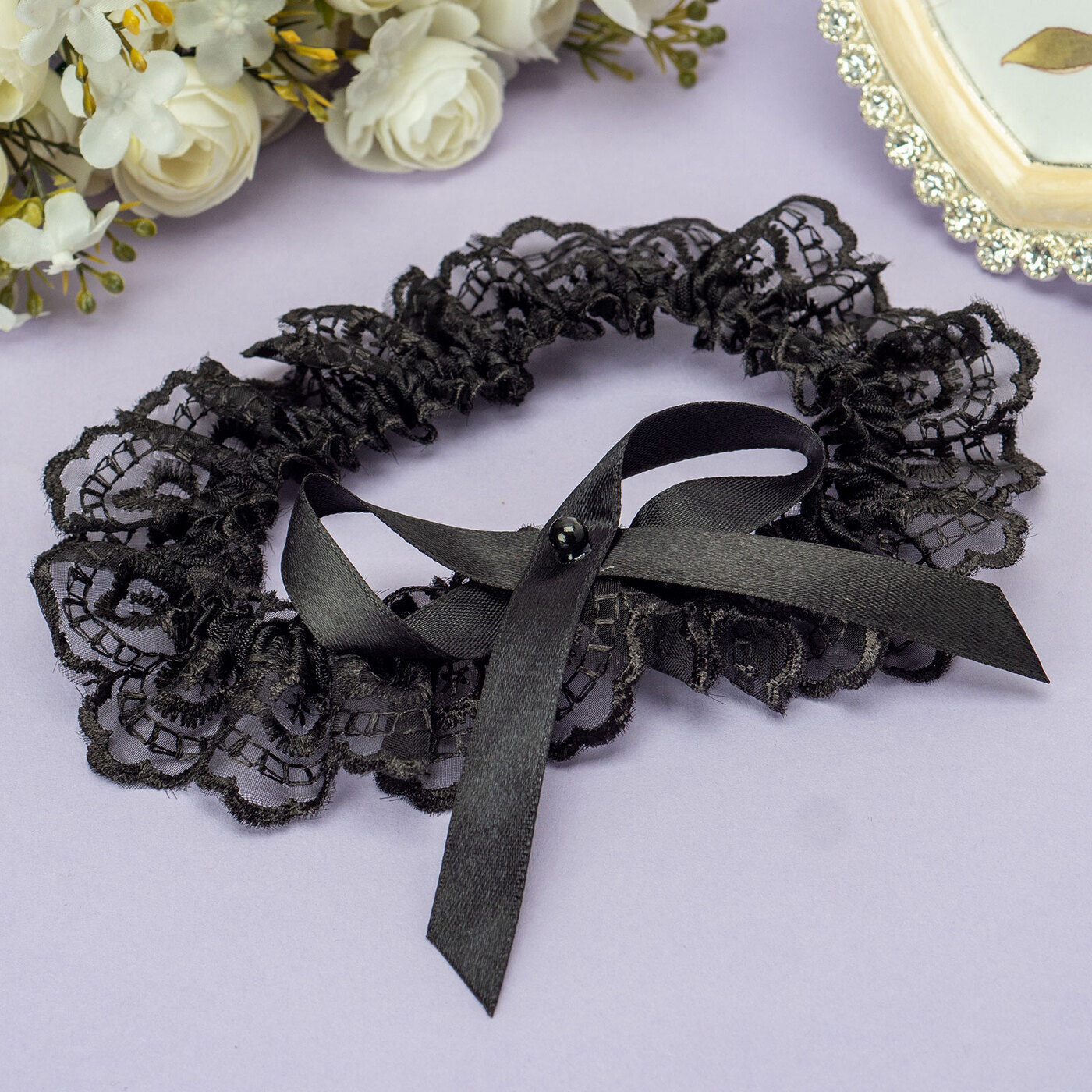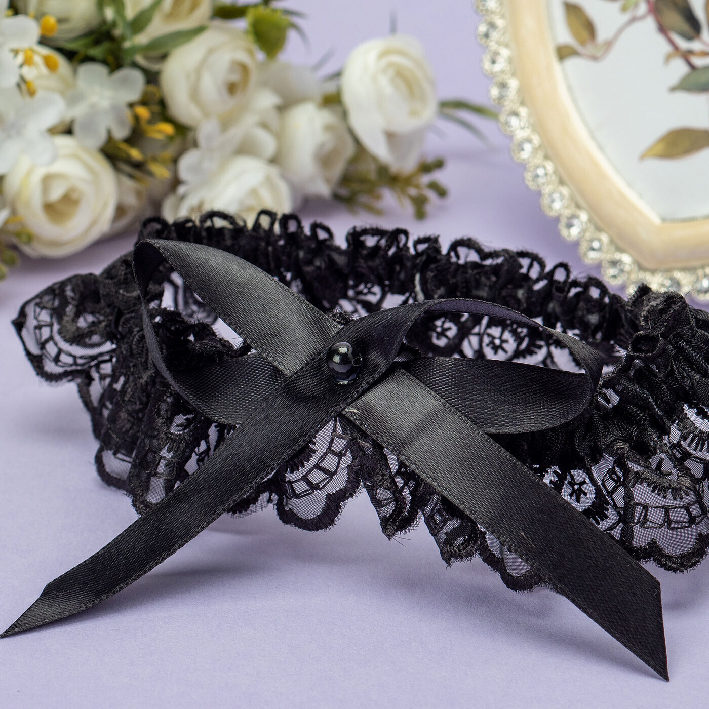 Дизайнерская подвязка для девушки на свадьбу, фотосессию и свидание из черного кружева с бантом из атласной ленты и темной бусиной