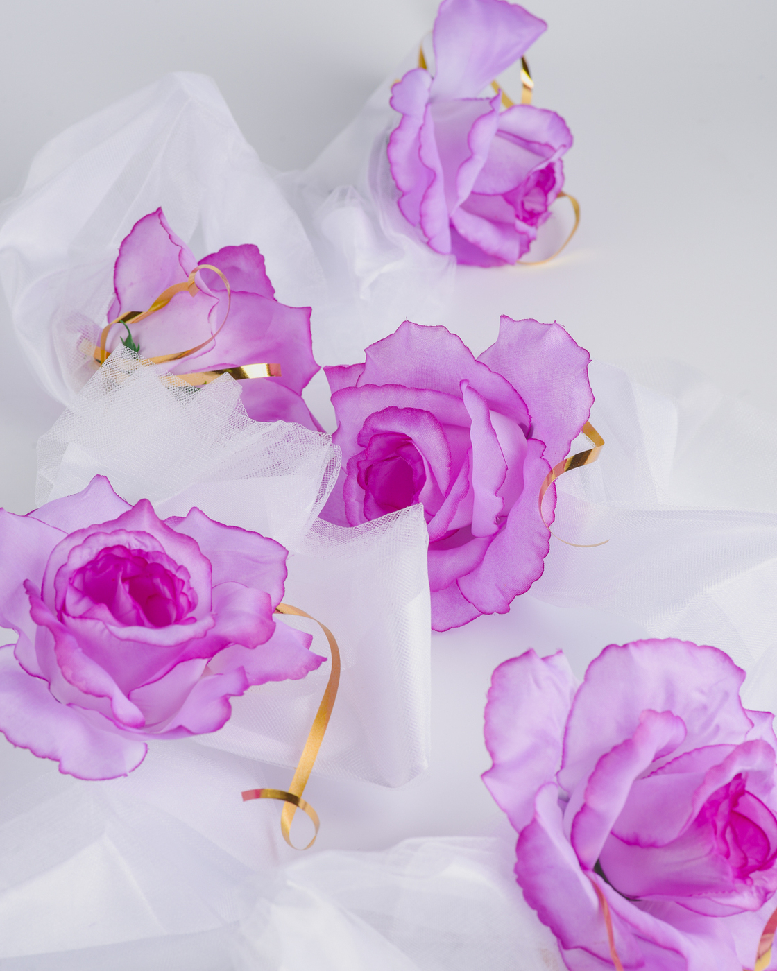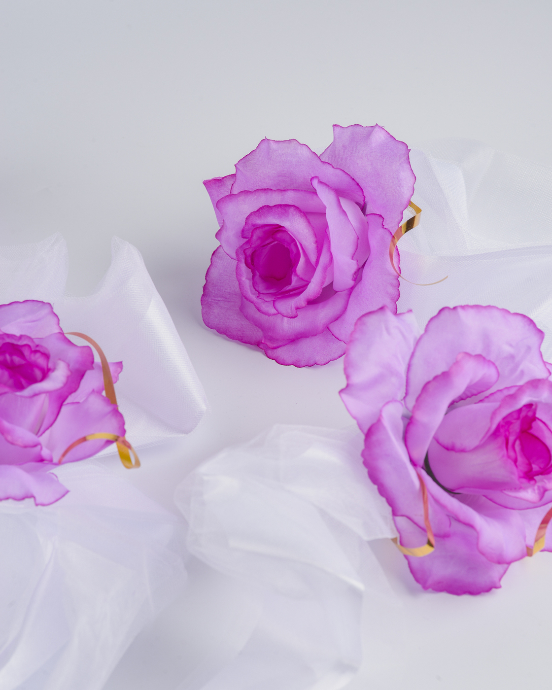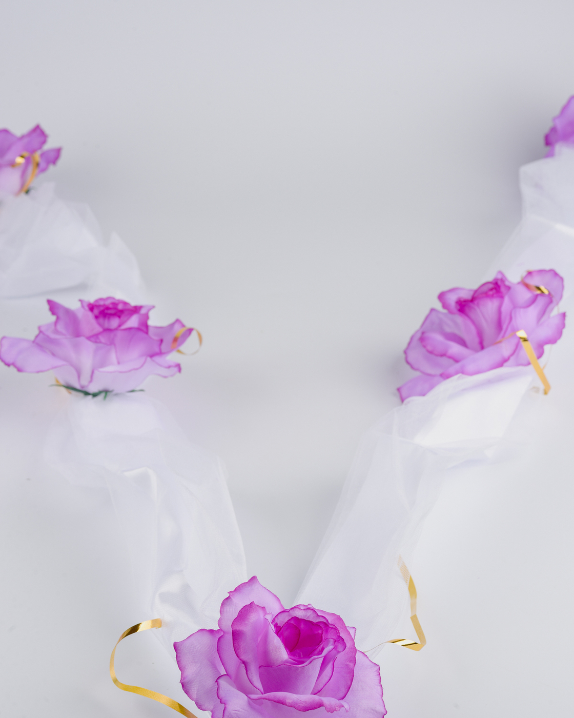 Белая лента на капот из фатина "Сиреневые розы" с цветами и листочками из текстиля - для декора свадебного кортежа молодых