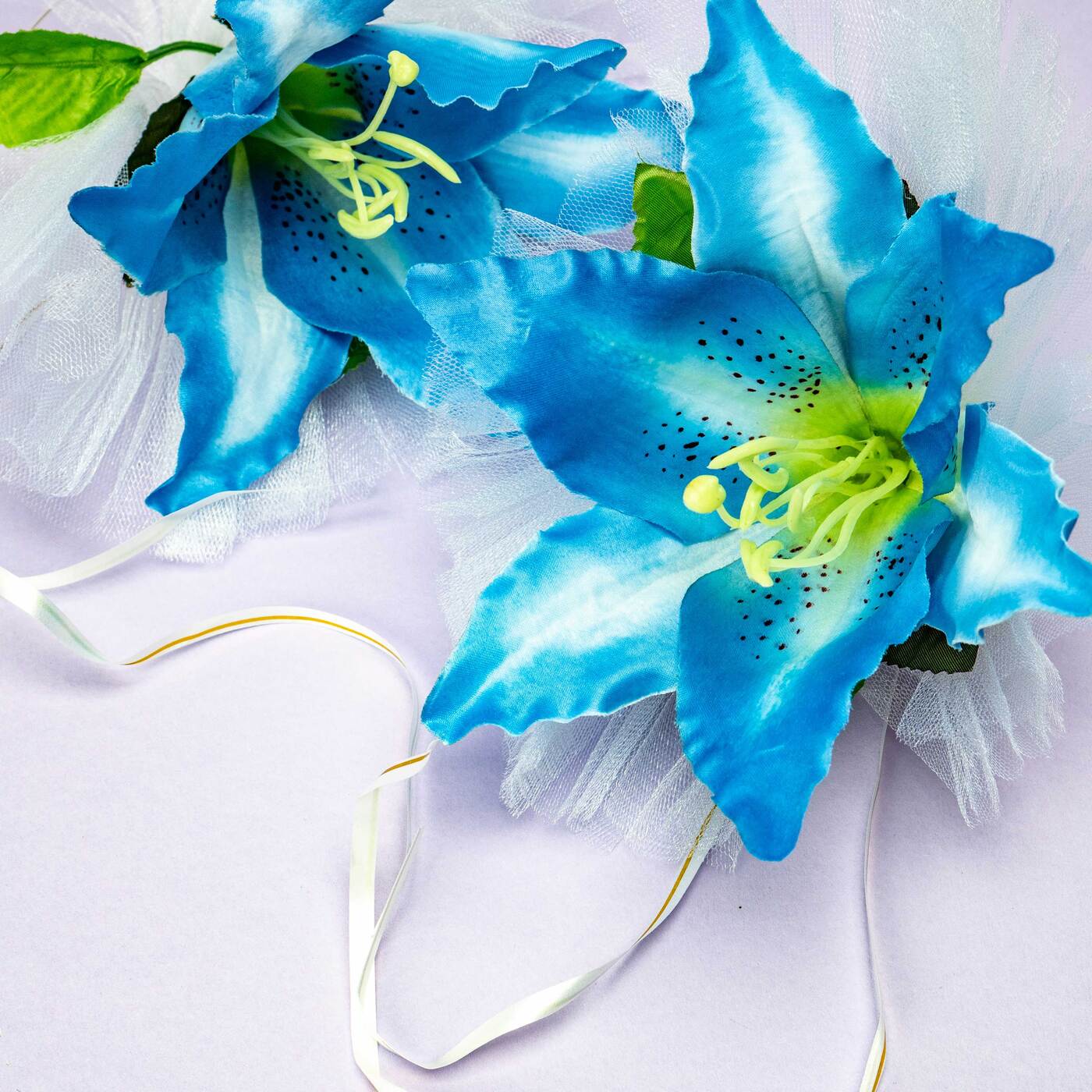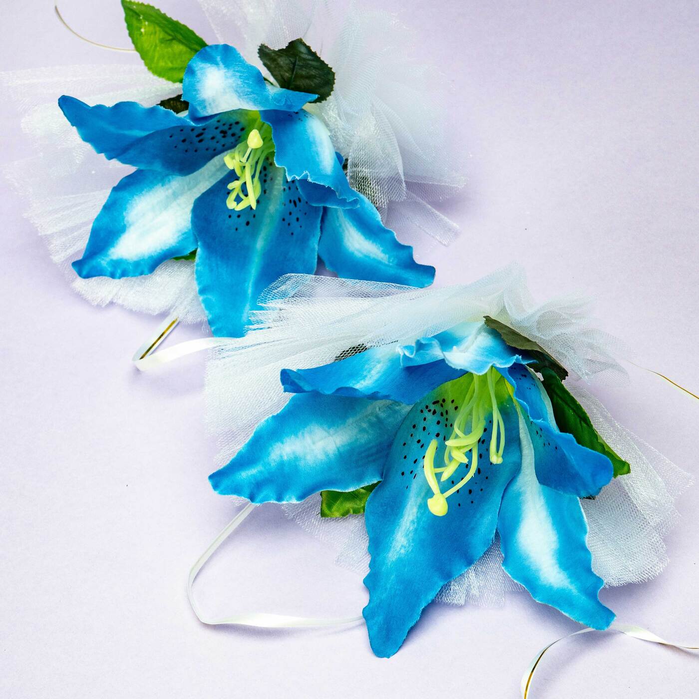 Украшение на машину на выписку из роддома и свадьбу - голубые банты на ручки или зеркала авто, из атласа и фатина, 25 см, 2 штуки