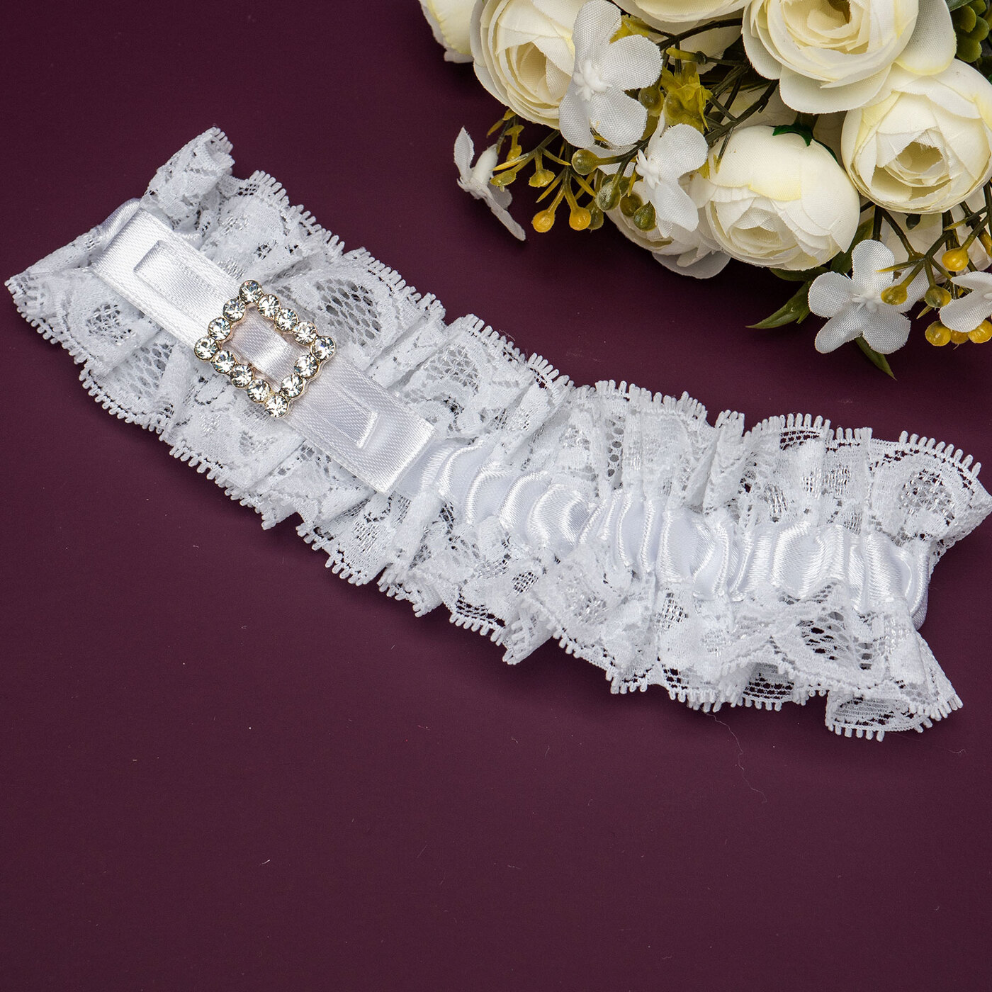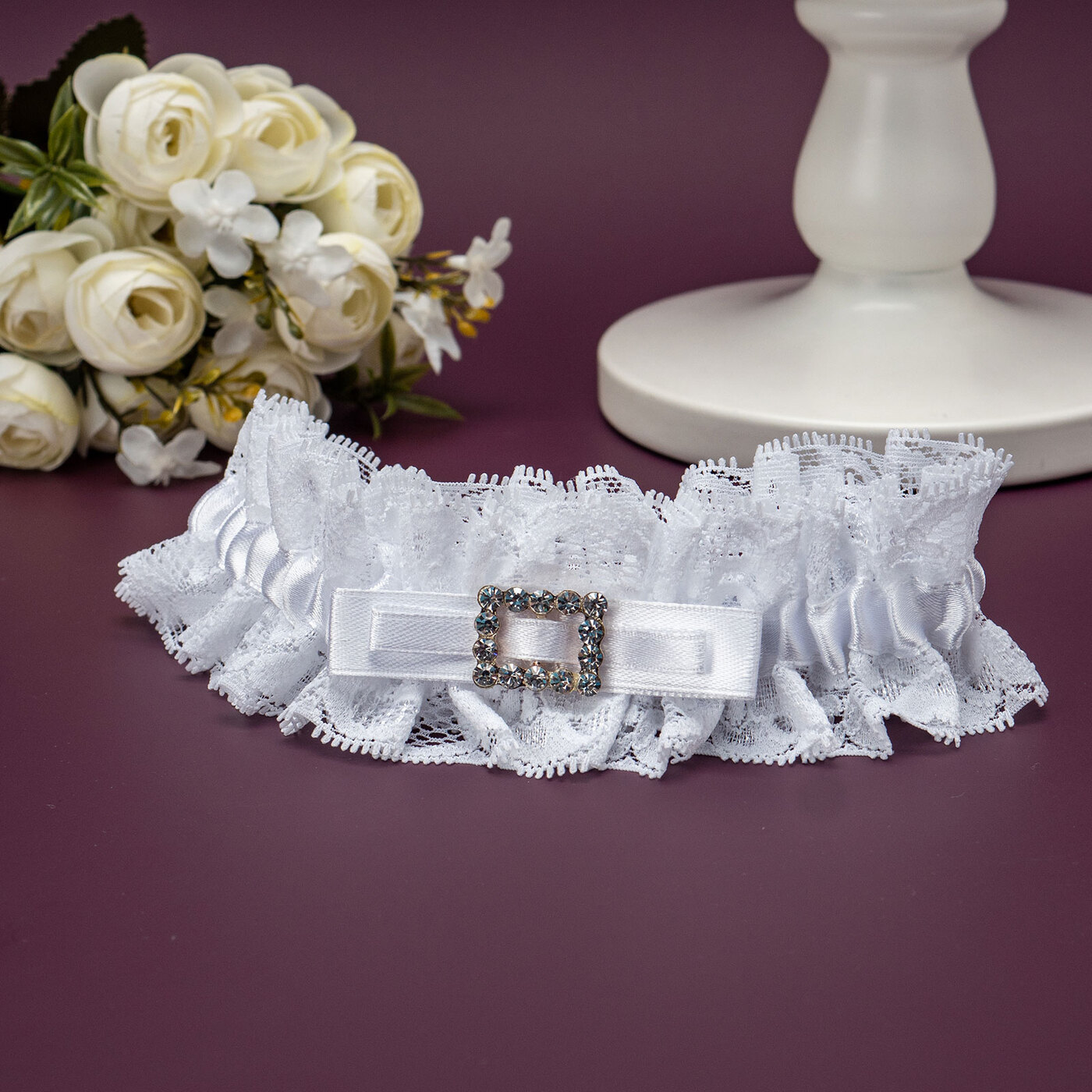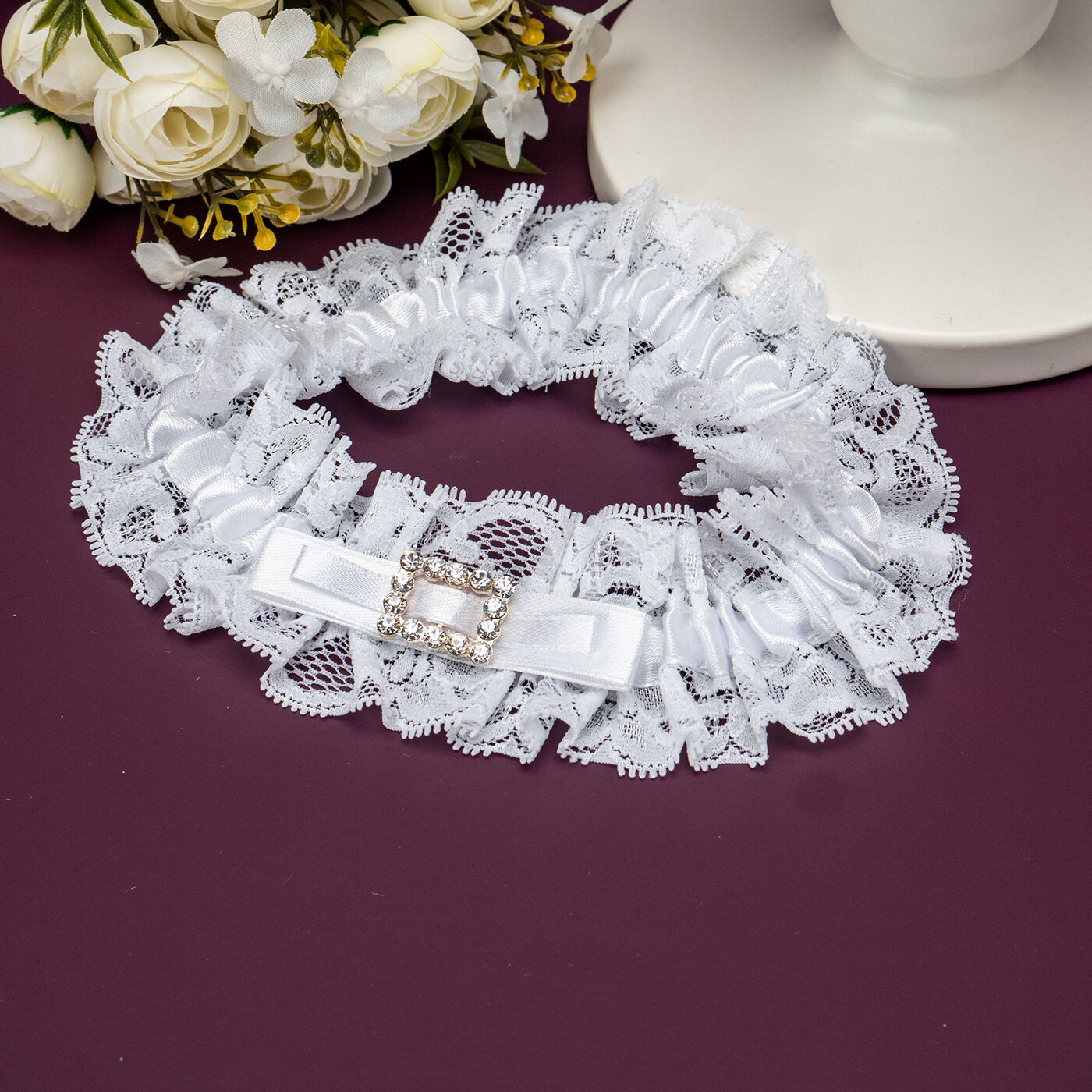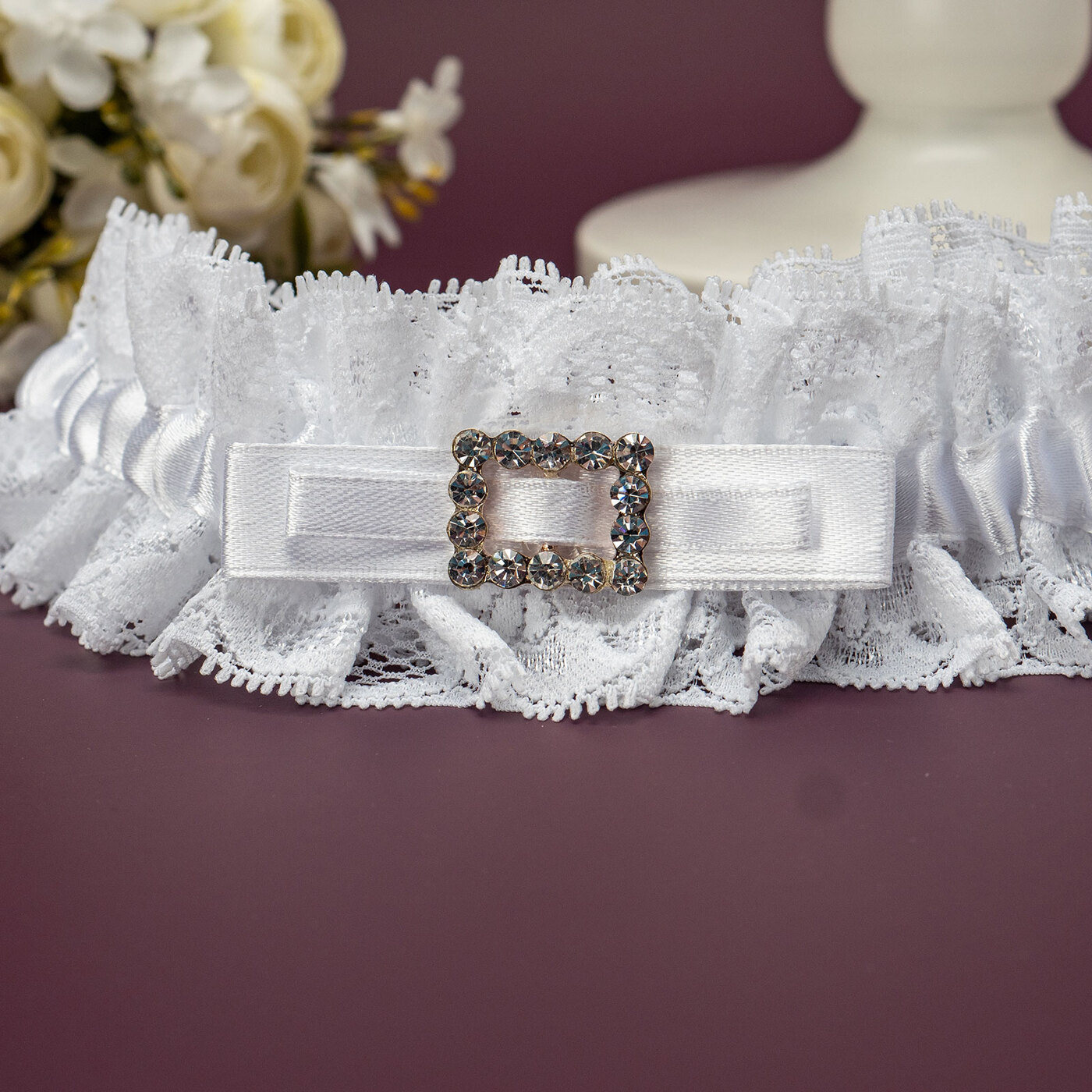 Кружевная подвязка для невесты на свадьбу "Адель" белого цвета с атласным бантом и брошью из сверкающих страз