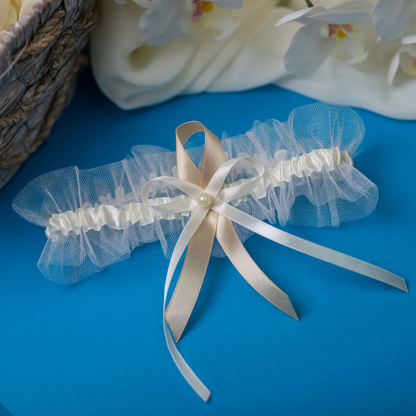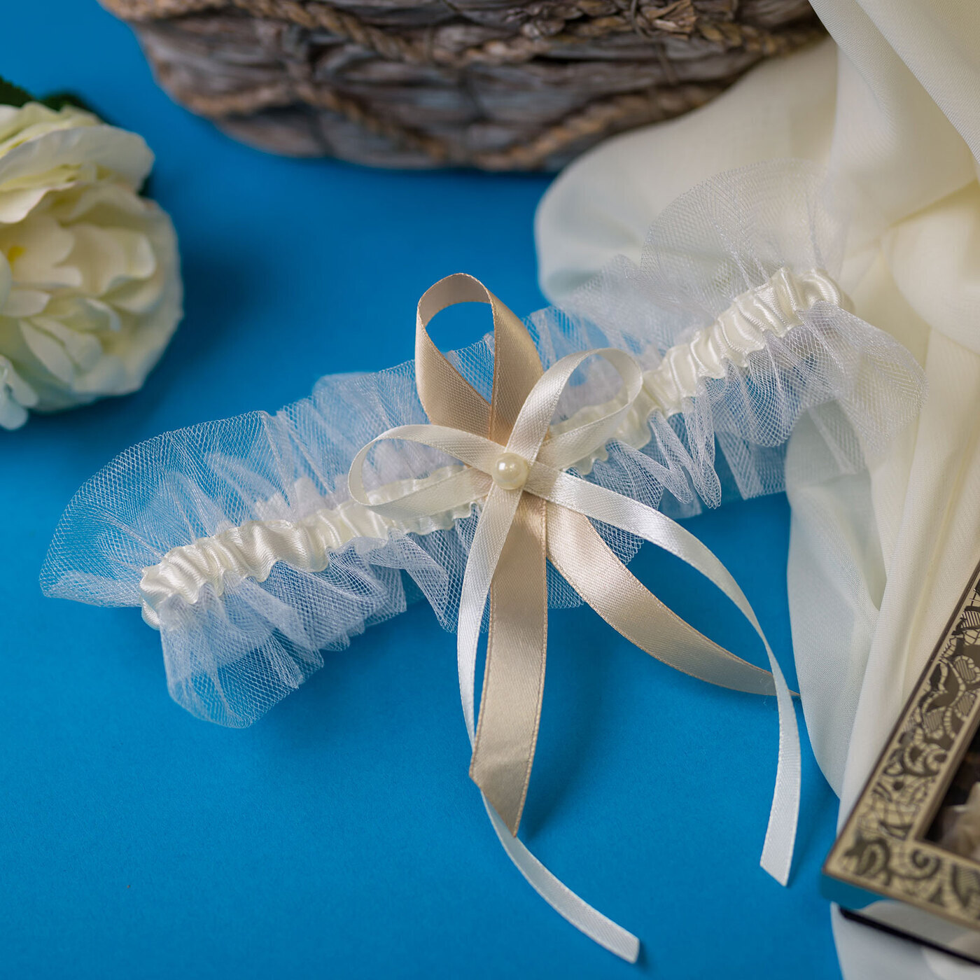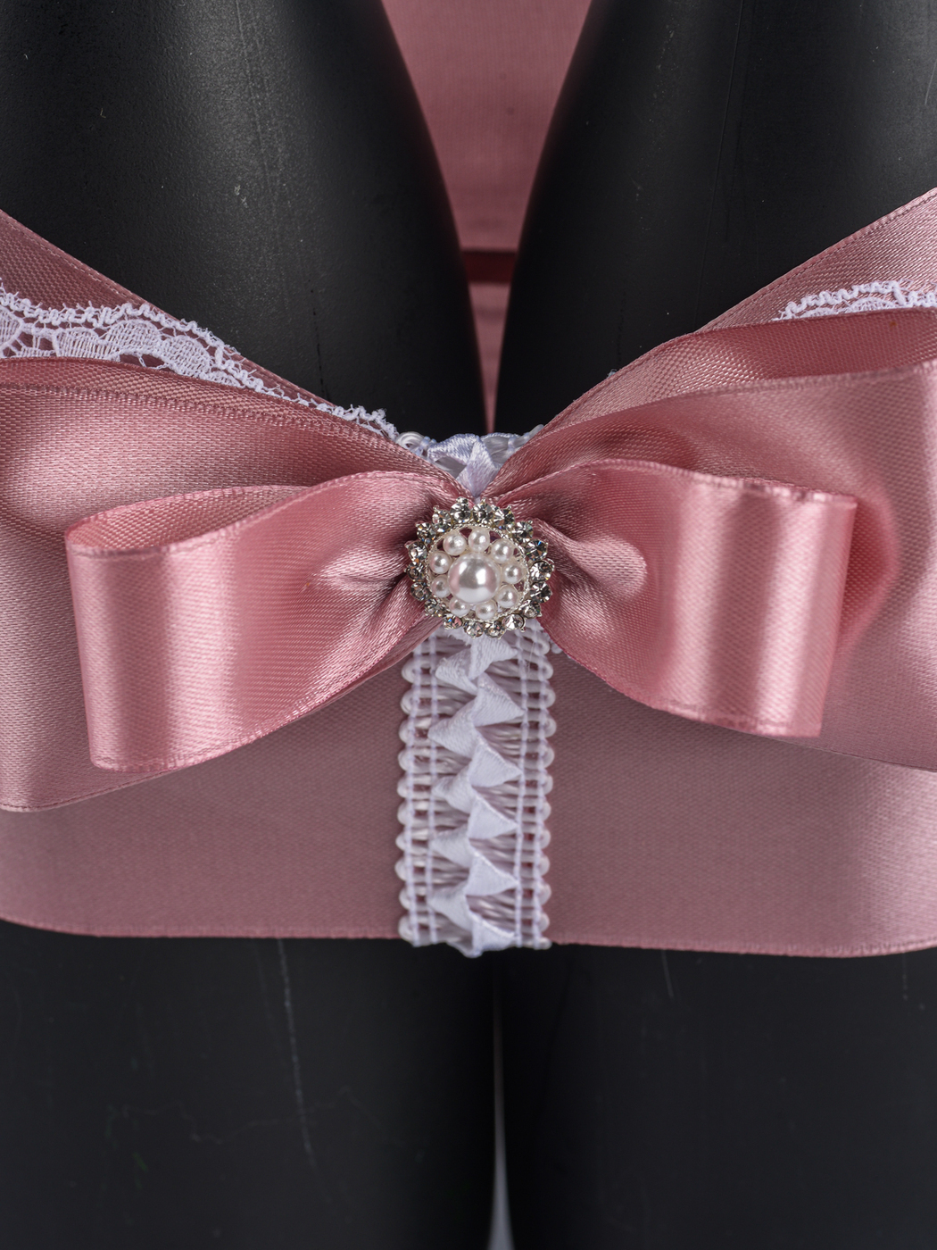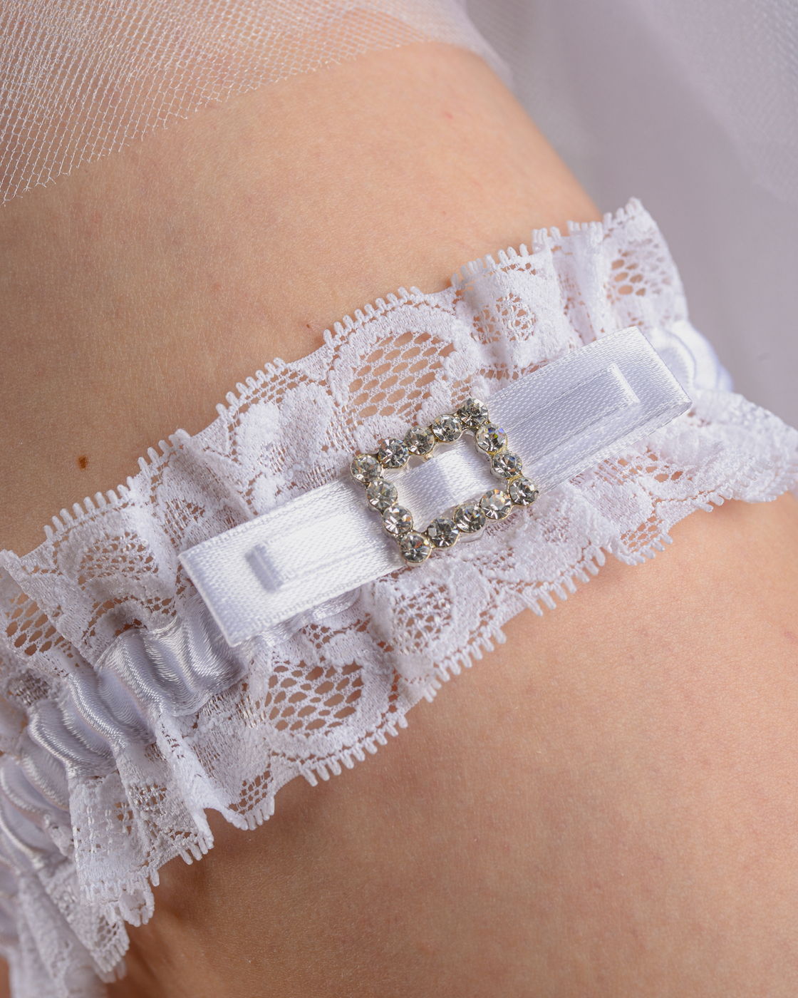 Кружевная подвязка для невесты на свадьбу "Адель" белого цвета с атласным бантом и брошью из сверкающих страз