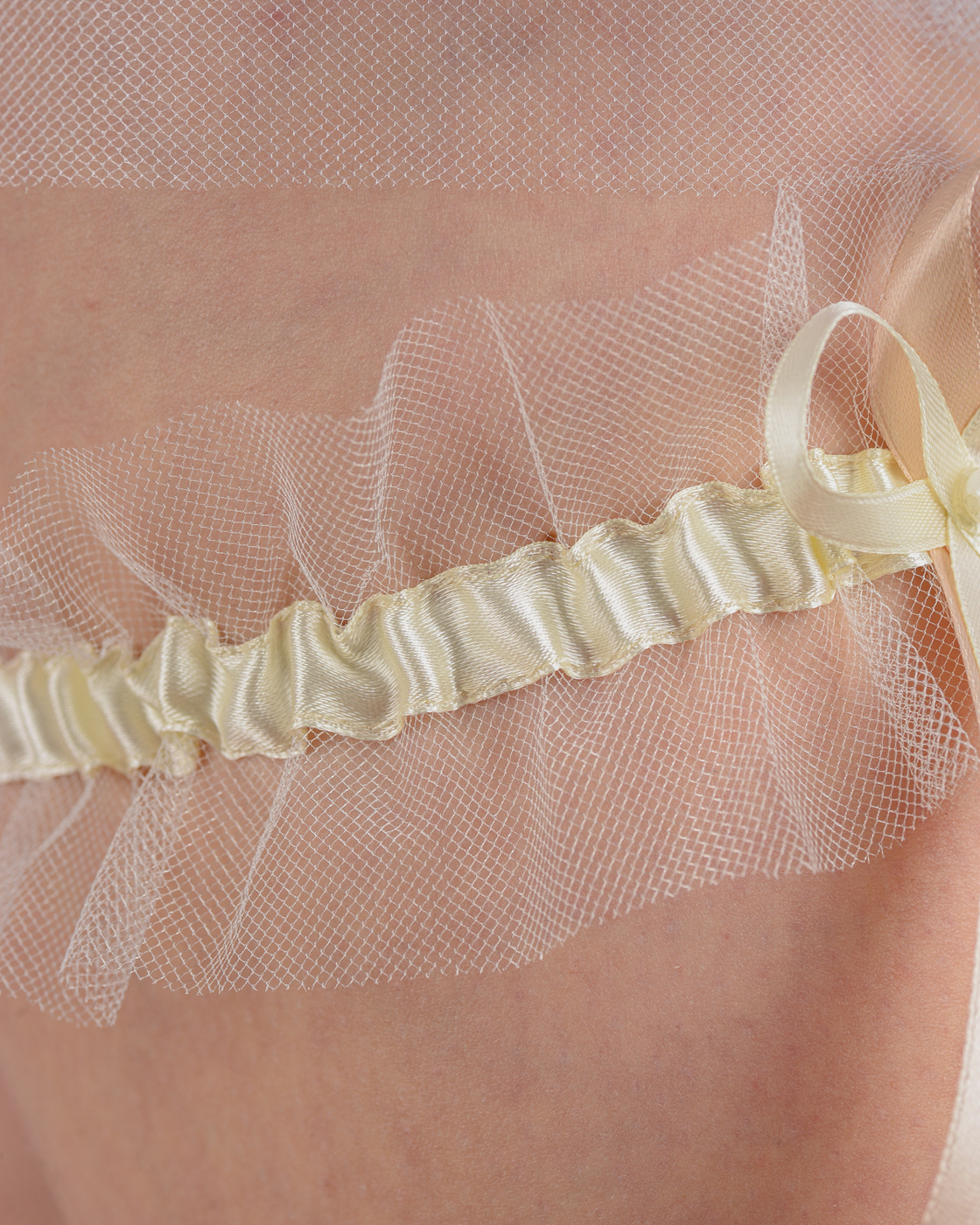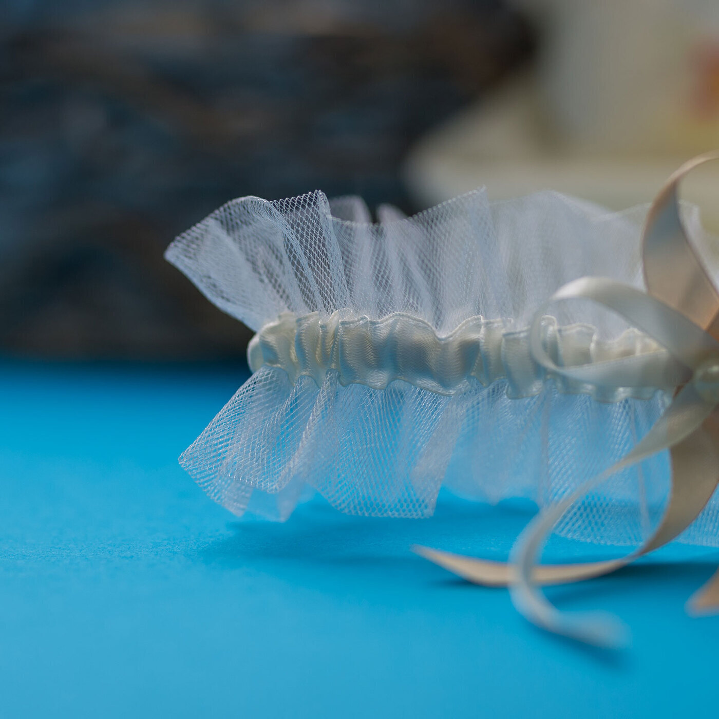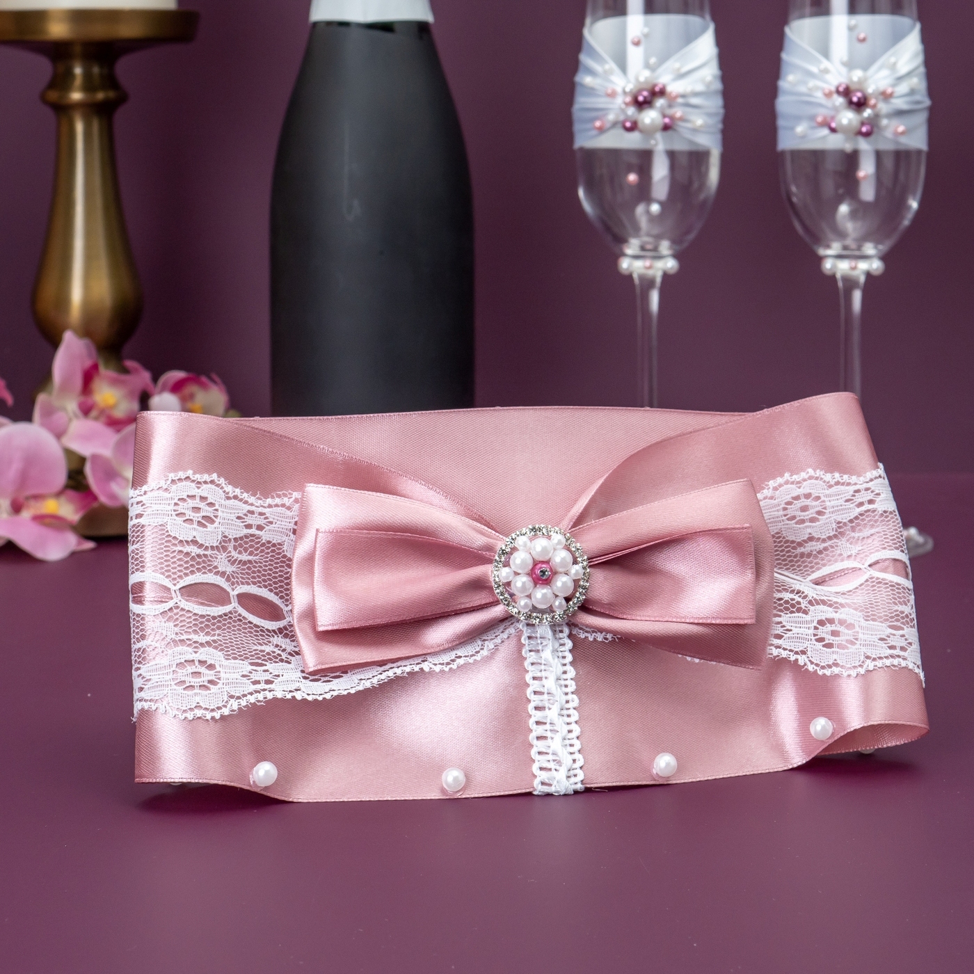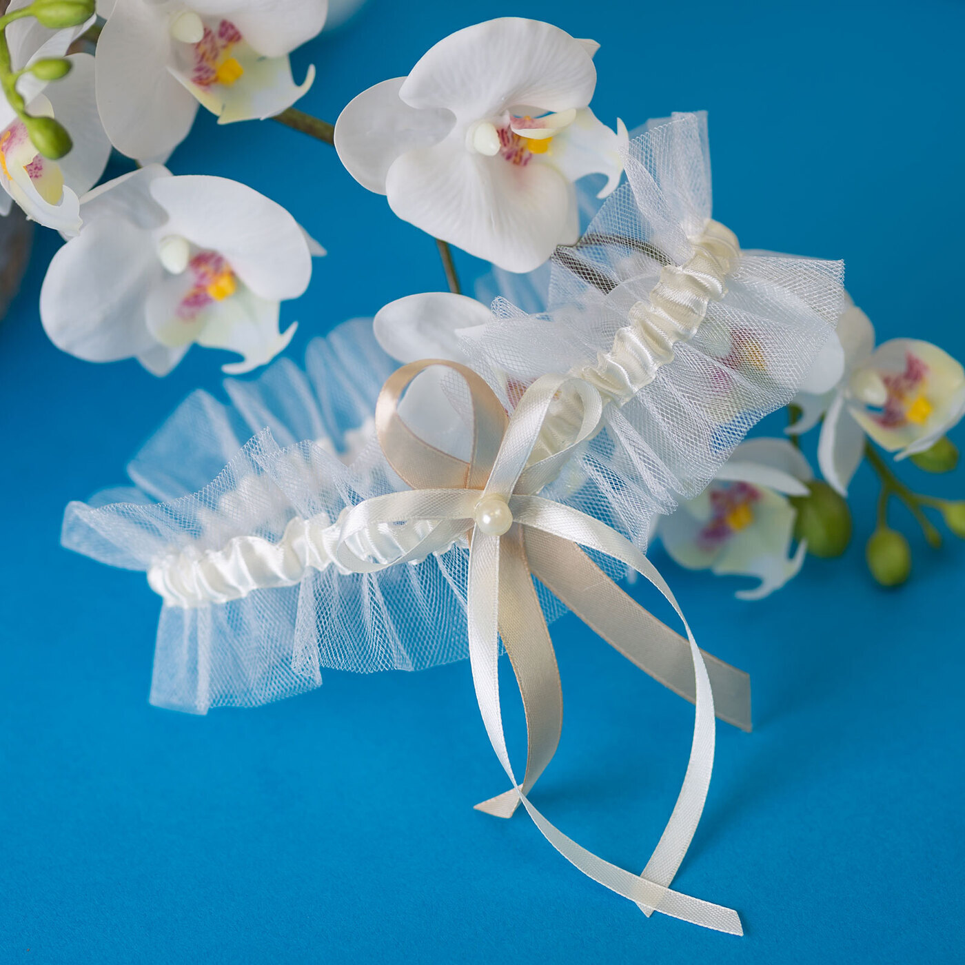 Кружевная подвязка для невесты на свадьбу "Адель" белого цвета с атласным бантом и брошью из сверкающих страз