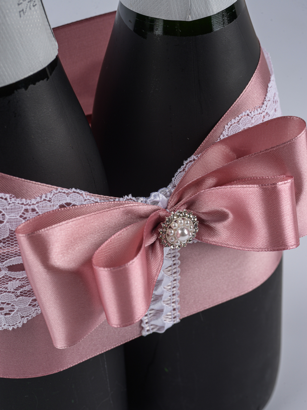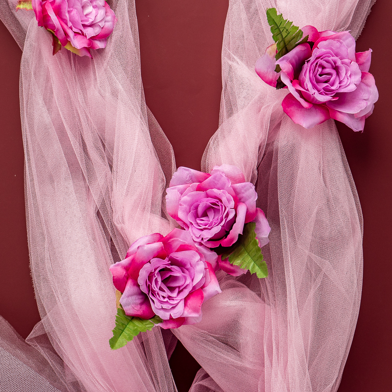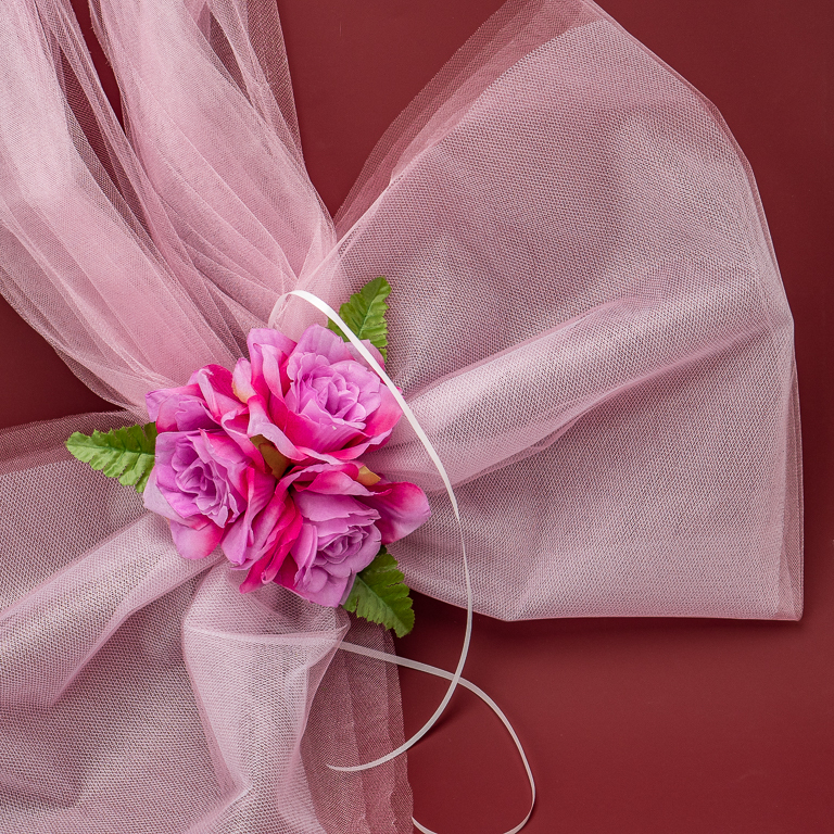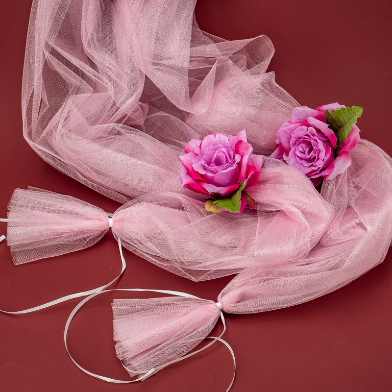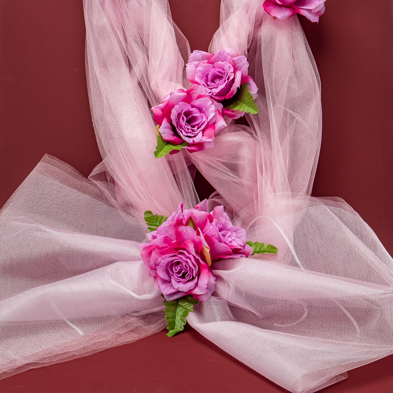 Розовая лента на свадебный лимузин из воздушного фатина с объемным бантом, сиреневыми цветами и зелеными листочками