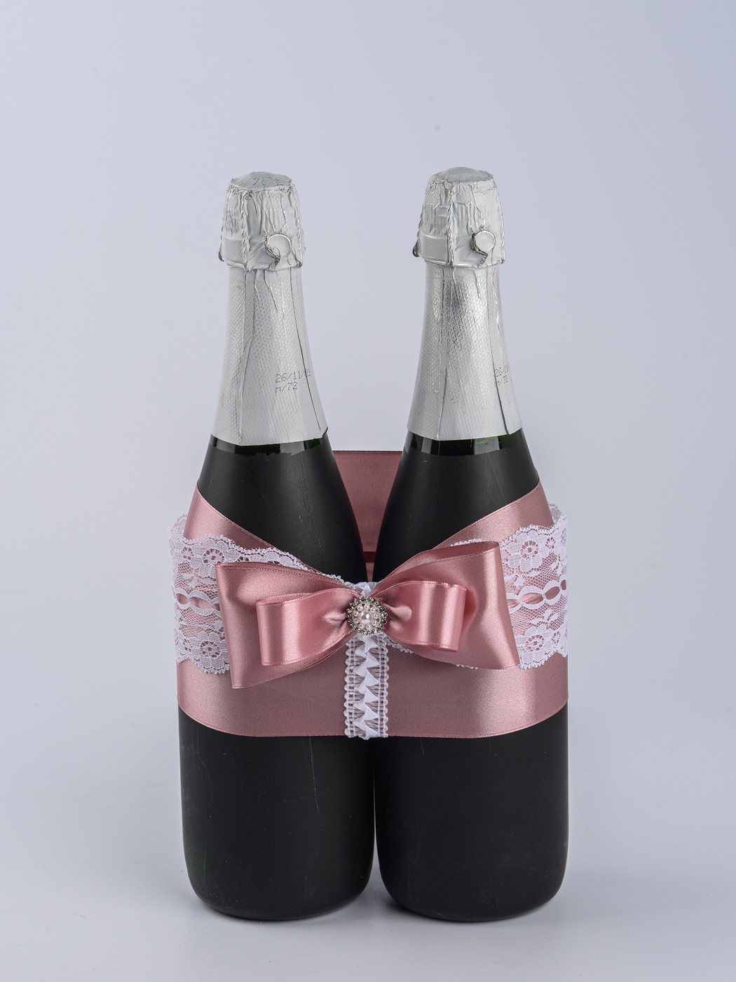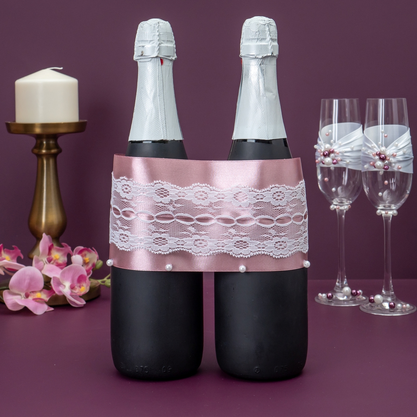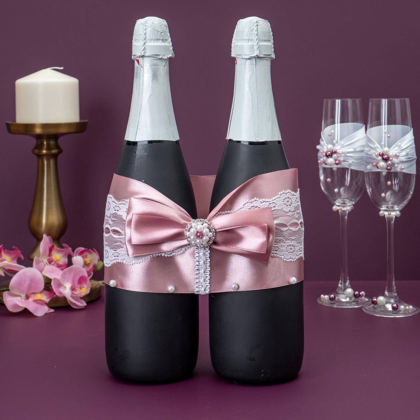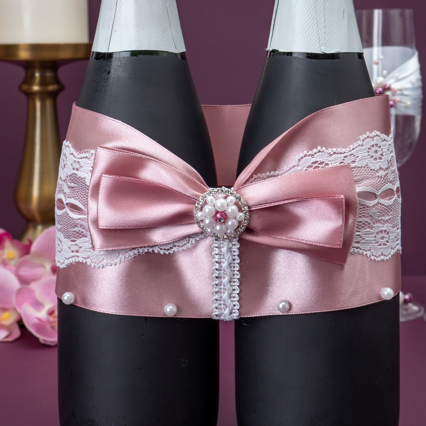 Розовая лента на свадебный лимузин из воздушного фатина с объемным бантом, сиреневыми цветами и зелеными листочками