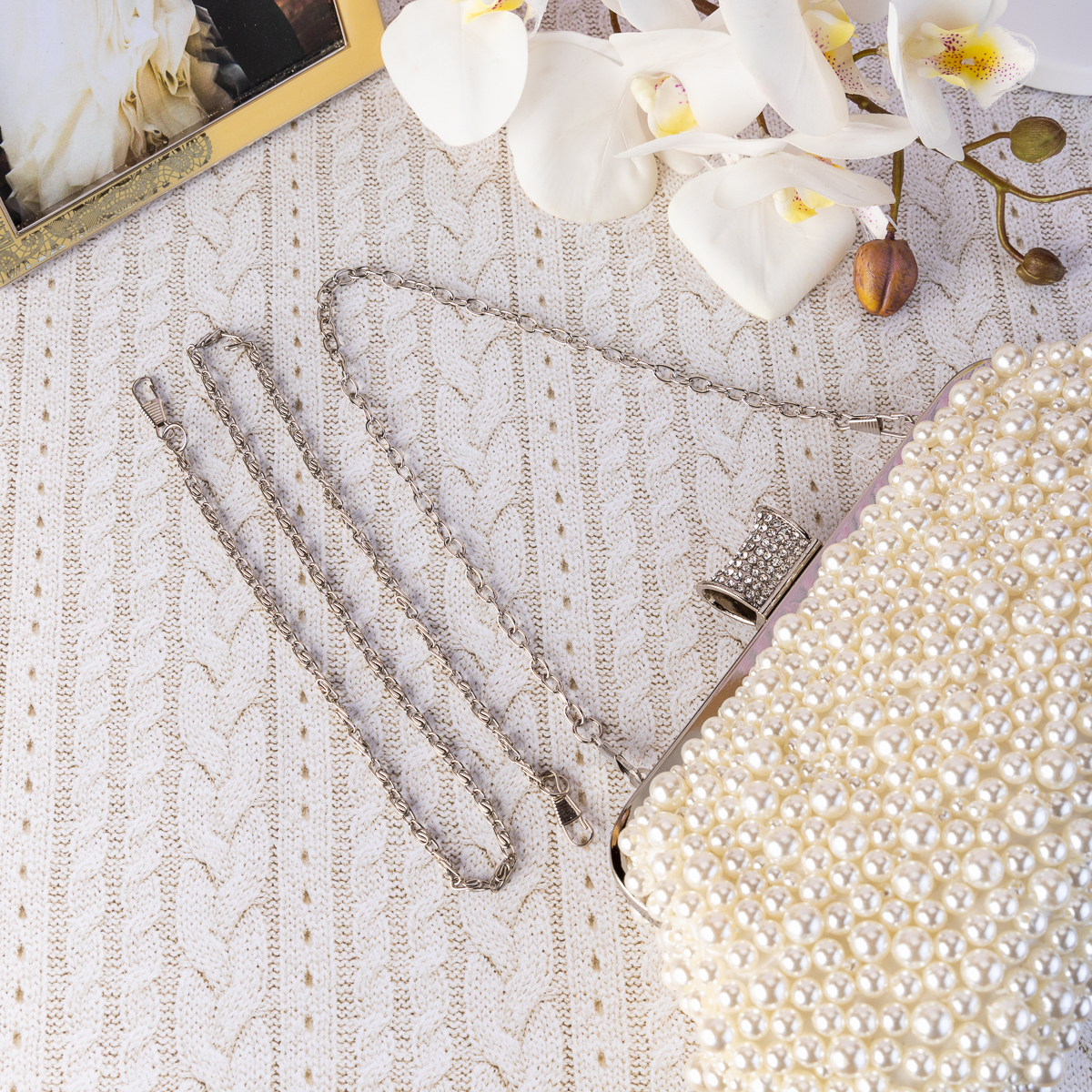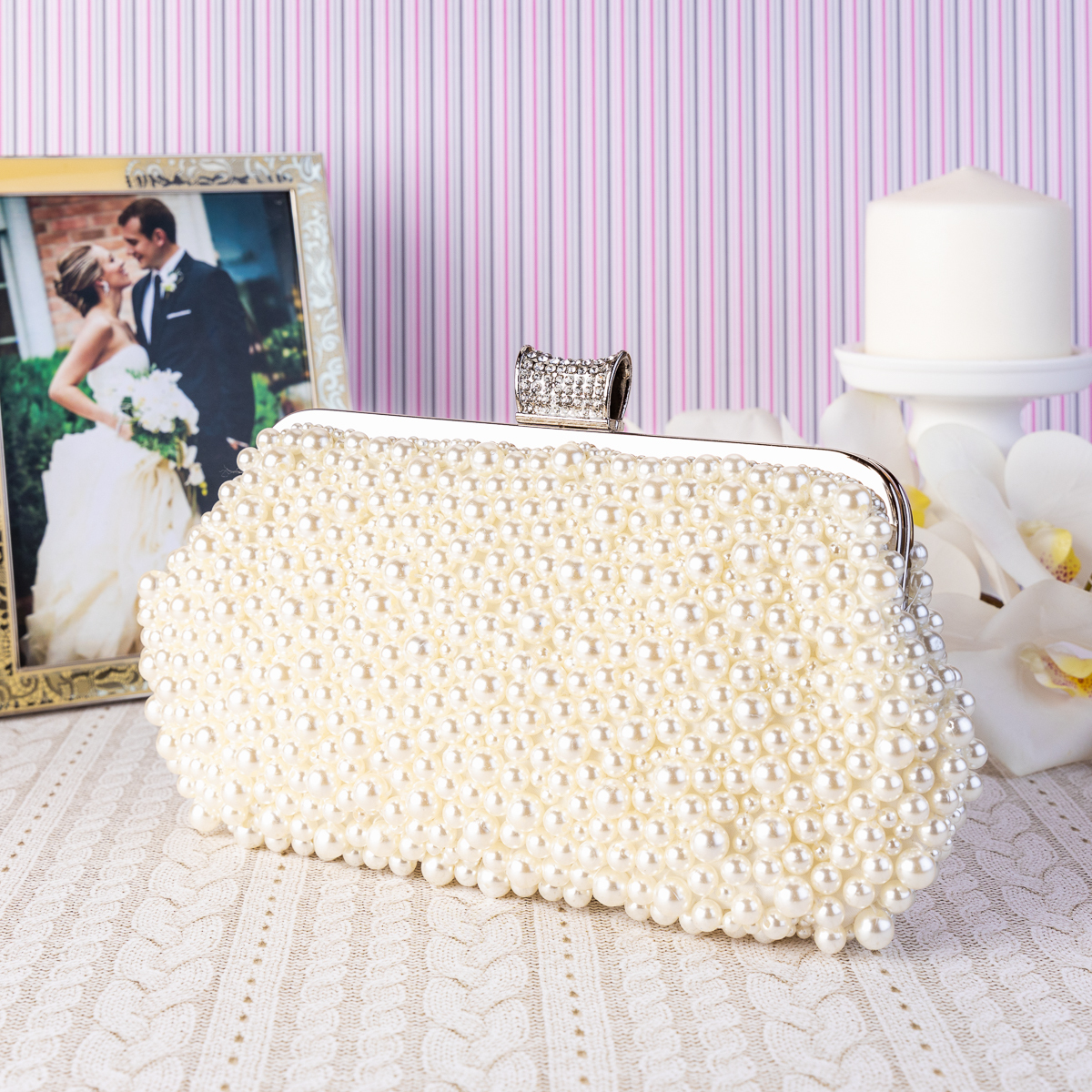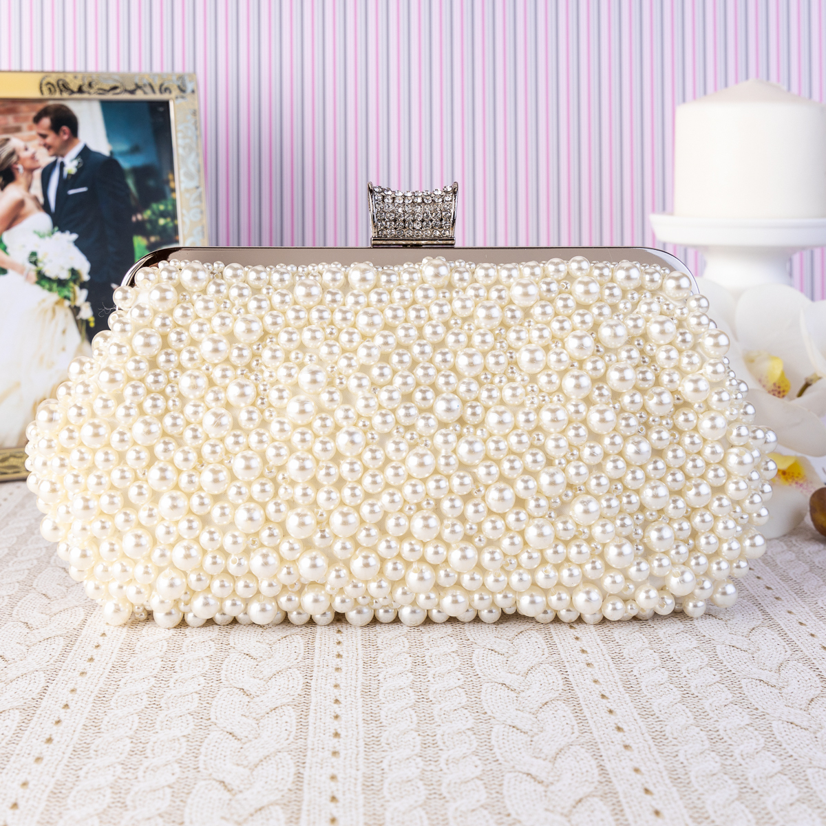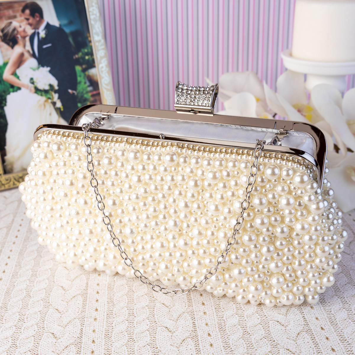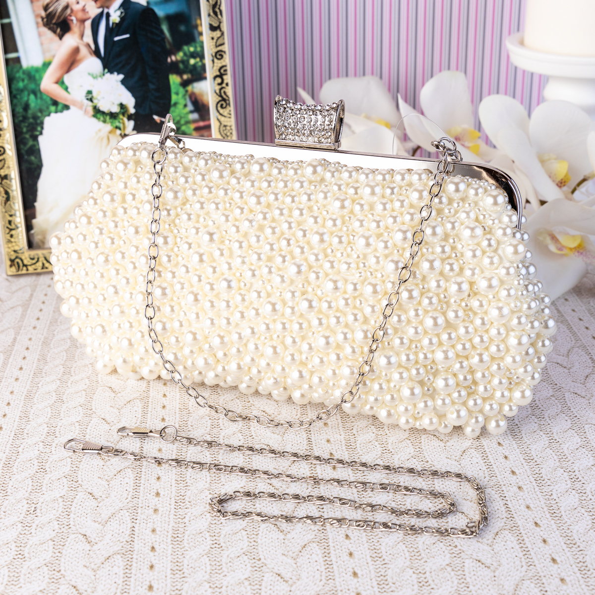 Клатч для невесты на свадьбу айвори с жемчужными бусинами и клипсой со сверкающими кристаллами